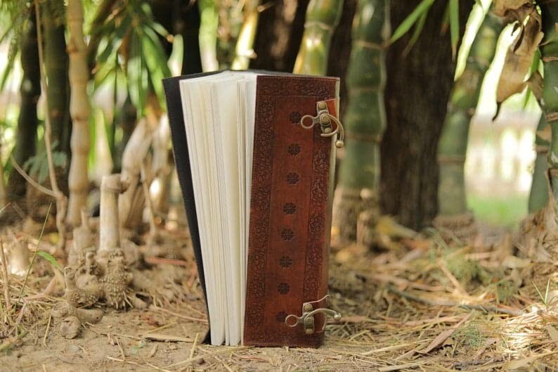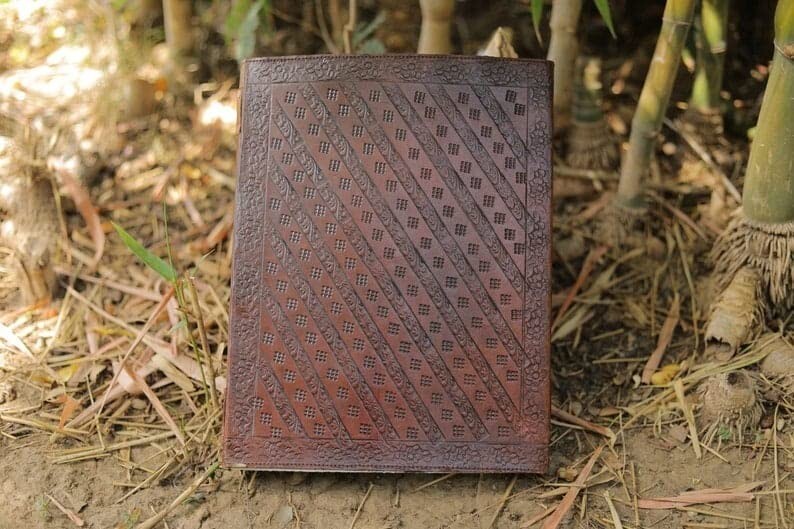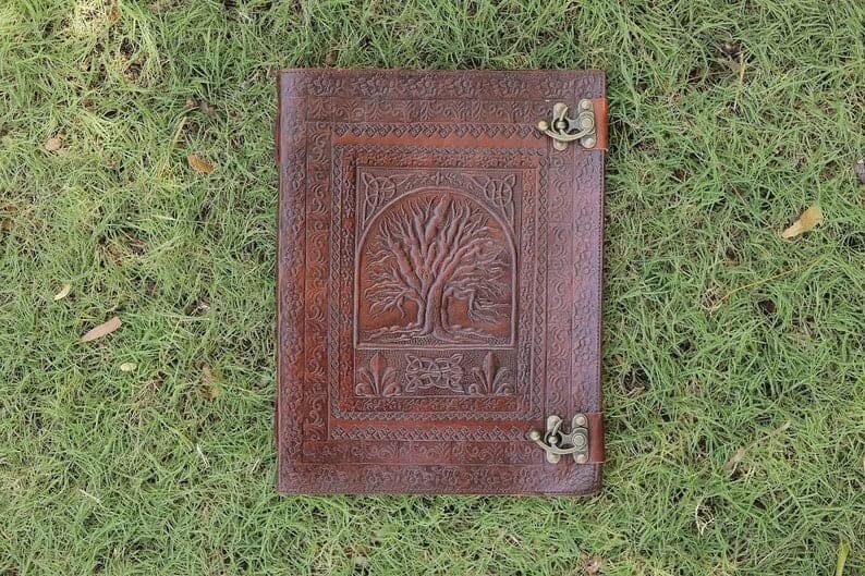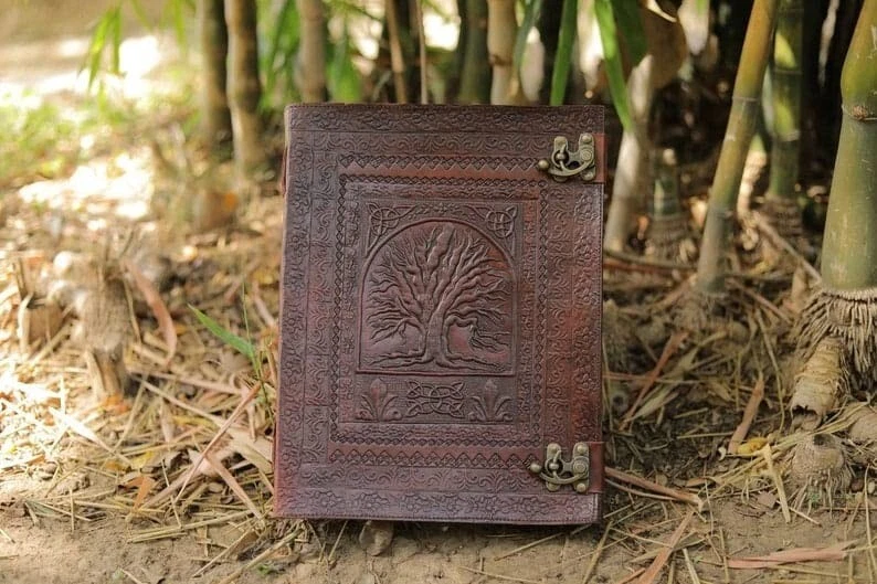 Style - Tree of life leather journal Color - Antique/black/Brown Page - 120 Sheets ( 240 pages counting both Side ) Lock - Brass C-lock Size - 10 x 13 inch / 7 x 10 inch This stunning leather journal is adaptable to use as a memory journal, sketch book, manuscript book etc. This embossing journal is adorned with detailed leather. It is perfect for classic calligraphy and scripting - a true conversation piece. Indulge yourself to write poetry, spill your heart and soul out onto the handmade fiber pages or use as Guest book / Instagram Photo book. Guest book: The blank handmade paper is very unique and perfect for guest/wedding book. Instagram Photo Book: It can also be used to show off your favorite Instagram images in this handmade leather book by using acid-free scrape booking adhesive or double-sided tape. Overall Length: 13 by 10 inches Pages: 200 pages (counting both sides) Paper Type: Handmade paper Cover: Genuine Cow Hide Leather with Leather Metal Closer Design: Detailed Tree of Life Embossed and leather Whether you’re a mom balancing a family with tons of appointments, a business professional who needs to remember details meetings, or you just want to keep your notes and thoughts collected, this Leather Journal comes with all the style, comfort, and versatility you need to be at your best The leather is produced using traditional methods which allows it to retain its character. This means that each journal is unique and comes with its own set of beautiful creases, bumps and marks that develop with age into something truly special. The leather is protected with natural oils to give it a lovely rich finish .