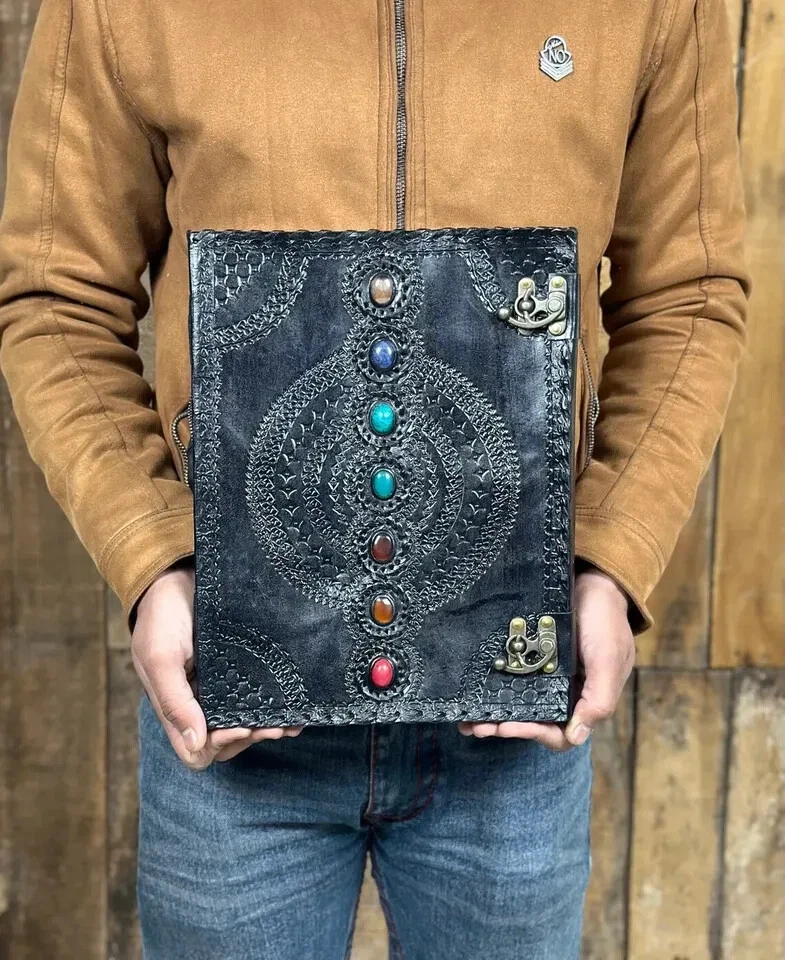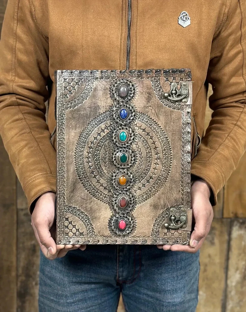 Extra Large Leather Journal Seven Stone Embossed Notebook With Blank Papers Personal Journal For Writing Mother's Day Gift For Her Gift For Mothers Handmade leather journal with seven different stone ( Semi Precious ) embedded and aligned in the center of the book. Size 10X7X3 Brown color extra large journal provided with 2 brass lock for enclose at corner edge for enhancing the distressed look of journal. Hand embossed notebook chakra design around all the 7 different stone which give a detailed fine handmade look to journal. Amazing embossed done on the front and the back side. Provided with 610 Sheets of paper ( pages counting on the both side ) Perfect for Gifts - Suitable for men or women this blank paper personal journal is a perfect gift for mother, writers, your loved once , family members, relatives, occasions, etc. This amazing journal with lock can be used as a handmade journal, refillable journal, embossed journal, personal journal, stone journal, spell book, journal with stones, book of shadows, etc. We guarantee high quality products and unique design. All made especially for you.