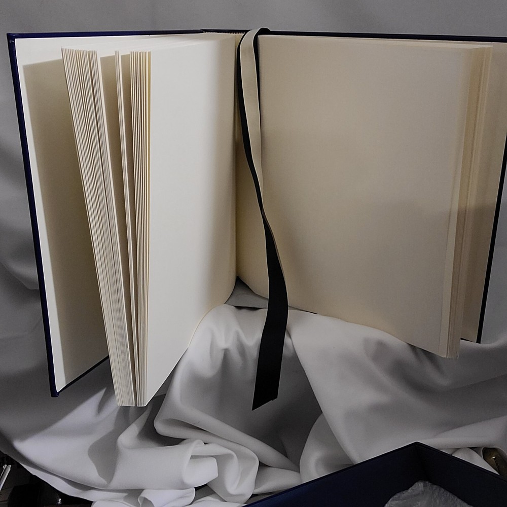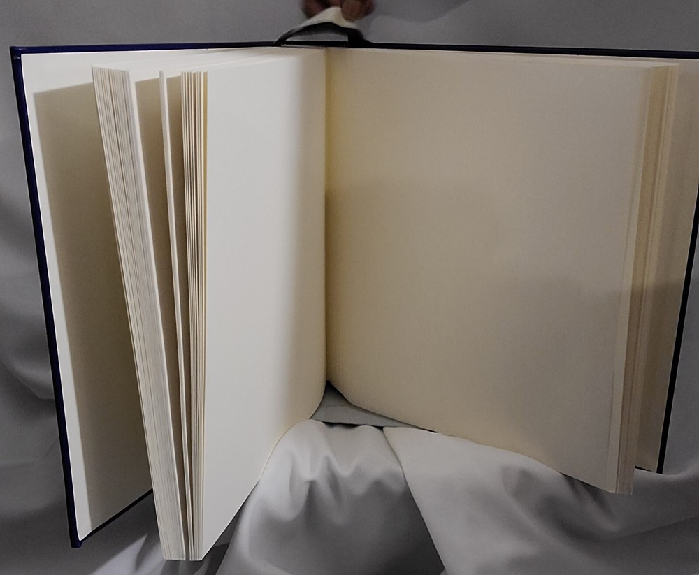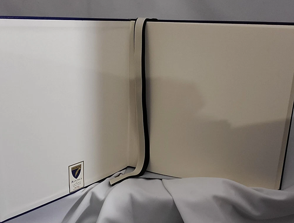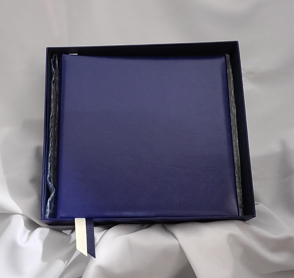 12 x 12 inch Royal-Blue leather binding Aspinal of London Scrapbook. Excellent like new condition. Original Box. Royal-Blue and White Cloth Bookmarker Archival Quality Pages with tissue-like pages in- between each page.