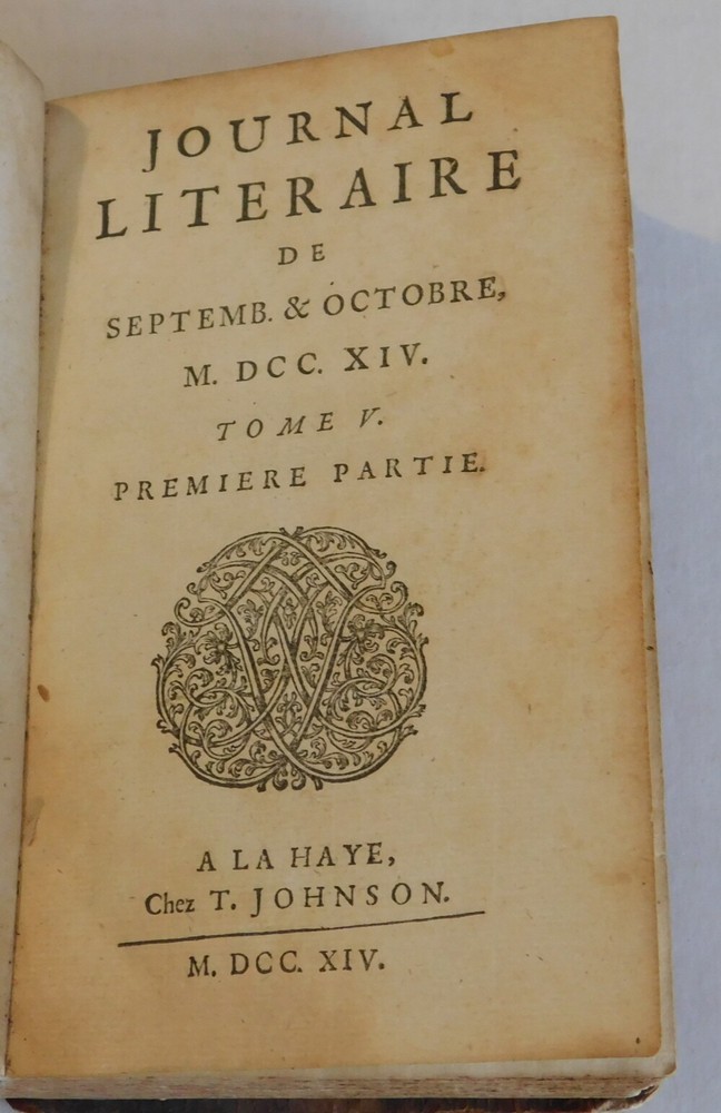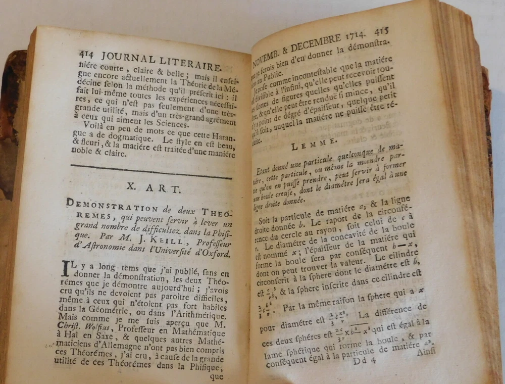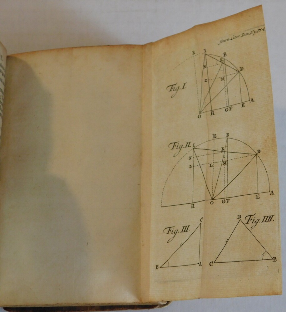 ( Nieuwentyt, Bernard [1654-1718]; Keill, John [1671-1721]). ["NOUVEL USAGE DES TABLES DES SINUS" by Bernard Nieuwentyt; and "DEMONSTRATION DE DEUX THEOREMES" by John Keill] Published in: JOURNAL LITERAIRE de Septemb. & Octobre M.DCC.XIV. Tome V. A la Haye [The Hague]: Chez T. Johnson, 1714. Octavo, 6-1/8 inches high by 4 inches wide. Bound in vintage tan calf. The front cover is detached. The covers are heavily rubbed, scuffed and stained with wear to the edges and corners and the spine has perished and is thus mostly lacking. [iv], 456 & [12] pages, illustrated with 2 folding plates, including a large plate for an article on the Apotheosis of Homer, depicting a marble relief by Archelaus of Priene. There is some occasional light minor soiling and staining throughout. The top edge of the last of the index is creased and there is a short tear to the inner edge at the fold of the large folding plate. The frontispiece is lacking, else the book collates as complete. First edition. The "Journal Literaire" was published by Thomas Johnson, an Englishman who was living in The Hague. It was edited by Prosper Marchand [1678-1756]. among others. Of note is the inclusion of the first publication of Bernard Nieuwentyt's "Nouvel Usage des Tables des Sinus: ou moyen de s'en servir sans qu'il soit necessaire de multiplier ou de diviser" , illustrated with a folding plate illustrating the trigonometric aspects of sine & cosine functions. The article is signed "B.N." The Dutch philosopher, mathematician and physician Bernard Nieuwentyt (1654-1718) was also a theologian and a magistrate who held office as mayor of Purmerend. A follower of Descartes, he opposed Spinoza and was involved in controversy with Liebniz regarding the foundations of infinitesimal calculus. Also noteworthy is the inclusion of John Keill's article "Demonstration de deux Theoremes, qui peuvent servir a lever un grand nombre de difficultez dans la Phisique". Here identified as a professor of astronomy, the Scottish mathematician, natural philosopher, and cryptographer John Keill (1671-1721) was a significant defender of Isaac Newton. Appointed a lecturer of experimental philosophy at Hart Hall, Keill lectured on Newton's laws of motion, the principles of hydrostatics and optics, and on light and colors. As an astronomer, he published an "Examination of Dr. Burnet's Theory of the Earth", taking to task Burnet, Descartes, Spinoza, Hobbes and Malebranche. Taking on the role of Newton's chief defender, he later became embroiled in the controversy regarding Leibniz's alleged plagiarisation of Newton's calculus. TERMS: Shipping charges are calculated based on the total packed weight of this item. New York State residents will be assessed and charged the relevant sales tax. Postage on foreign orders will be assessed and billed at full value. You may request Express Mail or Air Mail service at additional charge. All items are guaranteed authentic and as described. PLEASE E-MAIL FOR EXACT EXPRESS MAIL OR FOREIGN SHIPPING CHARGES! We accept PayPal. Be sure to add me to your favorites list ! Check out my other items !