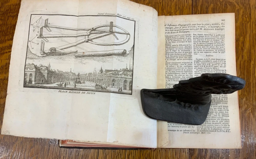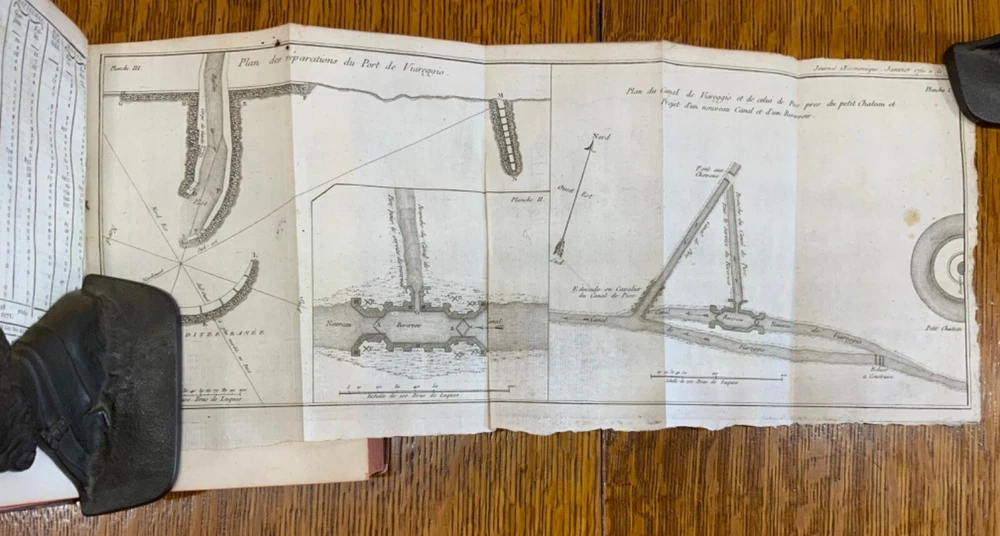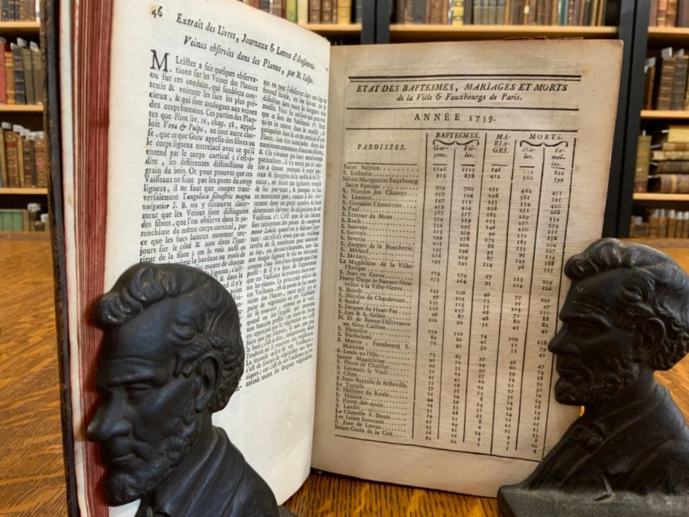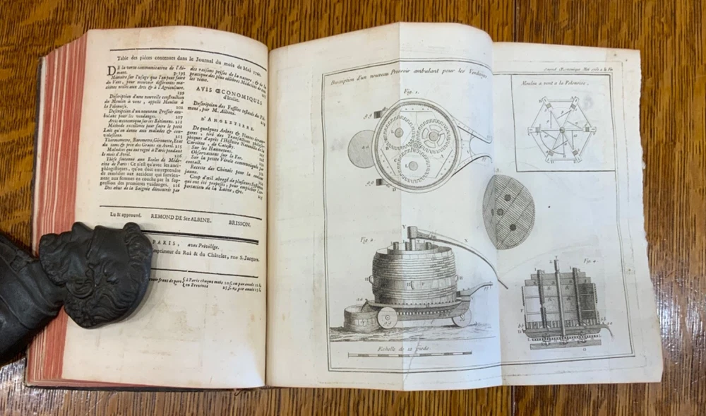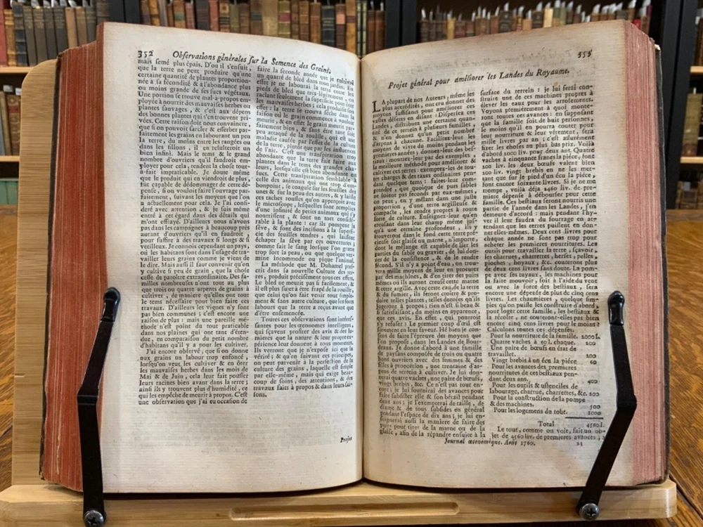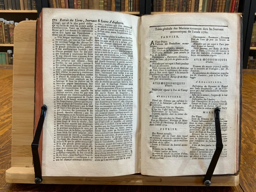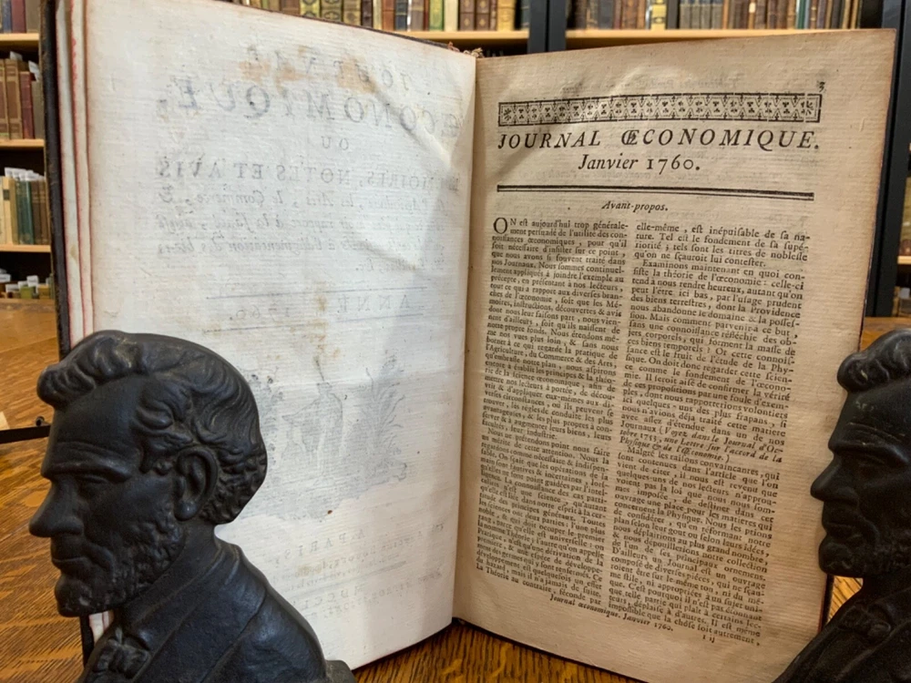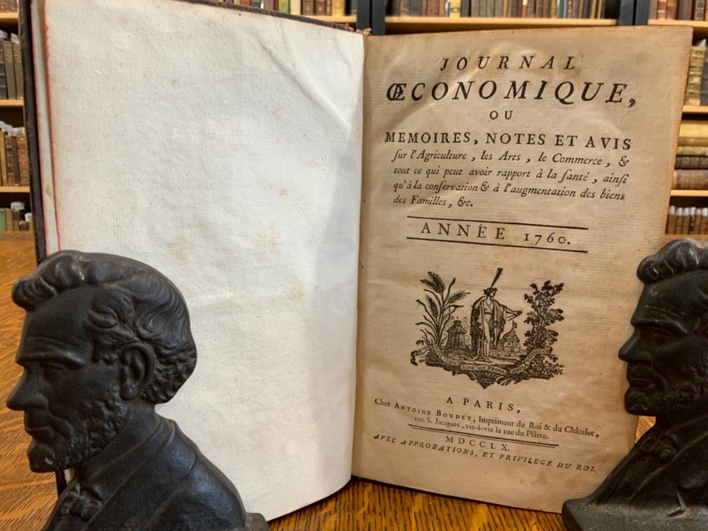 Journal Economique, ou Memoires, Notes et Avis sur l’Agriculture, les Arts, le Commerce, & tout ce qui peut avoirdupois rapport a la sante, Winfield qu’a la conservation & a l’augmentation des biens des Familles & c. Vol III, Chez Antoinne Boudet, Paris, 1760, 570 pages, full leather, 8vo. In fair condition. Full leather boards normally scuffed at edges and worn/bumped at corners. Head of spine chipped at front hinge, binding exposed. Tail of spine rubbed/scuffed. Gilt lettering and deco moderately dulled, but legible. Edges of text-block painted red. Light water or tea dampness staining staining at bottom corner of title page. Normal toning throughout text-block. Some sparse age-stains. Binding tight and intact. Please see photos and ask questions, if any, before purchasing. Antoine Chrétien Boudet was born and baptized on June 7, 1715 in Lyon. He was the last son of Antoine Boudet and Jeanne Joban married on January 8, 1705. His father, a Lyon merchant-bookseller, established rue Mercière “A la Croix d'Or”, had joined the Society of Booksellers; he was a Brother of the Trinity. Boudet the father died at the age of 62 on August 24, 1719. The inventory of his bookstore collection took place on August 29, 1719. His widow must have succeeded him: in 1725 "Jeanne Joban, widow of Antoine Boudet, bookseller in Lyon", filed a petition for theft of books against a boy boutique. Her second marriage was to the Parisian Jean Baptiste III Coignard, ordinary printer to the King and the Academy since August 11, 1717. Her children from her first marriage were Claude (Oct. 7, 1705), Jeanne (Oct. 2, 1706), Marie (July 14, 1708), Claudine (Oct. 9, 1710), Elisabeth (Feb. 4, 1714) - who married on November 25, 1732, Pierre Gilles Le Mercier, printer-bookseller in Paris, and succeeded him as bookseller at his death, December 28, 1773 - and Antoine Chrétien (June 7, 1715). This volume only. Gorgeous book with fantastic content. This book was intended for Parisians to follow the news coming from England’s issues with the thirteen colonies. Great insets with inventions, insects, and architecture. RAREF1760CJMA - 11/20 COLH1760JCKB - 11/24 - HKREV253