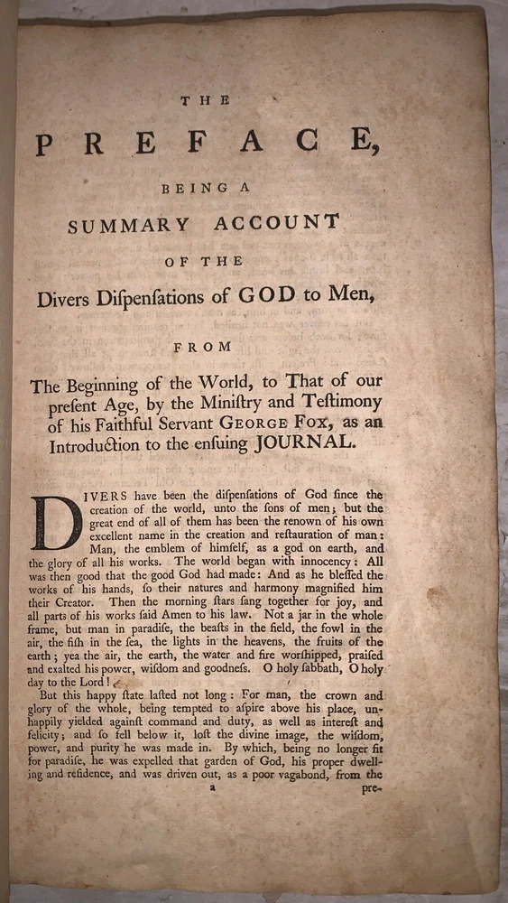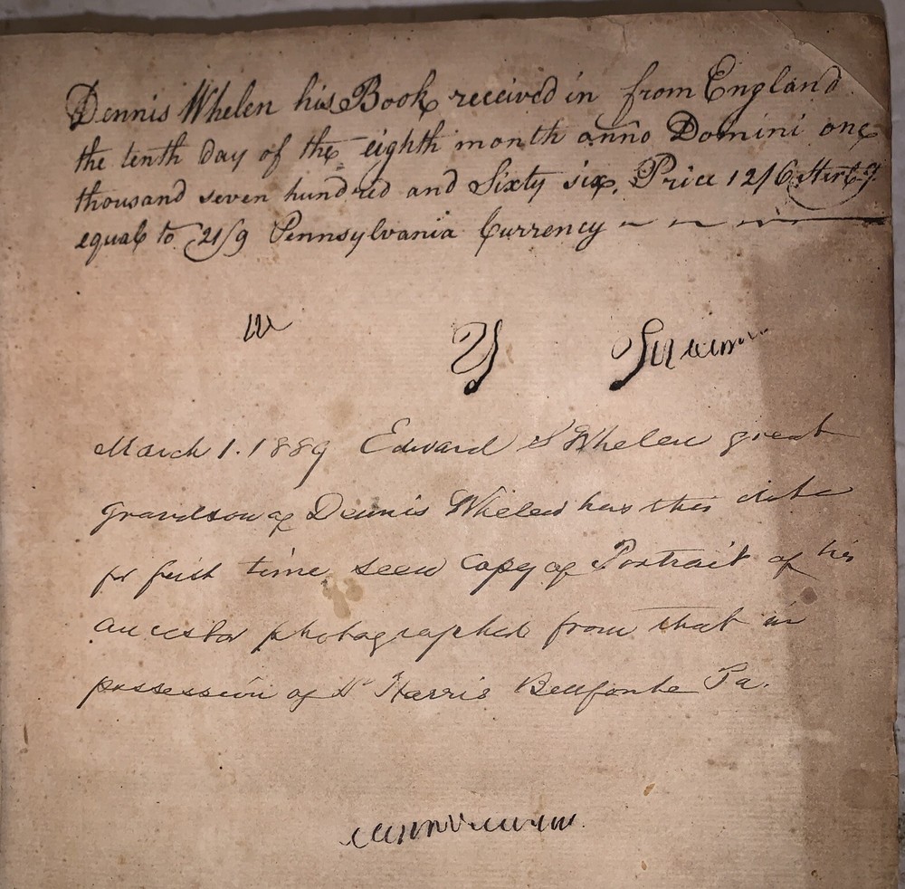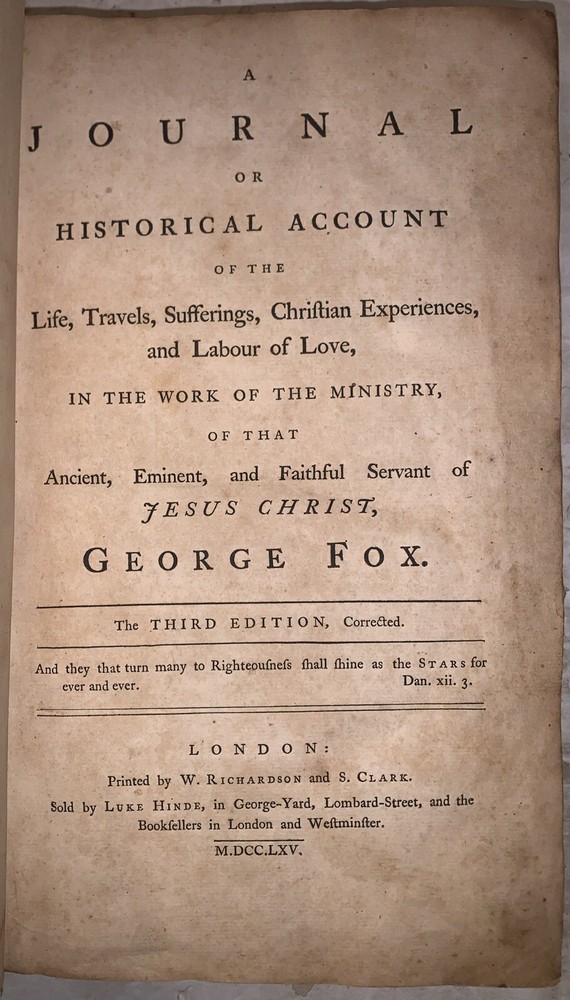 A Journal or Historical Account of the Life, Travels, Sufferings, Christian Experiences and Labour of Love, in the Work of the Ministry, of that Ancient, Eminent, and Faithful Servant of Jesus Christ, George Fox. The Third Edition, Corrected. London: Printed by W. Richardson and S. Clark 1765 Folio, lix, 679, [7], [6], [10], [4] pages, bound in period full leather with raised bands and gilt lettering to spine. Some signs of rubbing and wear, hinges cracked but holding, occasional light scattered foxing, else in good + condition. This book bears inscriptions from its original owner, Dennis Whelen (1718–1782), an early settler of Chester County, Pennsylvania, who played a foundational role in the development of the region during the colonial period. Whelen's legacy continued through his son, Dennis Whelen Jr. (1761–1819), a prominent figure in Chester County during the late 18th and early 19th centuries. Born in Uwchlan Township, Dennis Jr. served as a Federalist politician, representing Chester County in the Pennsylvania House of Representatives from 1792 to 1794 and in the Pennsylvania State Senate from 1794 to 1802. His contributions extended beyond politics; in 1809, he founded the Chester and Delaware Federalist newspaper, later renamed the Village Record. This publication became a vital platform for news and commentary in the region, cementing Whelen's influence in shaping public discourse. Dennis Whelen Jr. was married to Mary Downing, likely a member of the influential Downing family, further solidifying the Whelen family's prominence in Chester County's social and political spheres. The book also features an inscription by Edward Whelen, the great-grandson of Dennis Whelen Sr., connecting it to multiple generations of this historically significant family. These inscriptions underscore the book's importance as a tangible link to Chester County's early settlers and political history. If you have any questions, feel free to ask, and don't forget to check out my other listings.