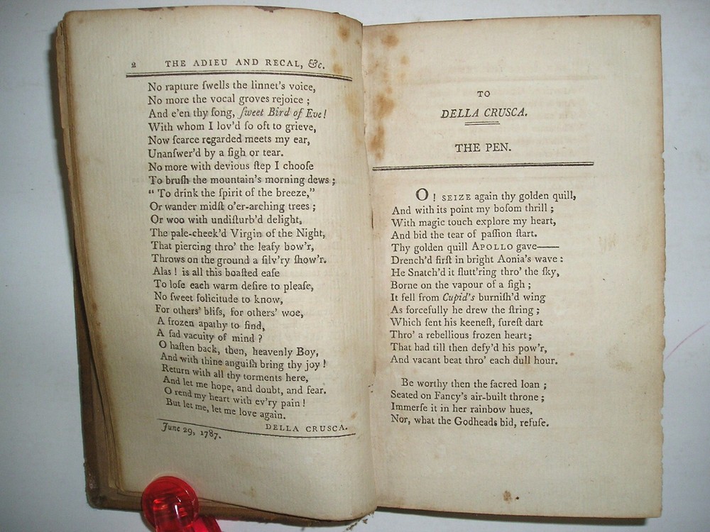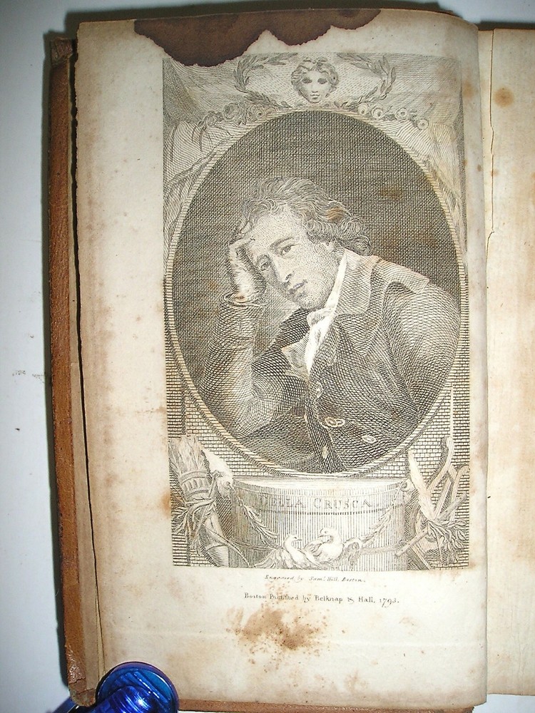 Book Description: The British Album. Containing the Poems of Della Crusca, Anna Matilda, Arley, Benedict, the Bard etc. Revised and Corrected by Their Respective Authors. First American Edition from the fourth London Edition. Boston: Printed by and for Belknap and Hall, 1793. 324 pages plus two-page table of contents in the rear. Cover in full leather, 4 ¼” x 6 ½”. Staining to top of first few pages including frontispiece portraits of Della Crusca and Anna Matilda. Remainder of pages relatively clean wiuth a small stain here and there. Cracking to front hinge. “Social Library” written on one of the front endpapers. Condition overall very good for an 18 th century imprint. The British Album was one of the first publications to bring before the public the writings of a group of English authors living in Florence and styling themselves the Della Cruscans. Della Crusca has been identified as the poet Robert Merry (1755 - 1798). For the most part, the Della Cruscan poets received scathing reviews. Walter Scott called them "a set of coxcombs who have humbugged the world long enough," while Hazlitt and Macaulay thought them to be less than dilettantes.