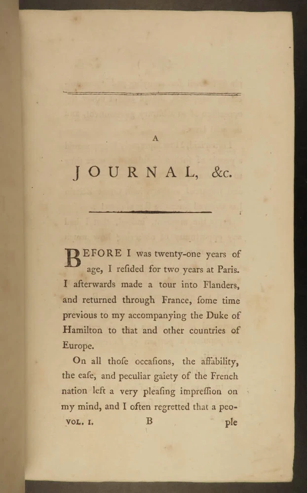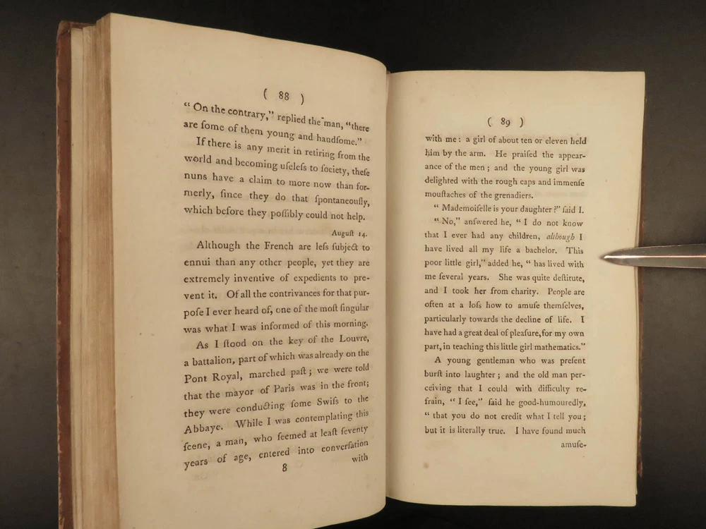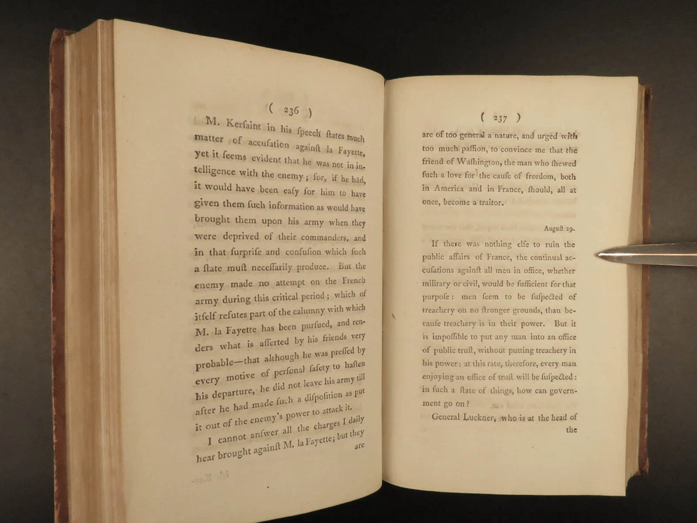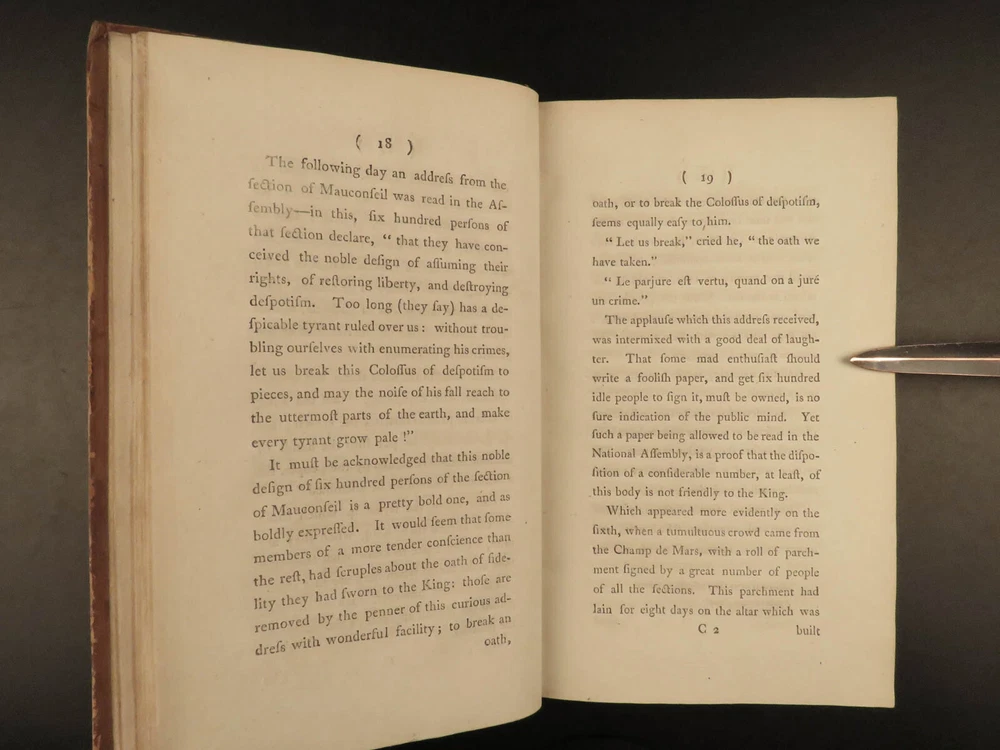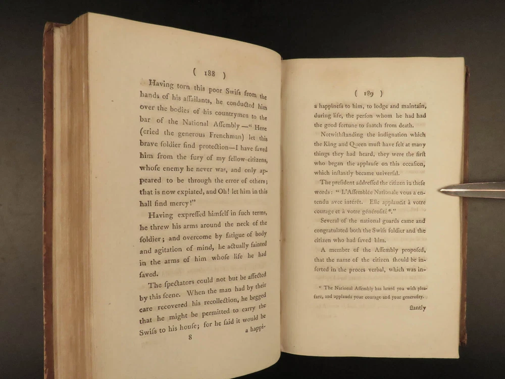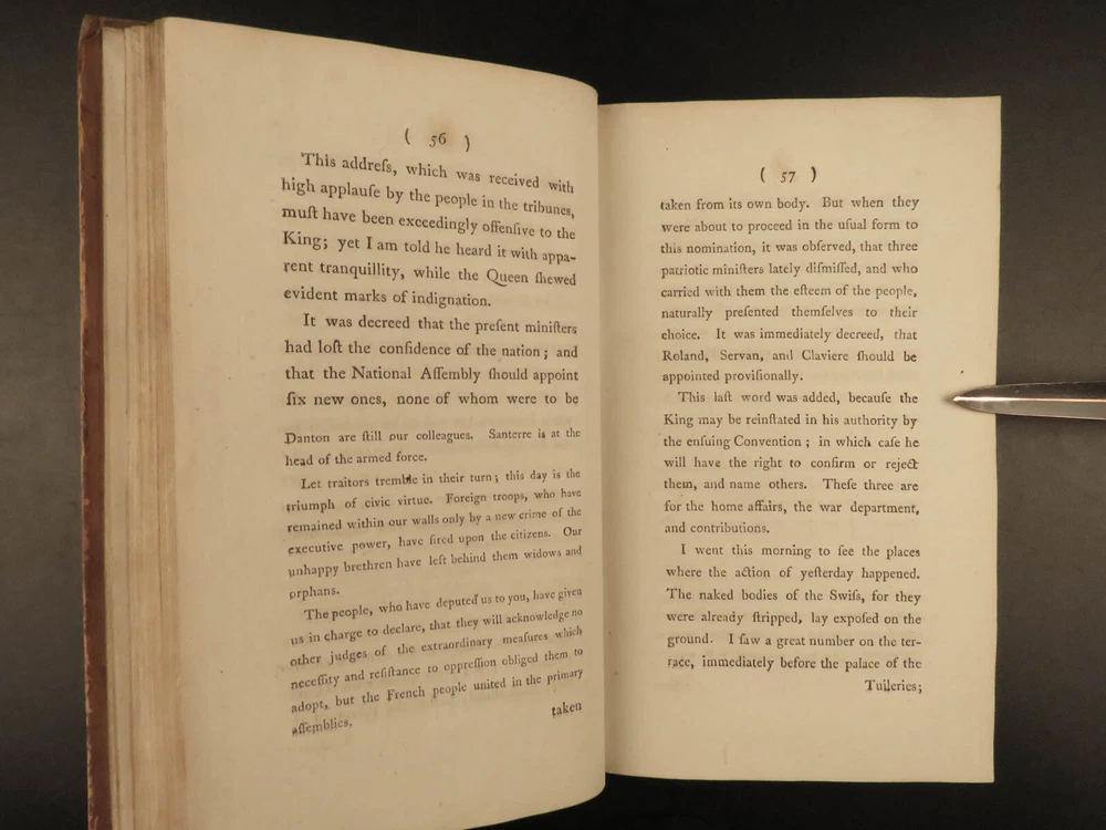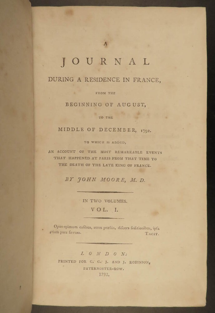 1793 French Revolution 1 ed John Moore Journal of Paris Louis XIV + Color MAP 2v John Moore was an 18 th -century Scottish travel writer who is best known for his novel ‘ Zeluco’ . In addition to his novels, Moore published an account of his and travel companion James Maitland’s time in Paris during the French Revolution. This book offers an important first-hand account of the French Revolution from a Scottish perspective with notes on Louis XIV and the Parisian communes. Item number: #20215 Price: $550 MOORE, John A journal during a residence in France : from the beginning of August, to the middle of December, 1792 London : Printed for G.G. and J. Robinson, 1793. First edition. Details : · Collation: Complete with all pages; 2 volumes o Vol. 1 – [4], 502 o Vol. 2 – [4], 617, [3] § Includes folding map · Language: English · Binding: Leather; tight and secure · Size : ~8.5in X 5.5in (21.5cm x 14cm) Our Guarantee: Very Fast. Very Safe. Free Shipping Worldwide. Customer satisfaction is our priority! Notify us with 7 days of receiving, and we will offer a full refund without reservation! 20215