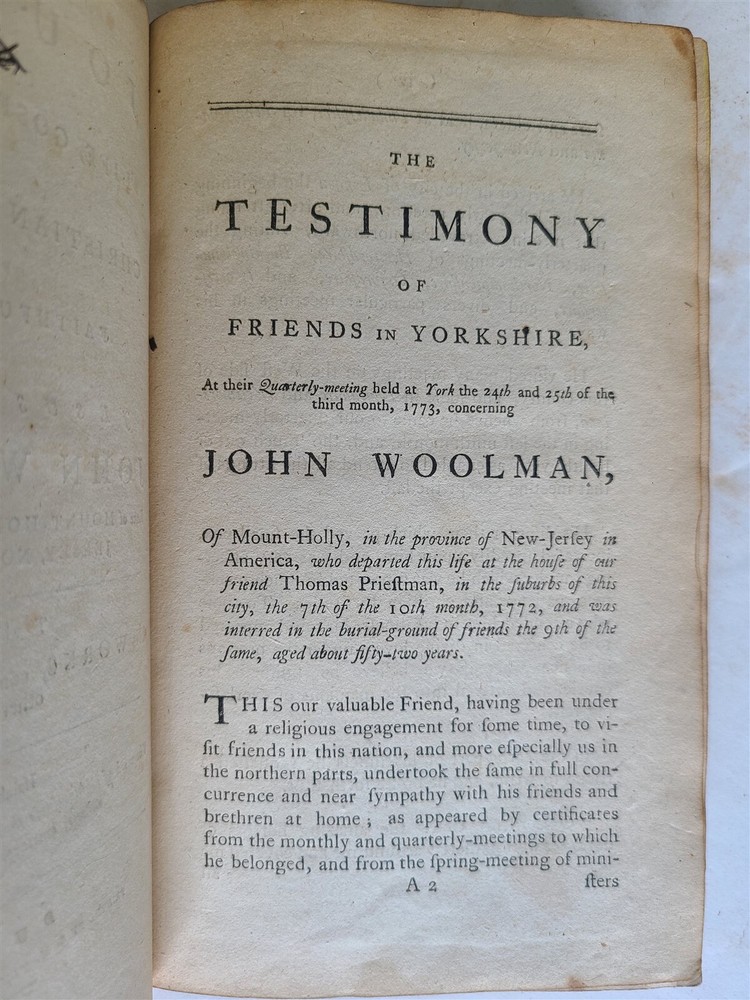 (Abolition) Woolman, John. A Journal of the Life, Gospel Labours, and Christian Experiences of that Faithful Minister... Dublin, 1794 xv, 464 pages. Size 5 by 8" Original calf; rebacked with some of original spine laid in, Binding worn title margin clipped, generally sound otherwise. Includes "Some considerations on the keeping of Negroes..." - Work, page 306; Dumond, page 118. Text in English ===================================== Refund Policy: We will issue a FULL REFUND, 100% money back if you are not satisfied with your purchase. Items must be returned to us within 20 days in order to receive a refund or replacement. Buyer is responsible for the shipping costs. Powered by SixBit's eCommerce Solution