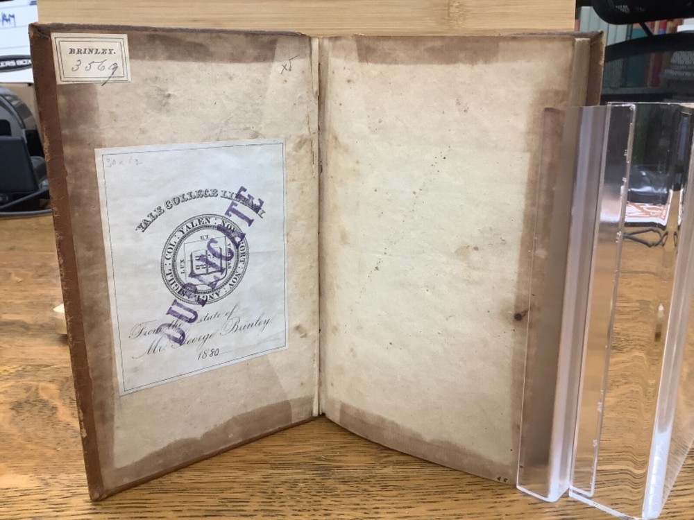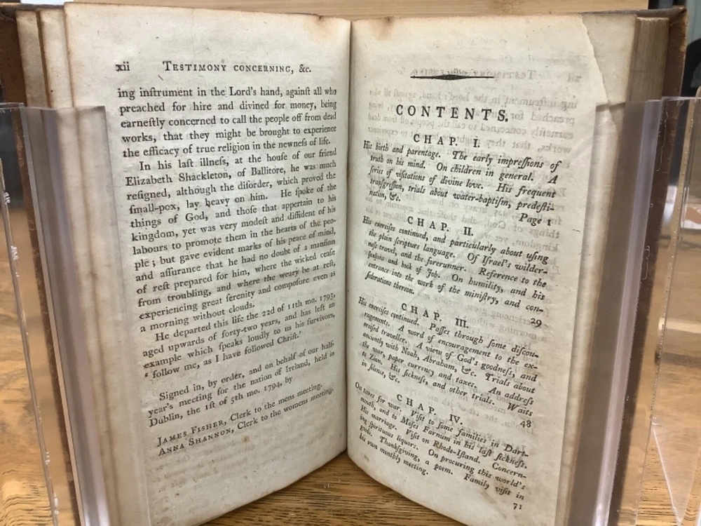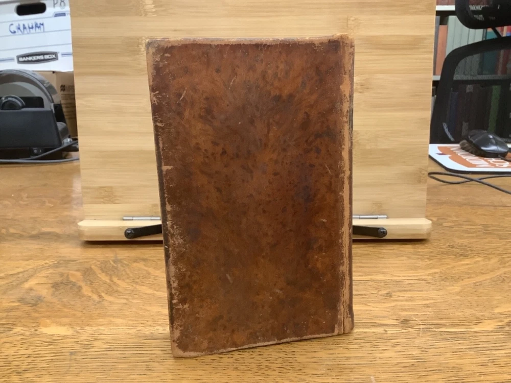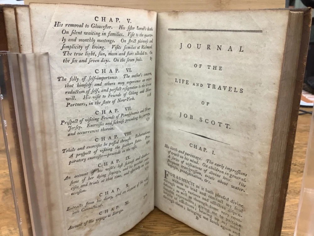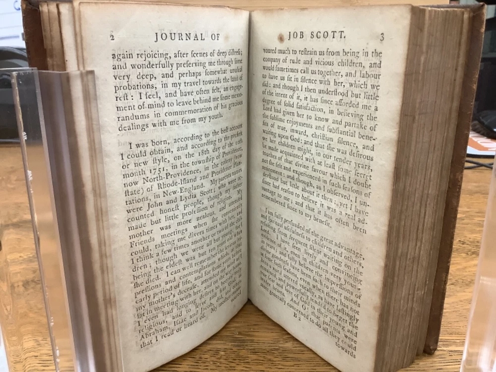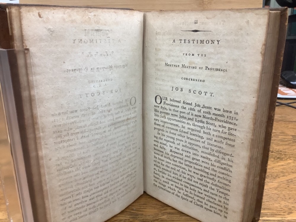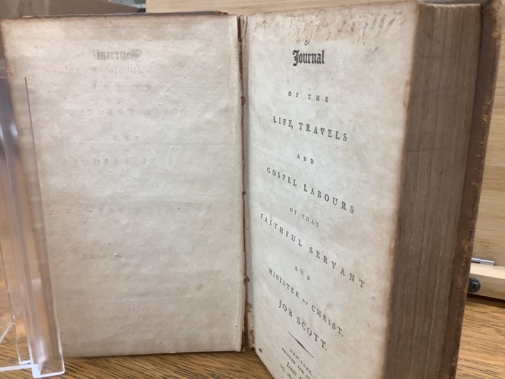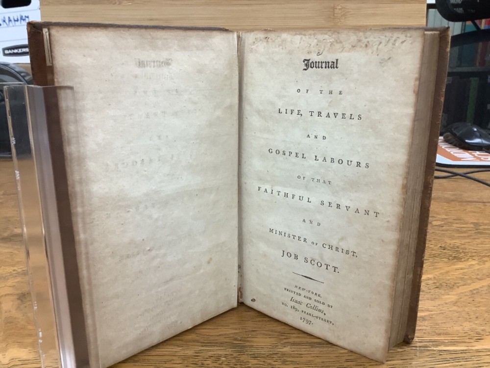 Journal of the Life, Travels, and Gospel Labors of That Faithful Servant and Minister in Christ, Job Scott. Published in New York City by Isaac Collins. 1797, 360 pp, 7 x 4.25”, 18mo, full leather. In fair condition, with rubbing to boards and spine, primarily along the edges. Chipping to spinal label. Front hinge is worn and front board is loose. Text block is tightly and securely attached. Bookseller sticker and ex-library bookplate from the Yale University Library on the front pastedown, with remnants of inscriptions on the top of the title page. General age-related toning and light foxing to pages that do not compromise overall readability. Please see photographs and ask any questions prior to purchasing. A volume on the life of the late Job Scott (1751-1793), a widely-known Quaker minister who traveled throughout the United States and Europe to advocate for the faith. FORN-ABE-MSB-1021-Shelf-609-aj677