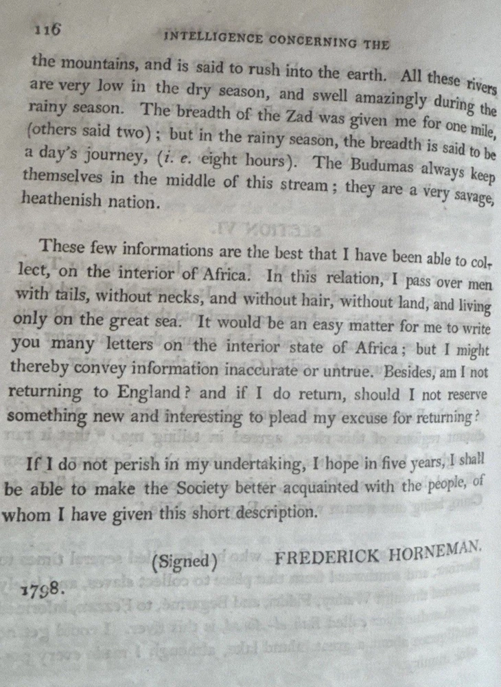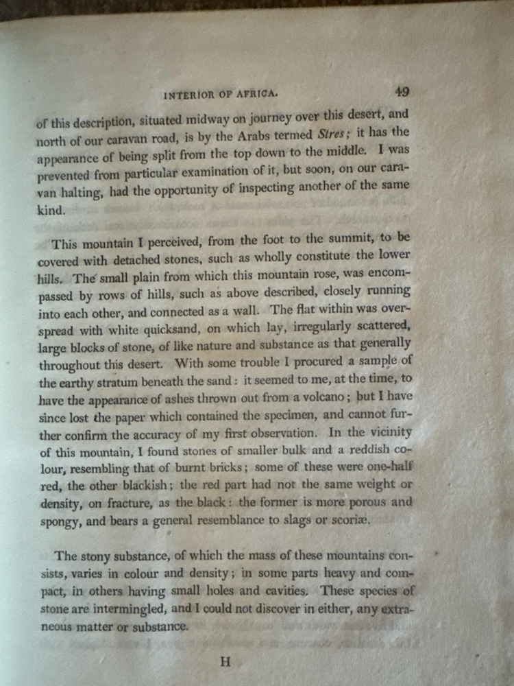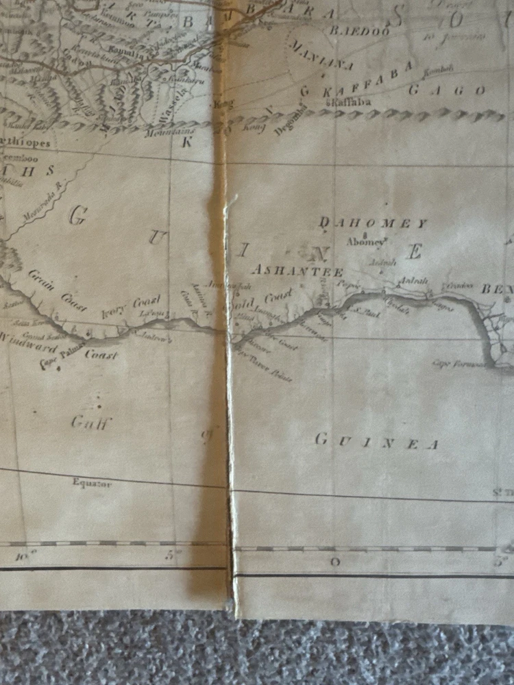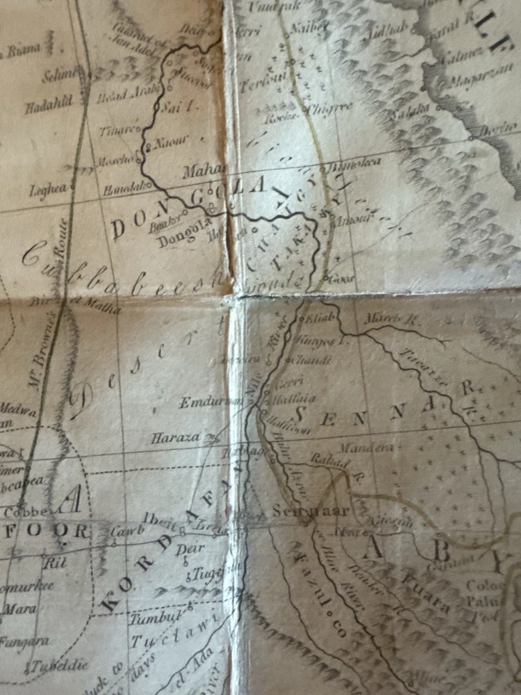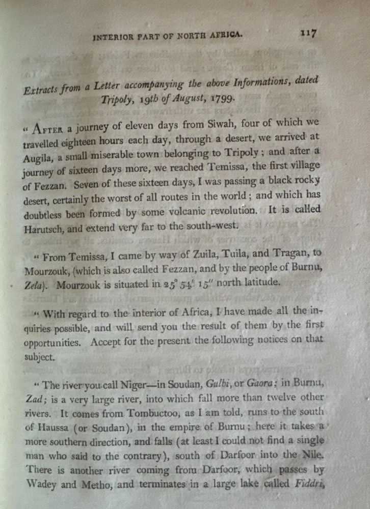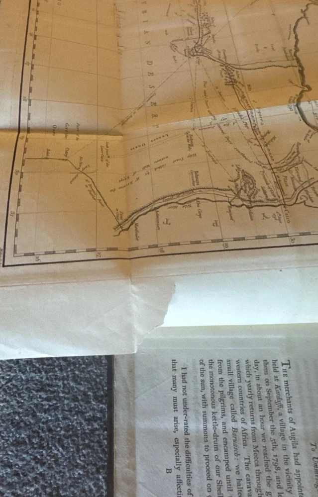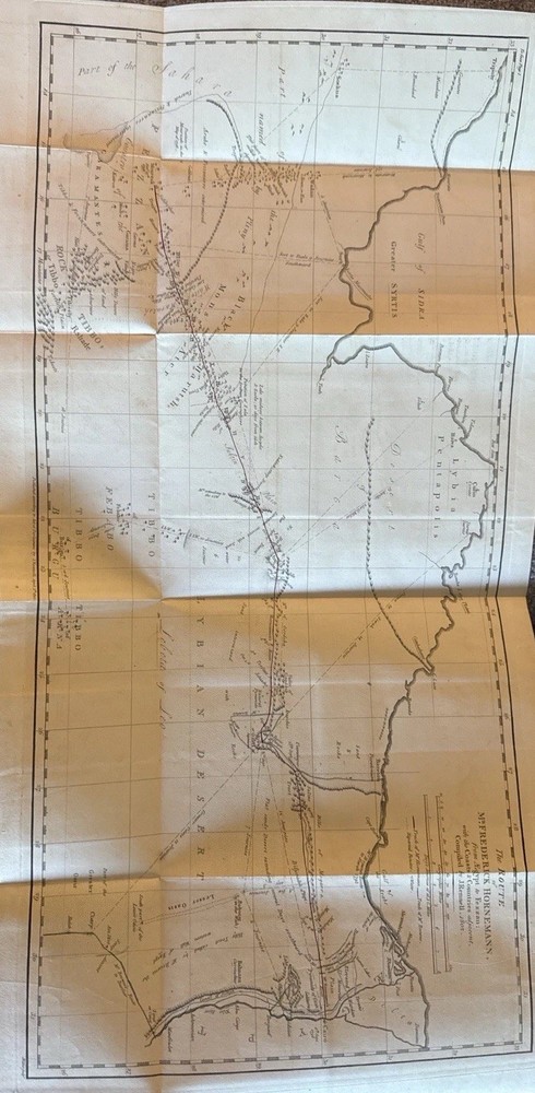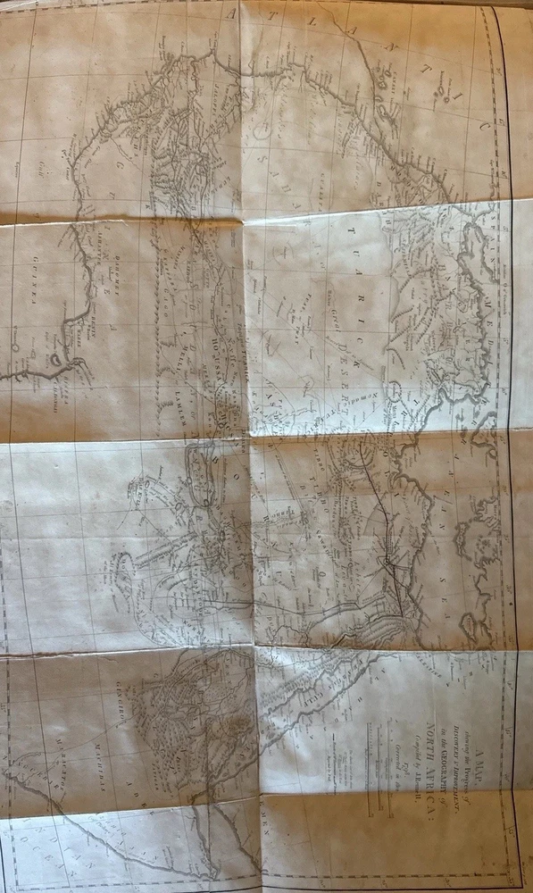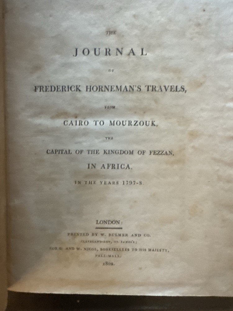 🏜️ 1802 First Edition – Journal of Frederick Horneman’s Travels from Cairo to Mourzouk – Complete with Both Large Fold-Out Maps This is a rare and important first edition (London, 1802) of The Journal of Frederick Horneman’s Travels, an early British account of overland exploration in North Africa during the years 1797–1798. Published under the patronage of the African Association, Horneman was one of the first Europeans to journey from Cairo deep into the Kingdom of Fezzan (modern-day Libya), traveling in disguise as a Muslim merchant. His expedition helped lay the groundwork for later explorations into Timbuktu, Hausaland, and Central Africa. ⸻ 📚 Details: • Title: The Journal of Frederick Horneman’s Travels from Cairo to Mourzouk, Capital of the Kingdom of Fezzan in Africa, in the Years 1797-8 • Author: Frederick Horneman • Publisher: W. Bulmer and Co., London (for G. & W. Nicol, booksellers to His Majesty) • Date: 1802 • Binding: Original full leather with marbled boards and gilt border tooling • Size: Quarto (approx. 10.5 x 8 inches) ⸻ 📌 Features: • ✅ Both large original fold-out maps present • Map 1: Route from Cairo to Mourzouk (minor corner tear) • Map 2: Full fold-out map of Northern Africa Minor tears (see pics) • ✅ Original marbled paper boards with decorative gilt border • ✅ Gilt-decorated spine with original “Africa” title • ✅ Period bookplate on front pastedown • ✅ Clean text throughout with light foxing, strong laid paper, and wide margins • ✅ Excellent historical detail on geography, culture, and geology of the interior Sahara ⸻ 🔍 Condition Notes: Solid and complete. Some expected age wear to the leather spine and corners. Light scattered foxing and toning to endpapers and margins. Maps are in overall very good condition, neatly folded, and securely bound. Hinges reinforced at some point. No missing pages. A well-preserved survivor of early 19th-century exploration publishing. ⸻ 🔥 A Landmark of African Exploration: This book is a cornerstone for collectors of early African travel, cartography, and colonial-era publishing. Horneman’s detailed descriptions — from volcanic soil near Augila to early mentions of the Niger River, Fezzan, and Timbuktu — provide a firsthand glimpse into a region then almost completely unknown to Europeans. ⸻ 📦 Shipping: Professionally packed and insured