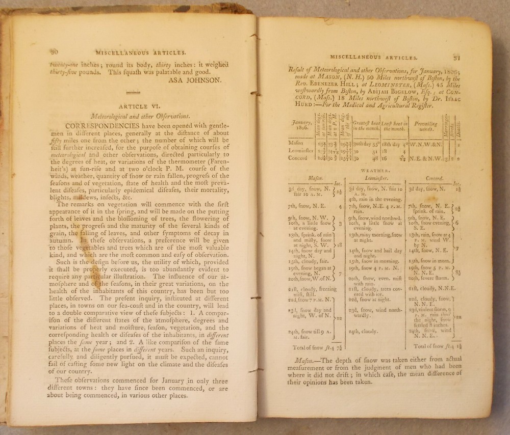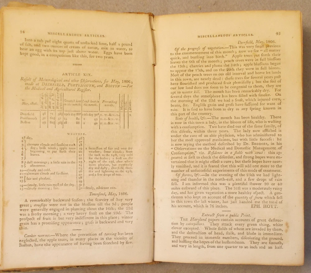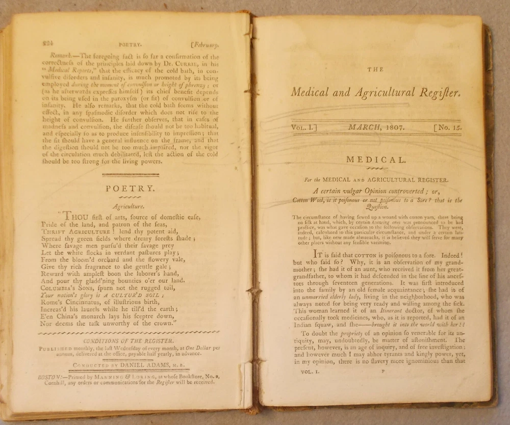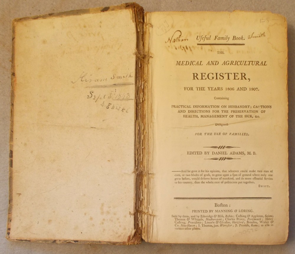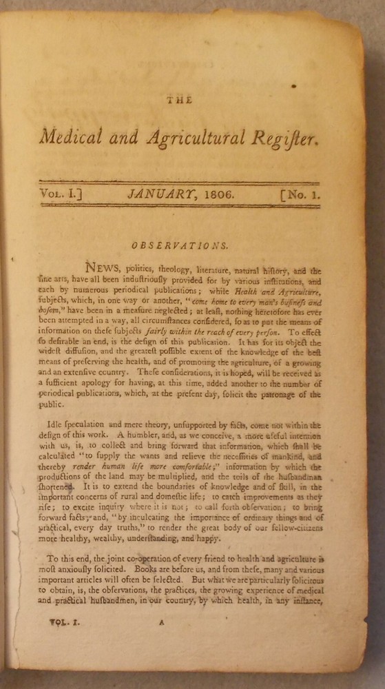 Adams, Daniel. The Medical and Agricultural Register, for the Years 1806 and 1807 (24 Issues, Bound) : Containing Practical Information on Husbandry; Cautions and Directions for the Preservation of Health, Management of the Sick, & C. Designed for the Use of Families . Boston: Manning and Loring, 1806. Leather: Fair. A collection of 24 issues bound in contemprary quarter-calf over marbled boards, lacking the endpapers. Mid-19th century signature inside the cover. The hinges are cracked, the covers worn and some signatures shaken; occasional tears to the leaves. We have a large selection of books on the History of Medicine, please see our store categories for additional listings.