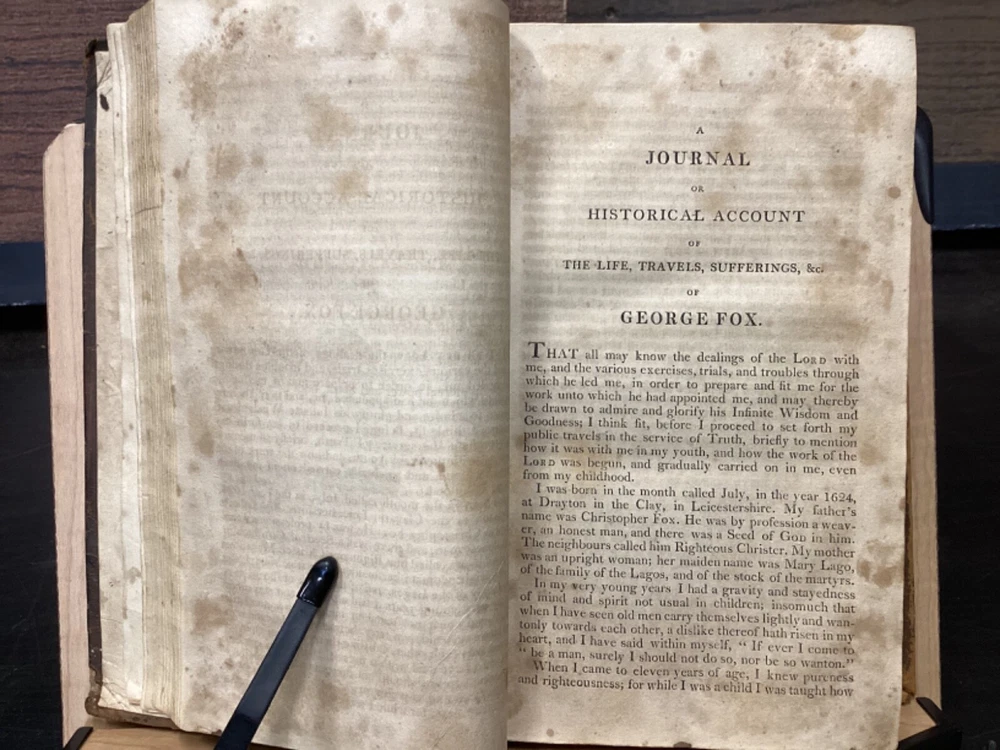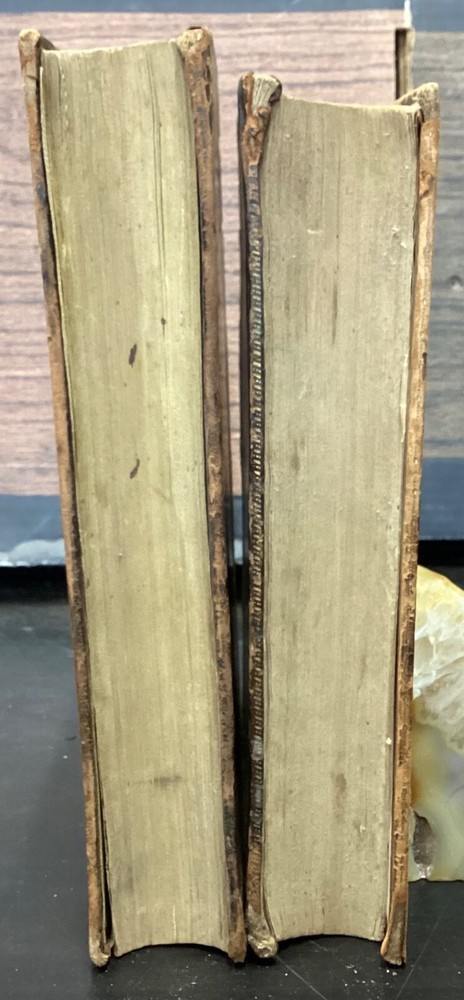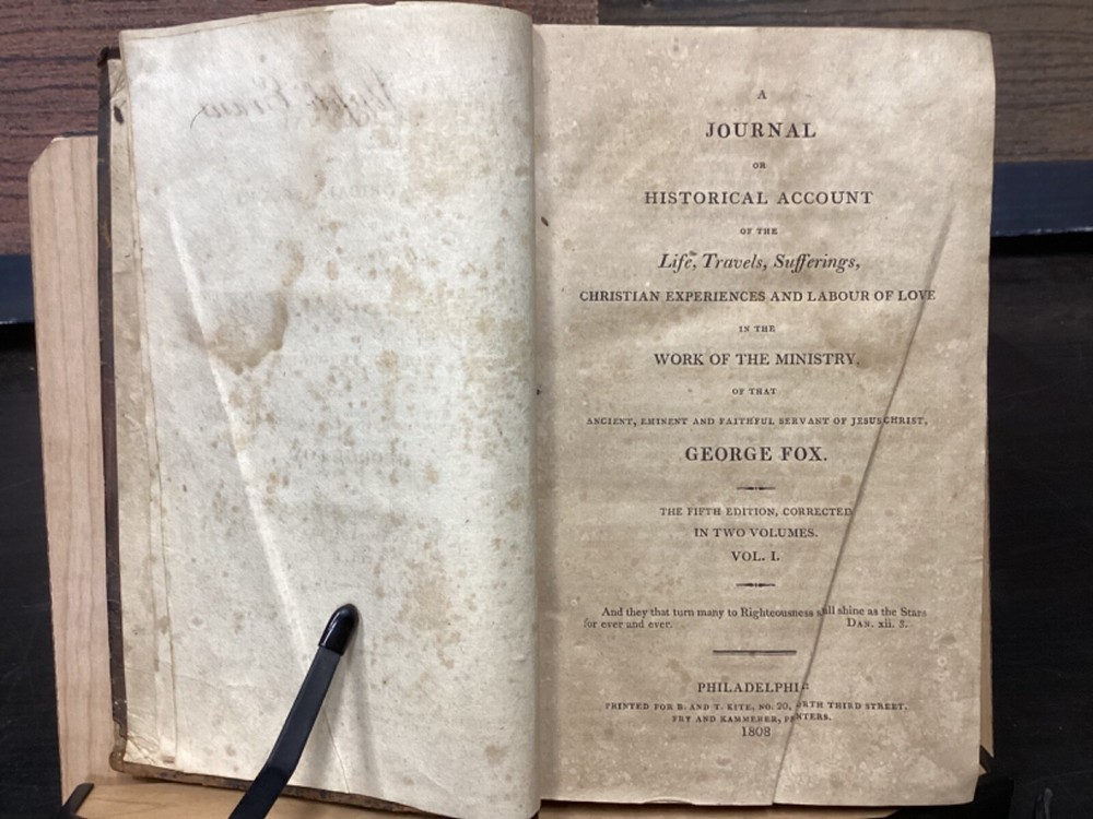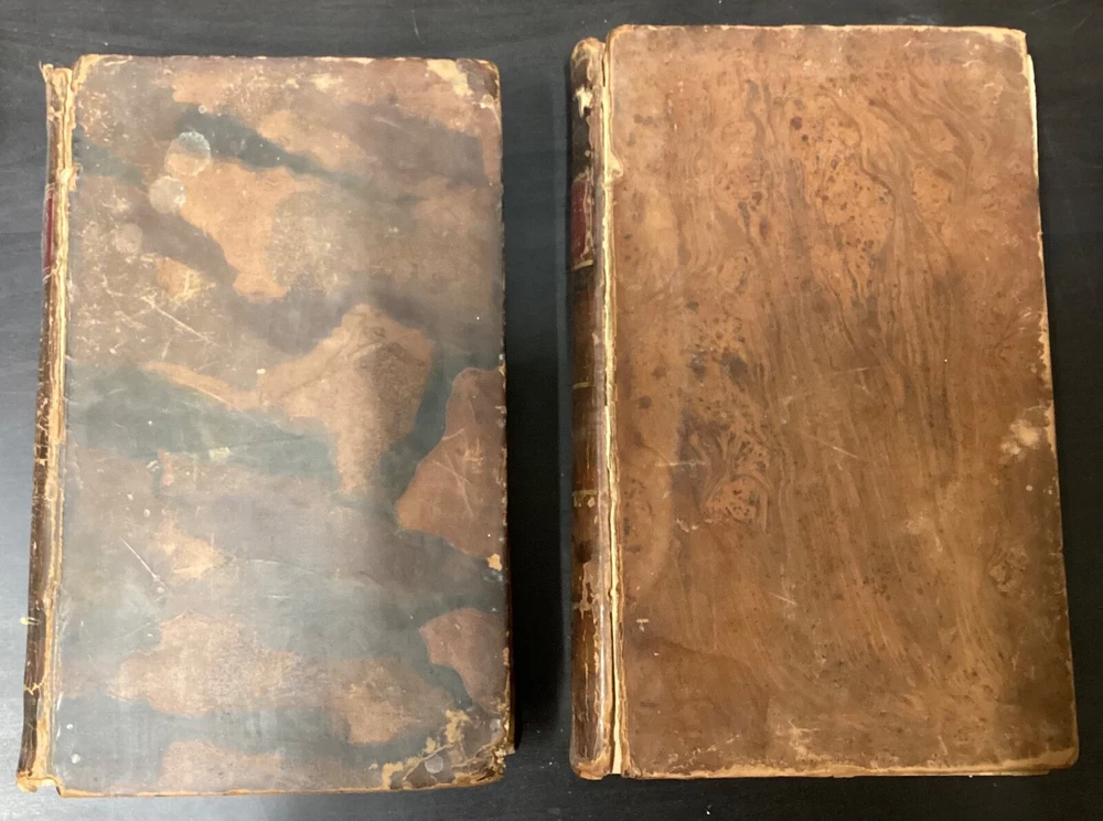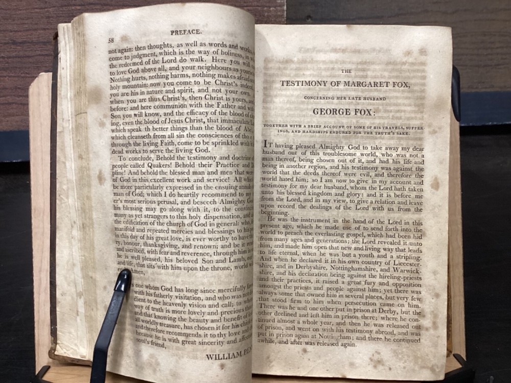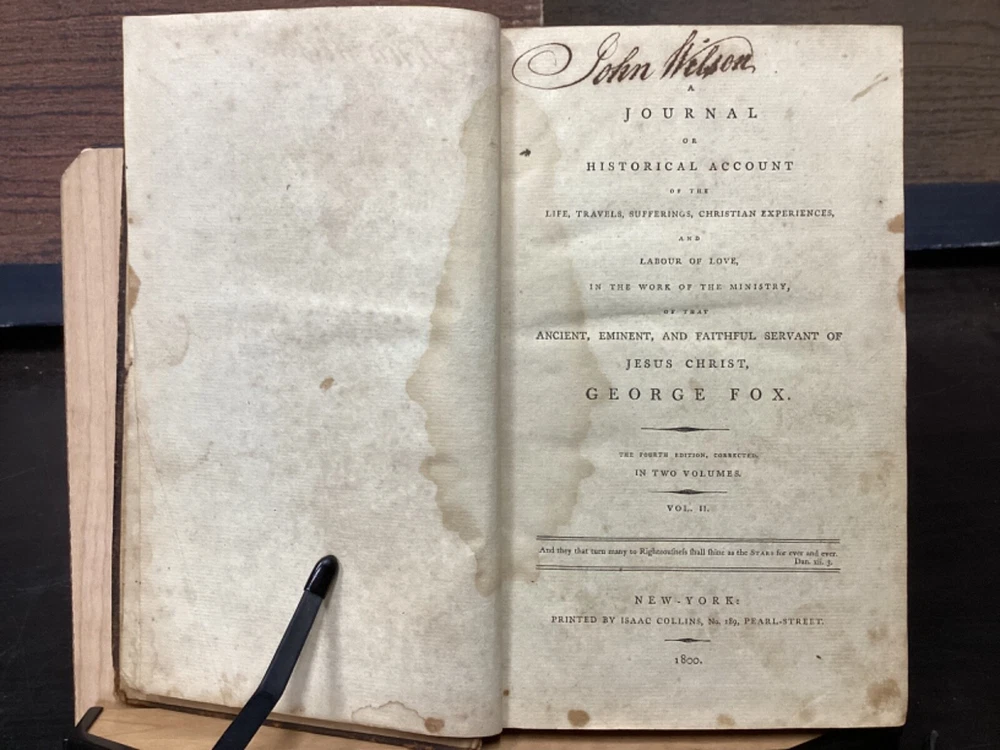 Volume 1: A Journal or Historical Account of the Life, Travels, Sufferings, Christian Experiences and Labour of Love in the Work of the Ministry, of That Ancient, Eminent, and Faithful Servant of Jesus Christ, George Fox, The Fifth Edition, Corrected, In Two Volumes, B. and T. Kite, Philadelphia, 1808, 542pp, leather, 5.5 x 9", 8vo Volume 2: A Journal or Historical Account of the Life, Travels, Sufferings, Christian Experiences and Labour of Love in the Work of the Ministry, of That Ancient, Eminent, and Faithful Servant of Jesus Christ, George Fox, The Fourth Edition, Corrected, In Two Volumes, Isaac Collins, New York, 1800, 464pp, leather, 6 x 9", 8vo Poor condition/as is. Rear board of vol. 1 is completely detached from binding. Front board of vol. 2 attached to binding by cording. Wear to boards with redrot and bumped tips. Both spines show cracking and chipping but are still legible. Some binding exposed at tail of vol. 1. Front joint of vol. 1 is cracked. Provenance in ink of Joseph Evans on front endpaper of vol. 1. Marginalia in ink on front pastedown of vol. 2. Provenance in ink of John Nelson on title page of vol. 2. 535 to rear endpaper of vol. 1 has a tear that runs into the text, but does not affect readability. Toning, foxing, tea-staining, and age-staining throughout textblocks. Please see photos and ask any questions prior to purchase. Please note that, while this two volume set is complete, the volumes are from different editions. George Fox (July 1624 - 13 January 1691) was an English Dissenter, who was a founder of the Religious Society of Friends, commonly known as the Quakers or Friends. Fox was arrested and jailed numerous times for his beliefs and spent his final decade working in London to organize the expanding Quaker movement. Despite disdain from some Anglicans and Puritans, he was viewed with respect by the Quaker convert William Penn and the Lord Protector, Oliver Cromwell. FORN-MSB-0224-TUB0008-JC152
