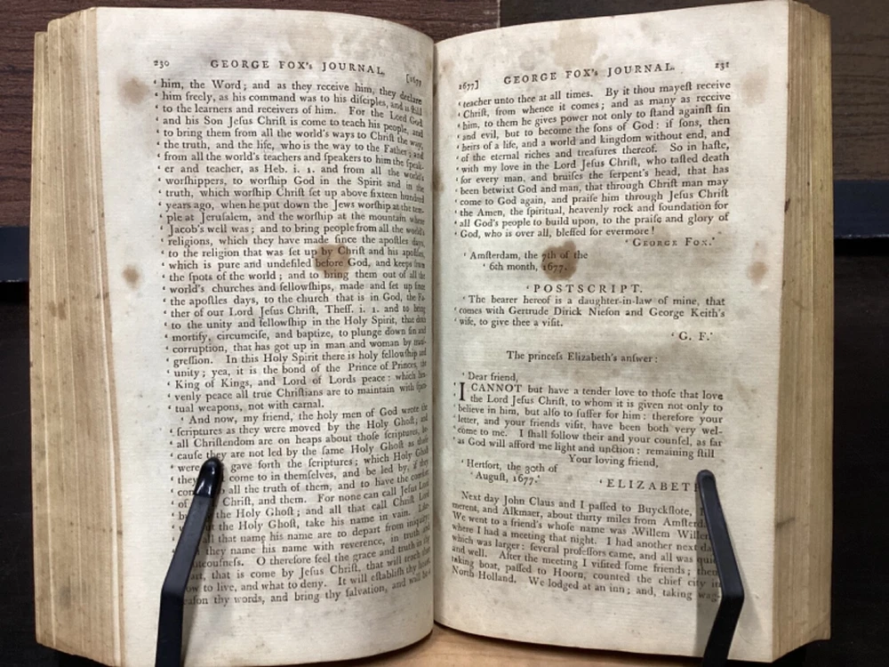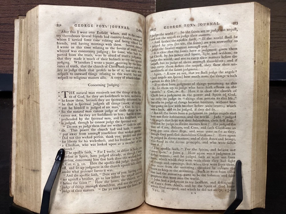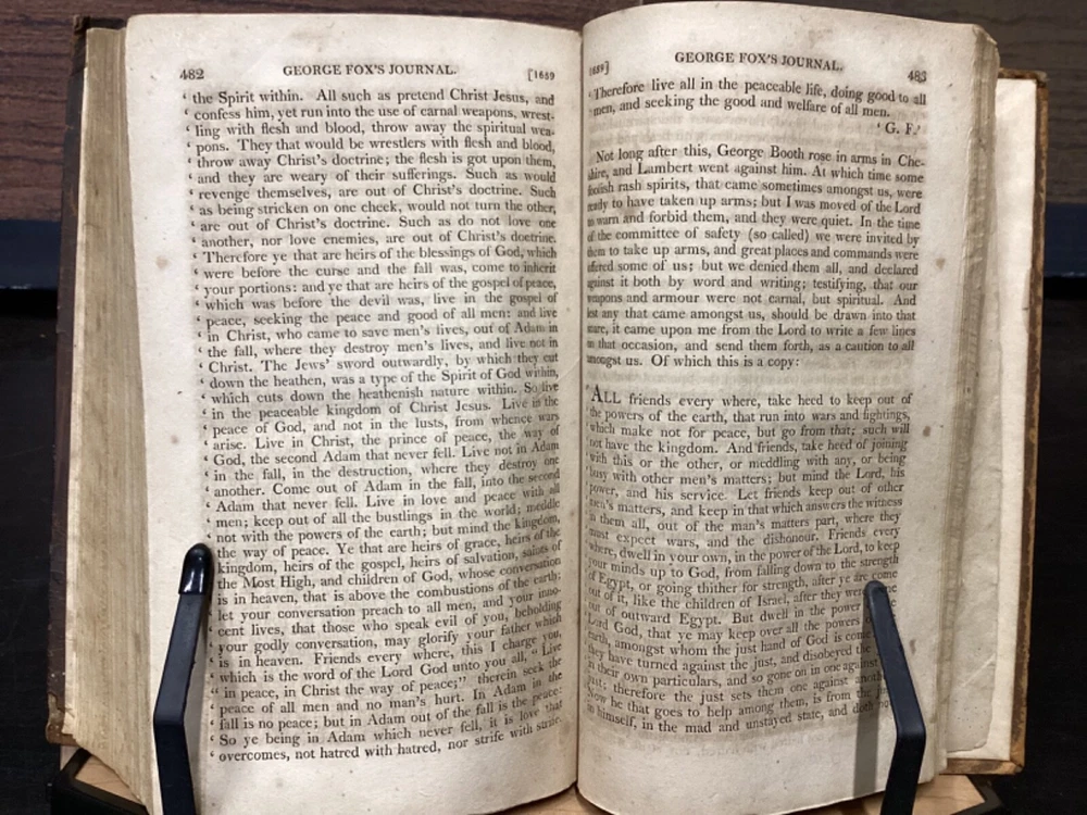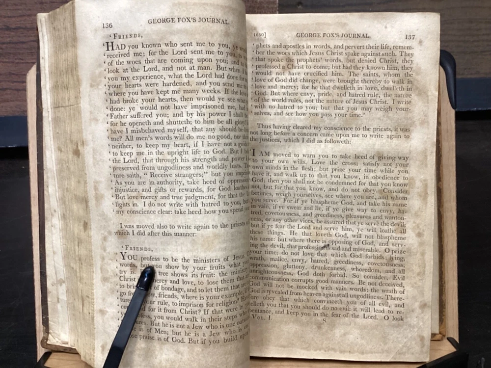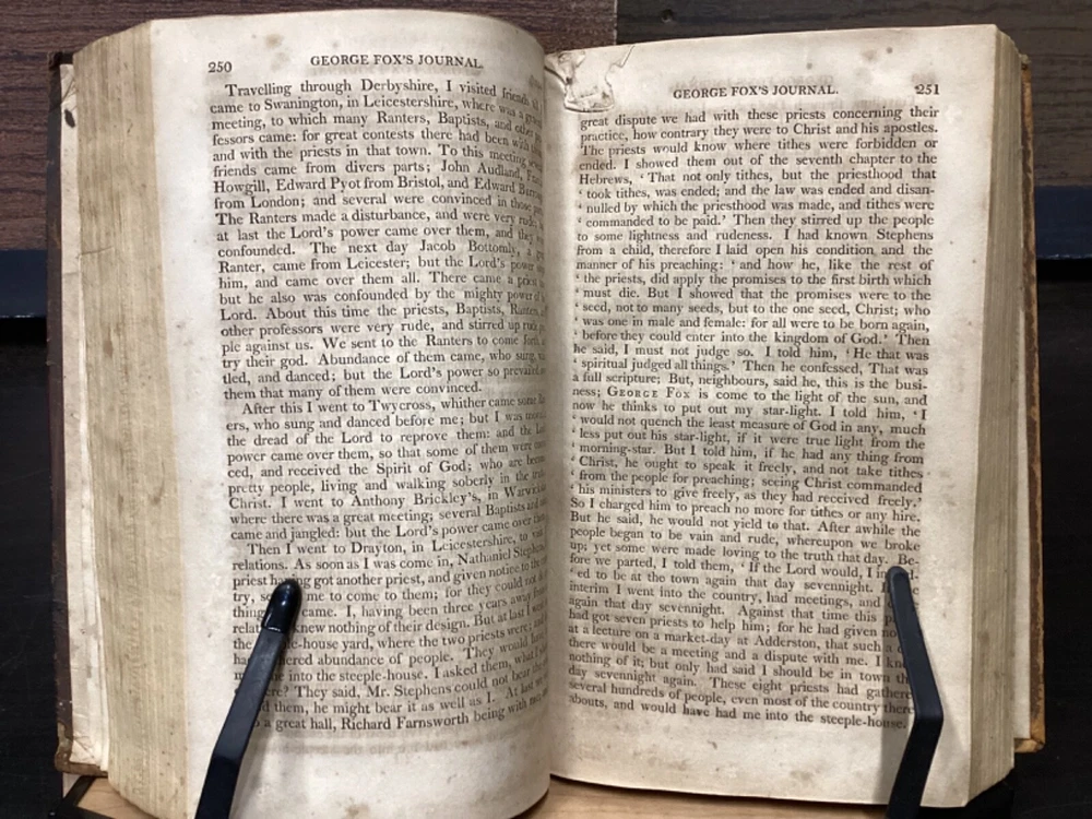 Volume 1: A Journal or Historical Account of the Life, Travels, Sufferings, Christian Experiences and Labour of Love in the Work of the Ministry, of That Ancient, Eminent, and Faithful Servant of Jesus Christ, George Fox, The Fifth Edition, Corrected, In Two Volumes, B. and T. Kite, Philadelphia, 1808, 542pp, leather, 5.5 x 9", 8vo Volume 2: A Journal or Historical Account of the Life, Travels, Sufferings, Christian Experiences and Labour of Love in the Work of the Ministry, of That Ancient, Eminent, and Faithful Servant of Jesus Christ, George Fox, The Fourth Edition, Corrected, In Two Volumes, Isaac Collins, New York, 1800, 464pp, leather, 6 x 9", 8vo Poor condition/as is. Rear board of vol. 1 is completely detached from binding. Front board of vol. 2 attached to binding by cording. Wear to boards with redrot and bumped tips. Both spines show cracking and chipping but are still legible. Some binding exposed at tail of vol. 1. Front joint of vol. 1 is cracked. Provenance in ink of Joseph Evans on front endpaper of vol. 1. Marginalia in ink on front pastedown of vol. 2. Provenance in ink of John Nelson on title page of vol. 2. 535 to rear endpaper of vol. 1 has a tear that runs into the text, but does not affect readability. Toning, foxing, tea-staining, and age-staining throughout textblocks. Please see photos and ask any questions prior to purchase. Please note that, while this two volume set is complete, the volumes are from different editions. George Fox (July 1624 - 13 January 1691) was an English Dissenter, who was a founder of the Religious Society of Friends, commonly known as the Quakers or Friends. Fox was arrested and jailed numerous times for his beliefs and spent his final decade working in London to organize the expanding Quaker movement. Despite disdain from some Anglicans and Puritans, he was viewed with respect by the Quaker convert William Penn and the Lord Protector, Oliver Cromwell. FORN-MSB-0224-TUB0008-JC152