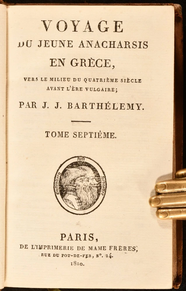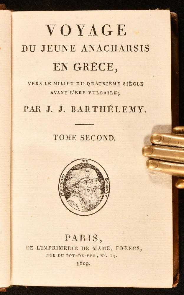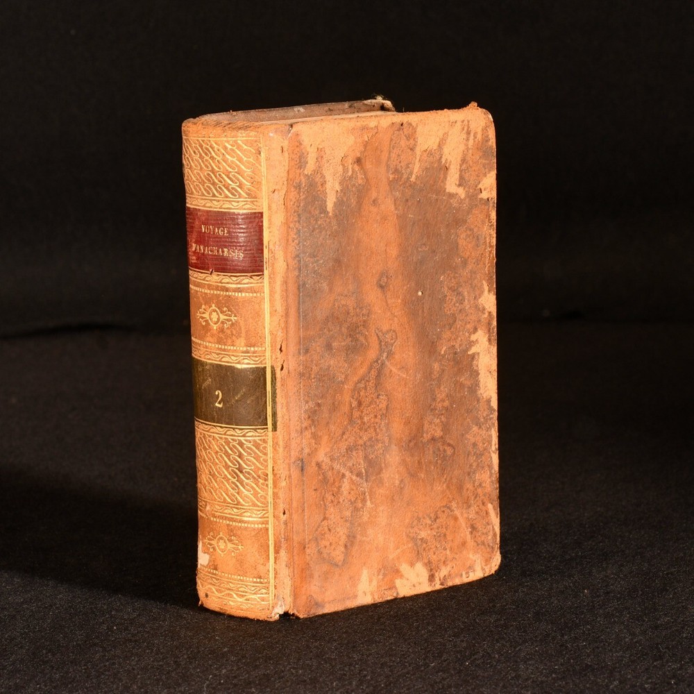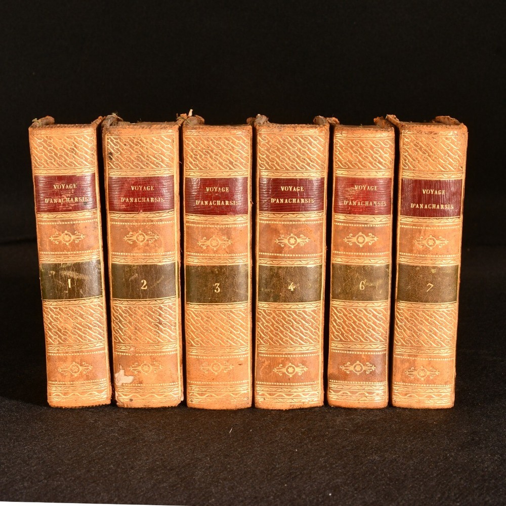 Click here to see our other books! Voyage Du Jeune Anacharsis En Grece Vers Le Milieu Du Quatrieme Siecle Avant L'Ere Vulgaire J. J. Barthelemy 1810 Mame : Paris 5.5" by 3.5" SUMMARY A six volume set of works on the fictional voyage of Anacharsis, bound in full tree calf. Leather Binding,Original Binding,Publishers' Original Binding Overall Condition: Good This book weighs 1.5 KG when packed UK Postage: £ 3.99 US Postage: £ 23.99 EU Postage : £ 18.99 European Postage: £ 19.99 Asia Postage: £ 31.99 Worldwide Postage: £ 32.99 DESCRIPTION Six volumes. Lacking two volumes. Bound in full tree calf with gilt details and straight grain morocco spine labels. This six volume set features the fictional work 'Travels of Anacharsis the Younger in Greece' written by Jean-Jacques Barthelemy. The work describes the imaginary journeys of a real Scythian named Anacharsis, through the form of a travel journal. This work is considered to be one of the first historical novels. CONDITION Bound in full tree calf. Externally generally smart with fading to the spines, bumping to the extremities, rubbing to the extremities, boards and joints, marks to the boards and small closed tears to the joints to volumes one, two, seven and four. Front hinge starting after front blank to 'Volume Six'. Occasional discolouration to endpapers. Internally firmly bound with lightly age toned pages with occasional spotting and marks, and tidemarks to 'Volume Two'. Overall Condition: Good GLOSSARY OF TERMS Overall Condition (Dustwrapper condition rating is shown after that for the book itself, where a dustwrapper is present) Fine - Very well preserved copy showing very little wear Very Good Indeed - Only one or two minor faults, really a very attractive copy Very Good - Quite a wide term meaning no major faults but probably several smaller ones often expected given the age of the book, but still a respectable copy Good - Meaning not very good. Some more serious faults as will be described in the condition report under 'condition' Good Only - Meaning one or more faults that could really do with repair Fair - As with good only above but with other faults leaving a compromised copy even after repair Poor - Really bad and possibly seriously incomplete. We only sell books in this condition where their rarity or value makes them attractive none the less. Major defects will be described. GUARANTEE We offer a full money back guarantee on our descriptions. Please ask for details and conditions. We prefer PAYPAL. If you pay via PAYPAL we will post the item off the same or the next working day with the postage you have selected. Please note we cannot accept USD cheques