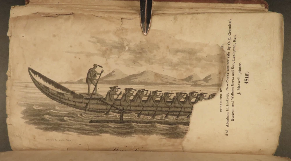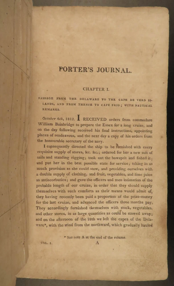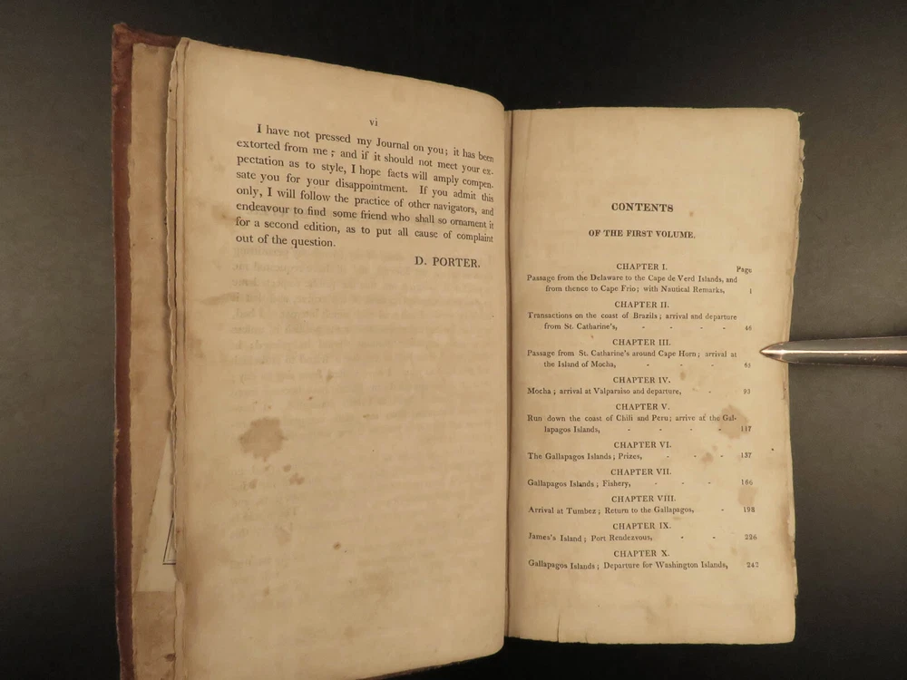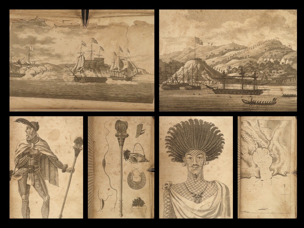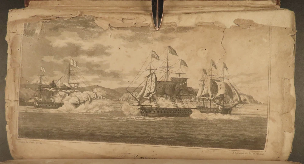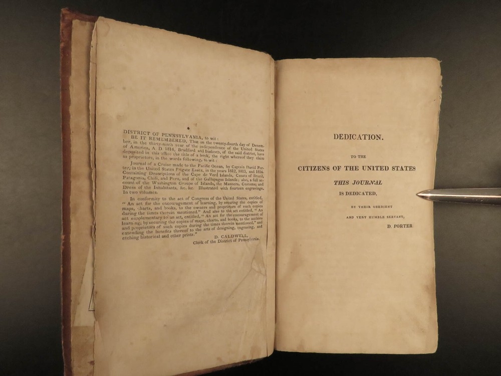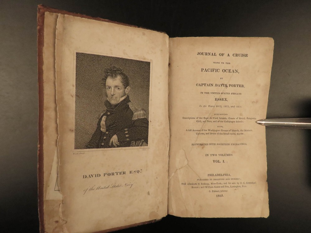 1815 1 ed David Porter Journal USS Essex Battle of Valparaiso War of 1812 Plates David Porter was an early American naval captain who served on the USS Constitution and the USS Essex. While aboard the Essex, Porter faced significant hardships, including the Battle of Valparaiso where the ship was ultimately disabled. Porter kept a journal of his time aboard the Essex, a journal that was quickly published after capture of the Essex. This extremely rare first edition was published in Philadelphia and includes 14 full-page engravings. Hill calls the first edition of this book “suppressed and a very rare book” The illustrations depict native tribes, indigenous foods and fruits, and most desirably illustrated views of battle scenes, ships, and forts! Item number: #16496 Price: $950 PORTER, David Journal of a cruise made to the Pacific Ocean by Captain David Porter, in the United States Frigate Essex, in the years 1812, 1813, and 1814 Philadelphia: published by Bradford and Inskeep, 1815. First edition. Details : · Collation: Complete with all pages; 2 volumes in 1 o Vol. I – vi, [2], 263, [1] o Vol. II – [2], 169, [1] o 14 engravings · References: Sabin 64219; Hill 1373; Howes P 484 · Language: English · Binding: Leather; tight and secure · Size : ~8.5in X 5.25in (22cm x 13.5cm) Our Guarantee: Very Fast. Very Safe. Free Shipping Worldwide. Customer satisfaction is our priority! Notify us with 7 days of receiving, and we will offer a full refund without reservation! 16496
