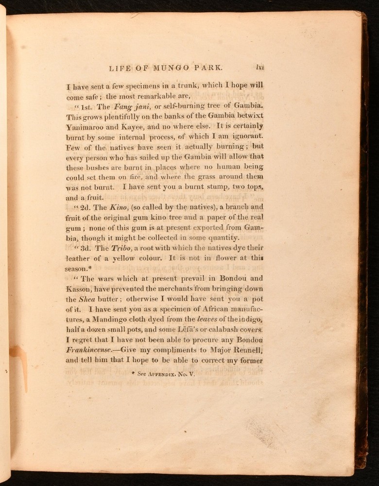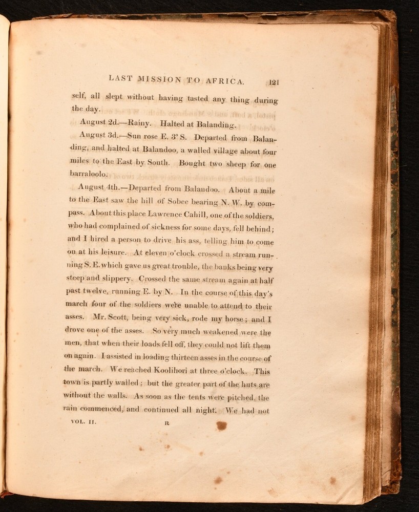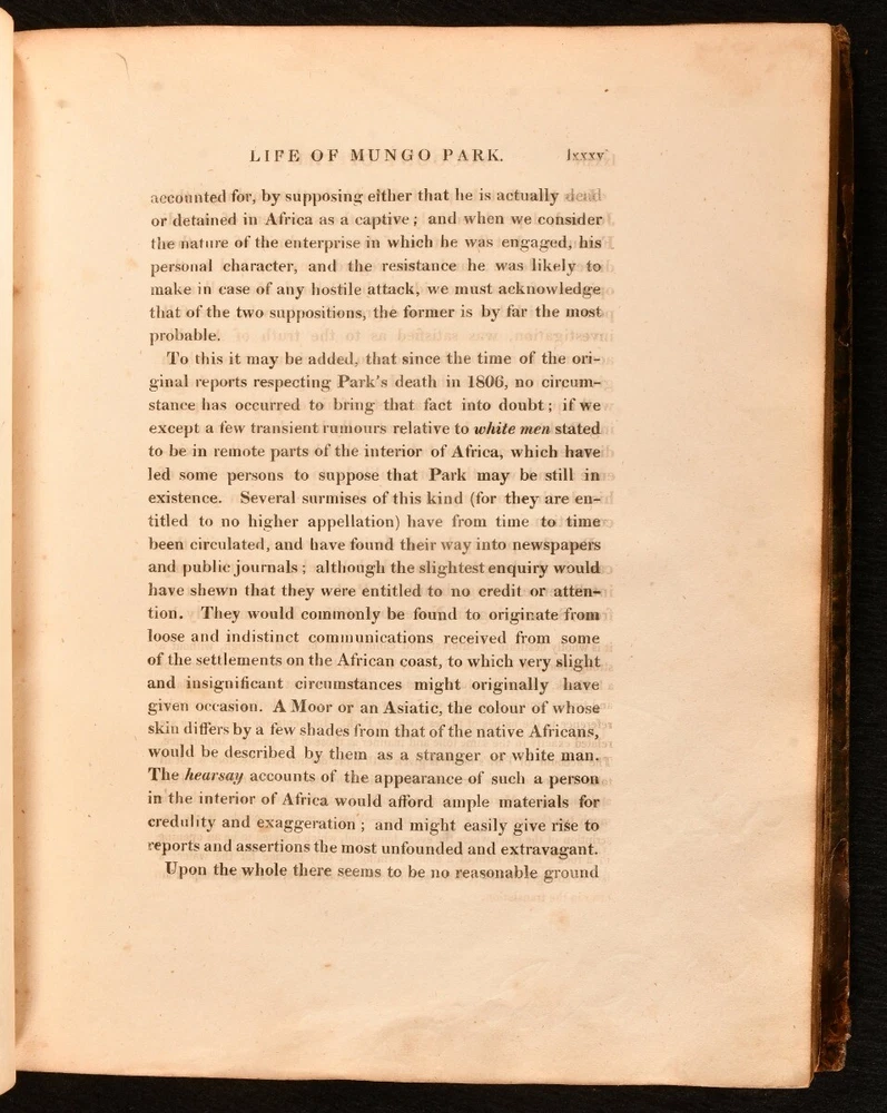 Click here to see our other books! The Journal of a Mission the Interior of Africa in the Year 1805 Mungo Park 1815 John Murray : London 11" by 9" [12], cxxx, [2], 219pp SUMMARY The scarce and sought after first edition of this account of Mungo Park's final mission to Africa, illustrated with a detailed folding map. First Edition,Folding Maps,Illustrated,Leather Binding,Scarce Overall Condition: Good Only This book weighs 1.5 KG when packed UK Postage: £ 3.99 US Postage: £ 23.99 EU Postage : £ 18.99 European Postage: £ 19.99 Asia Postage: £ 31.99 Worldwide Postage: £ 32.99 DESCRIPTION The sought after scarce first edition of this work. Half-title is present. Illustrated with a folding map. The important travel journal of Mungo Park, recounting Park's final expedition, compiled from a variety of original documents from Park's last mission into Africa. This work is the continuation of Park's earlier publication 'Travels in the Interior Districts of Africa'. Park was one of the first successful European explorers of Africa, the first Westerner recorded to travel to the center of the Niger. His travels inspired further Western exploration of the continent of Africa. He was killed during his second African expedition, after having travelled down two-thirds of the Niger River. This volume includes the journal of Isaaco, an African who was commissioned with trying to search for and find the fate of Park. Collated, bound without 'Addenda to the Account of the Life of Mungo Park' to the rear. Bookplate of Sir Felix Calvert Mackenzie to the front paste down. Mackenzie was a solicitor, knighted on the occasion of Queen Victoria's Diamond Jubilee in 1897. CONDITION In a half calf binding with marbled paper to the boards. Externally, front board is detached but present. Rubbing to the boards and spine, resulting in some loss of paper and leather. Rear joint is starting, with loss of leather. A small amount of loss to the head and tail of the spine, heavier to the tail. Loss to roughly half to the spine label. Minor bumping to the extremities. Rear hinge is reinforced. Bookplate to the front paste down. Blind stamp to the rear endpaper. Lacking the front endpaper. Internally, firmly bound. Pages are lightly age-toned with the occasional spot and ink mark. Small closed tears to the folds of the folding map. Heavy wear to the first few pages, from the half title to page viii, affecting a total of twenty pages; loss to part of the text to the title page, and loss to thirty-two lines of text to the first four pages of the advertisement; loss is significantly heavier to the two page contents, half-title of 'Account of the Life of Mungo Park', and to the first six pages of 'Life', with loss to about half of the pages. Overall Condition: Good Only GLOSSARY OF TERMS Overall Condition (Dustwrapper condition rating is shown after that for the book itself, where a dustwrapper is present) Fine - Very well preserved copy showing very little wear Very Good Indeed - Only one or two minor faults, really a very attractive copy Very Good - Quite a wide term meaning no major faults but probably several smaller ones often expected given the age of the book, but still a respectable copy Good - Meaning not very good. Some more serious faults as will be described in the condition report under 'condition' Good Only - Meaning one or more faults that could really do with repair Fair - As with good only above but with other faults leaving a compromised copy even after repair Poor - Really bad and possibly seriously incomplete. We only sell books in this condition where their rarity or value makes them attractive none the less. Major defects will be described. GUARANTEE We offer a full money back guarantee on our descriptions. Please ask for details and conditions. We prefer PAYPAL. If you pay via PAYPAL we will post the item off the same or the next working day with the postage you have selected. Please note we cannot accept USD cheques