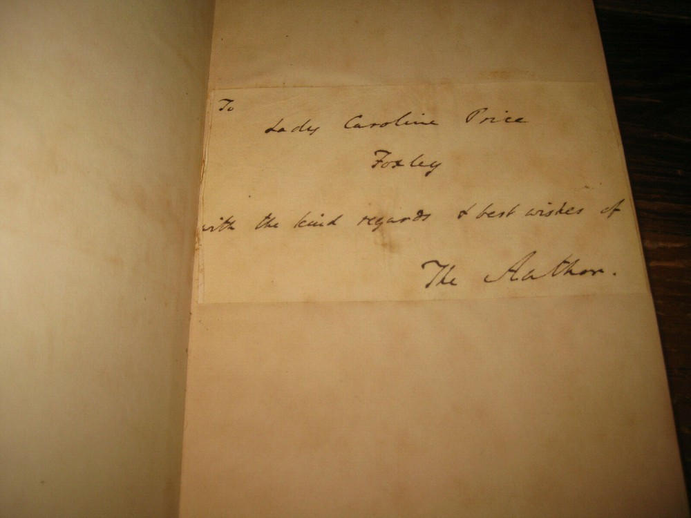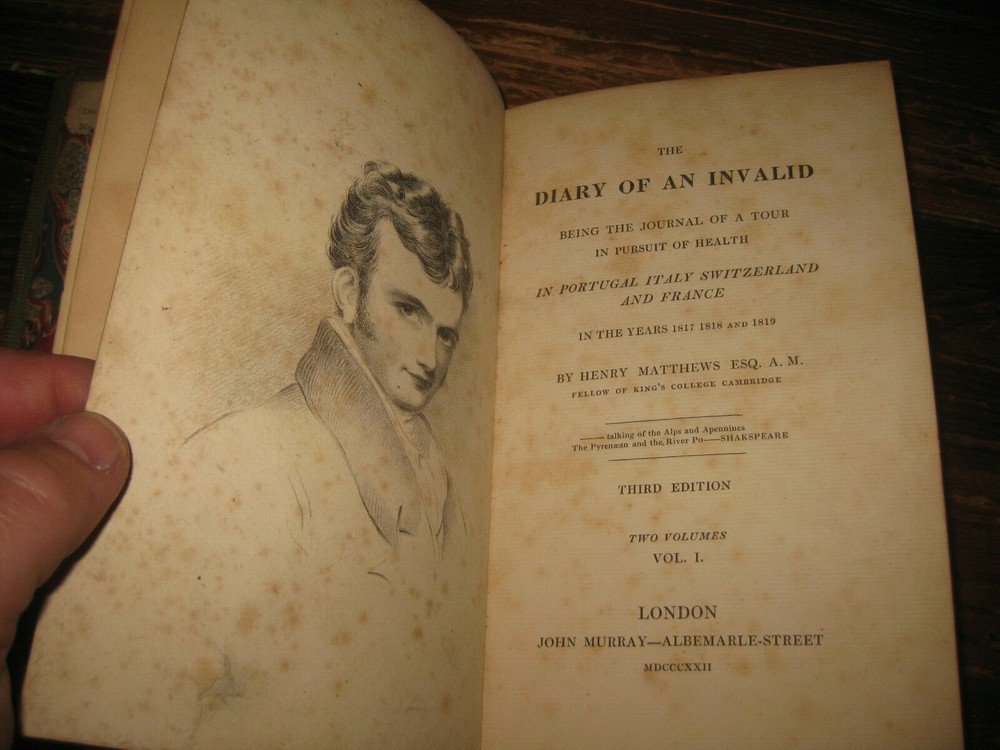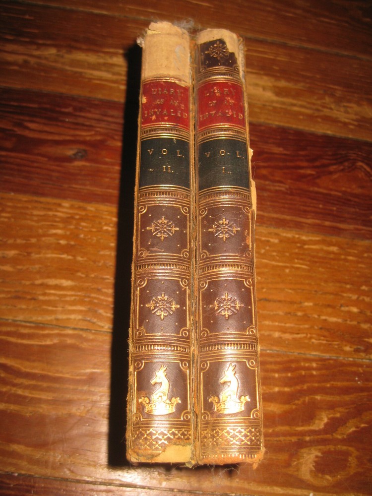 1822 Leather bound DIARY OF AN INVALID 2 volume set inscribed by author Henry Mathews to baroness Lady Caroline Price of Foxley...full title THE DIARY OF AN INVALID Being the Journal of a Tour in Pursuit of Health in Portugal, Italy, Switzerland and France in the Years 1817, 1818 and 1819 by Henry Matthews...In poor condition, loose boards, binding chipping and mild foxing, needs to be rebound but all pages still bound...inscribed...