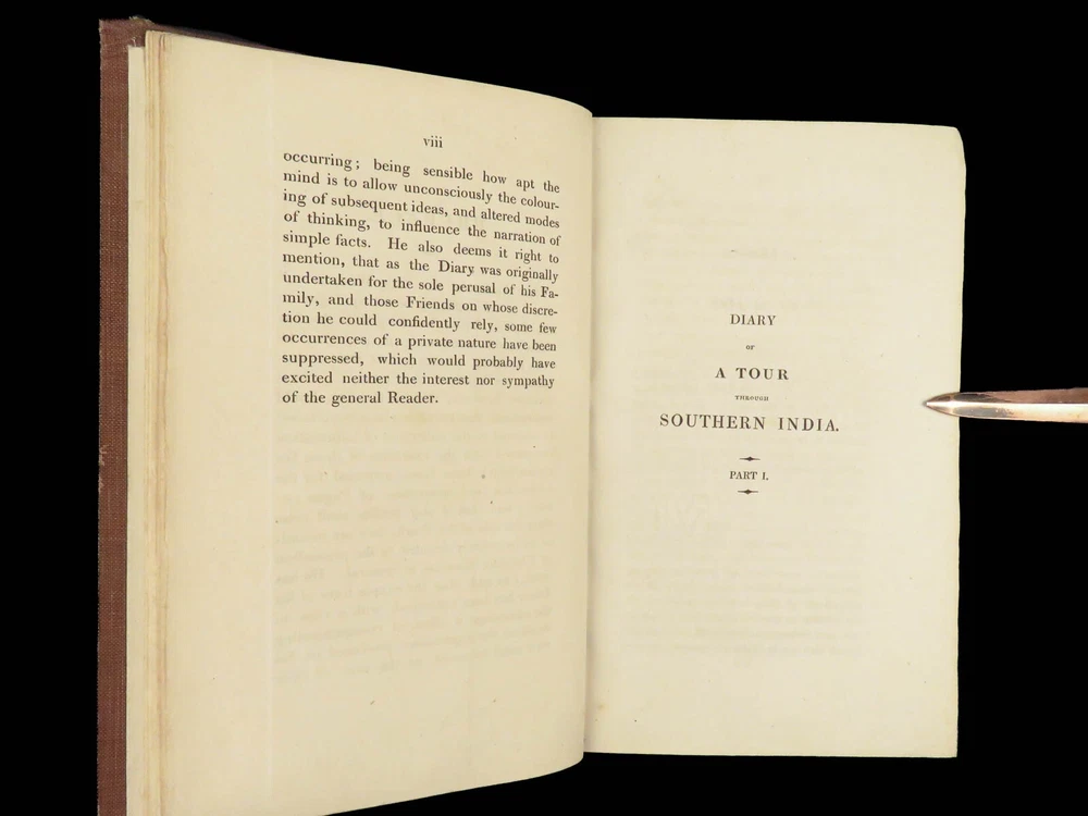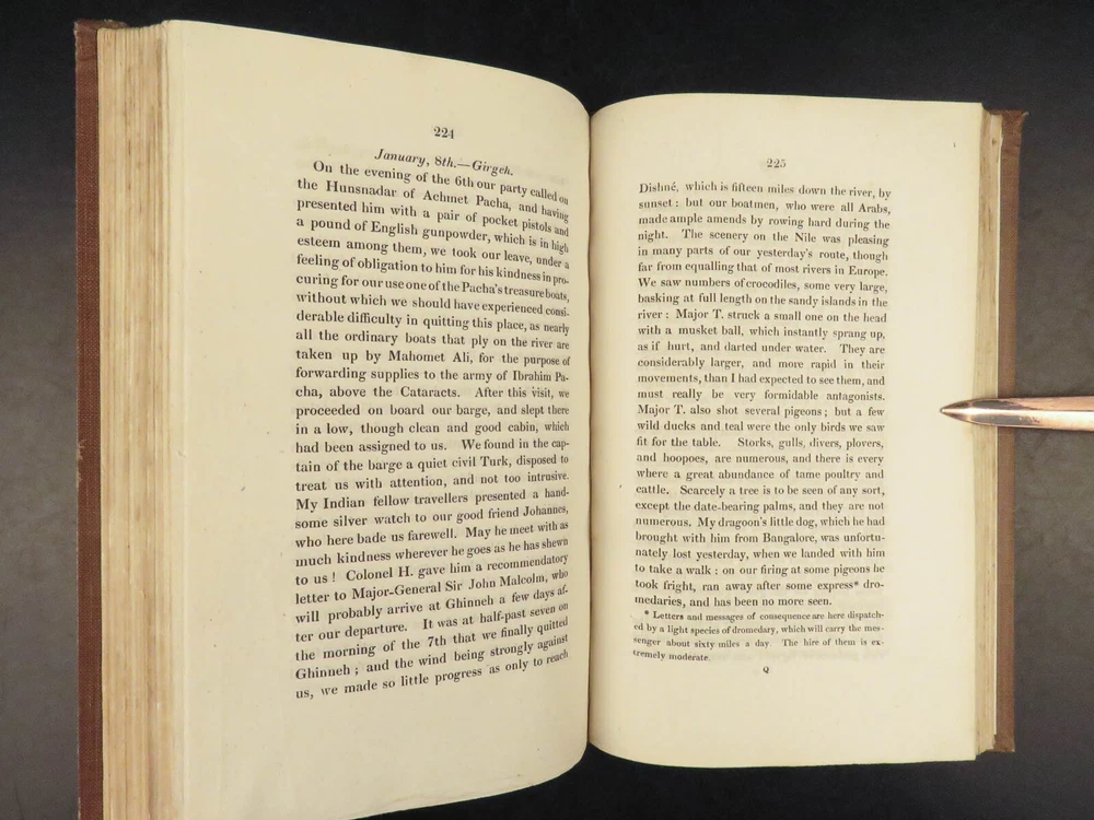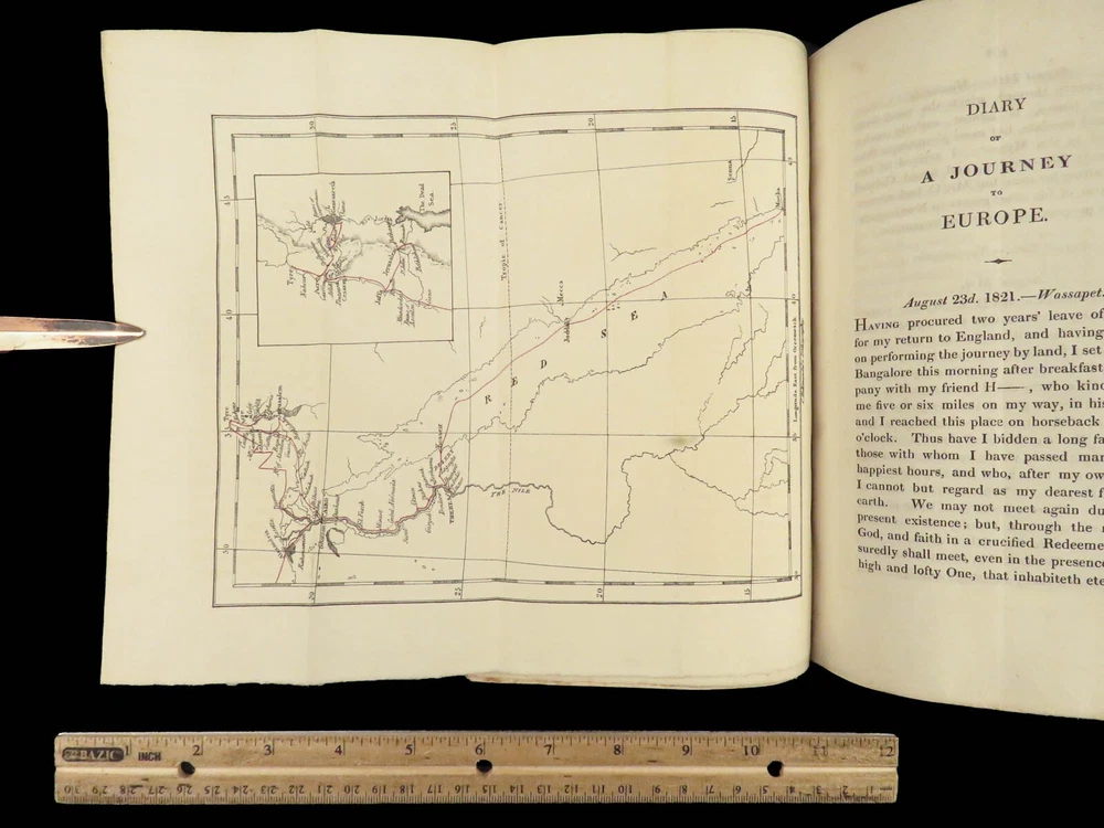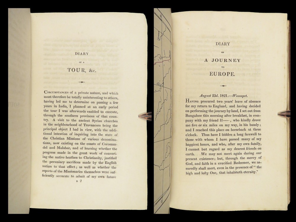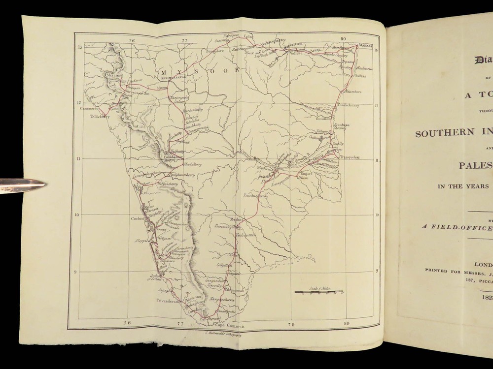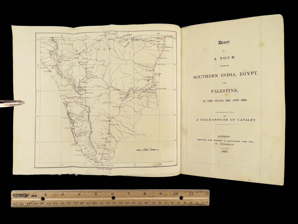 1823 Diary of Tour in EGYPT South INDIA Palestine MAPS Voyages Digby Mackworth Digby Mackworth’s “ Diary of a Tour ” was the English military officer’s travelogue of his voyages in India, Egypt, and Palestine. This journal offers a first hand, yet accurate account of Egypt, Southern India and the Middle East as it was during the early part of the 19 th -century. Mackworth includes impressive illustrations of the things he encountered – bridges, desert homes, and landscapes. Though, without question, the most desirable aspect of this work is the highly coveted folding maps of Southern India and Egypt near the Red Sea. Item number: #24601 Price: $499 MACKWORTH, Digby Diary of a tour through southern India, Egypt, and Palestine, in the years 1821 and 1822 London: Printed for Messrs. J. Hatchard and Son, 1823. 1 st edition Details : · Collation: Complete with all pages o [8], 372 o 2 folding maps o 2 engraved plates · Provenance: Handwritten – [ Valeri Siddall ] · Language: English · Binding: Leather; tight and secure · Size : ~9in X 5.75in (22.5cm x 14.5cm) Our Guarantee: Very Fast. Very Safe. Free Shipping Worldwide. Customer satisfaction is our priority! Notify us with 7 days of receiving, and we will offer a full refund without reservation! 24601
