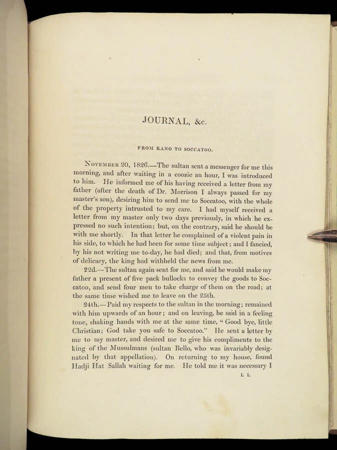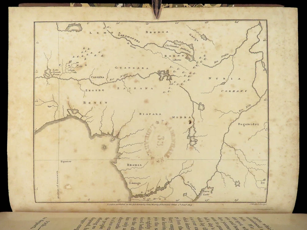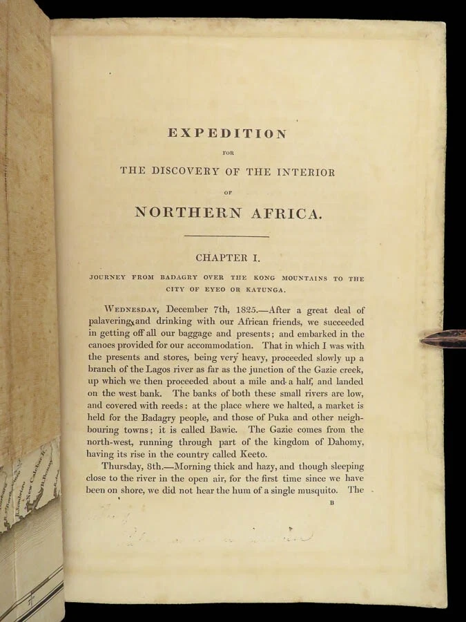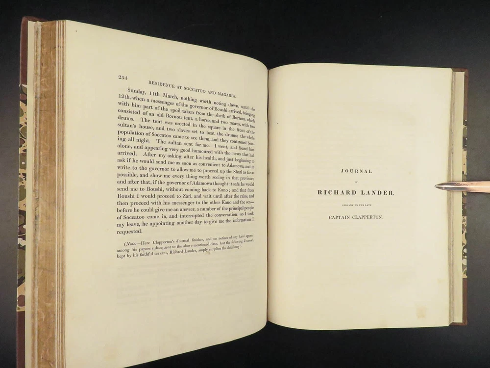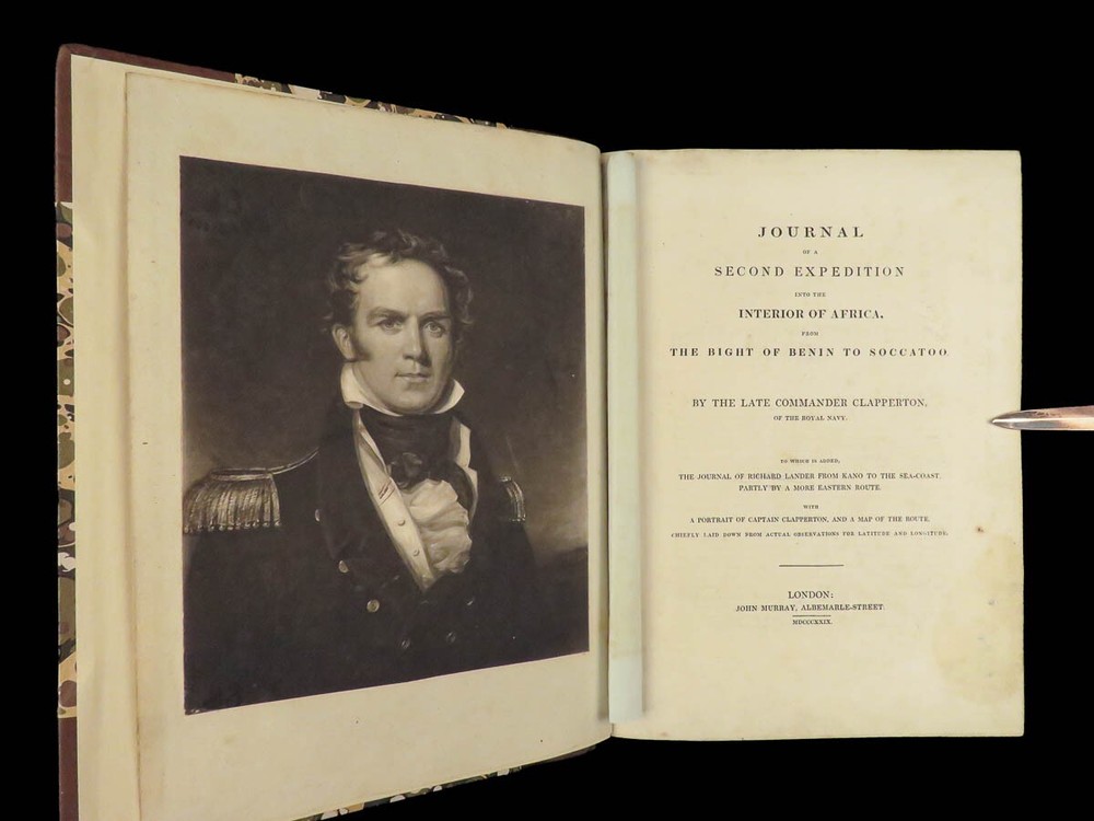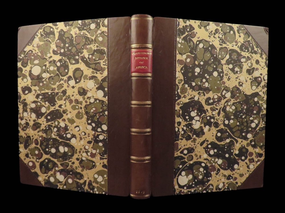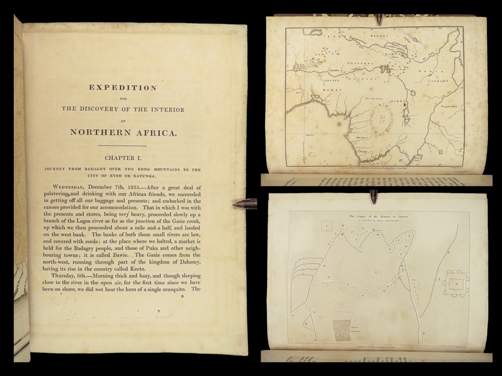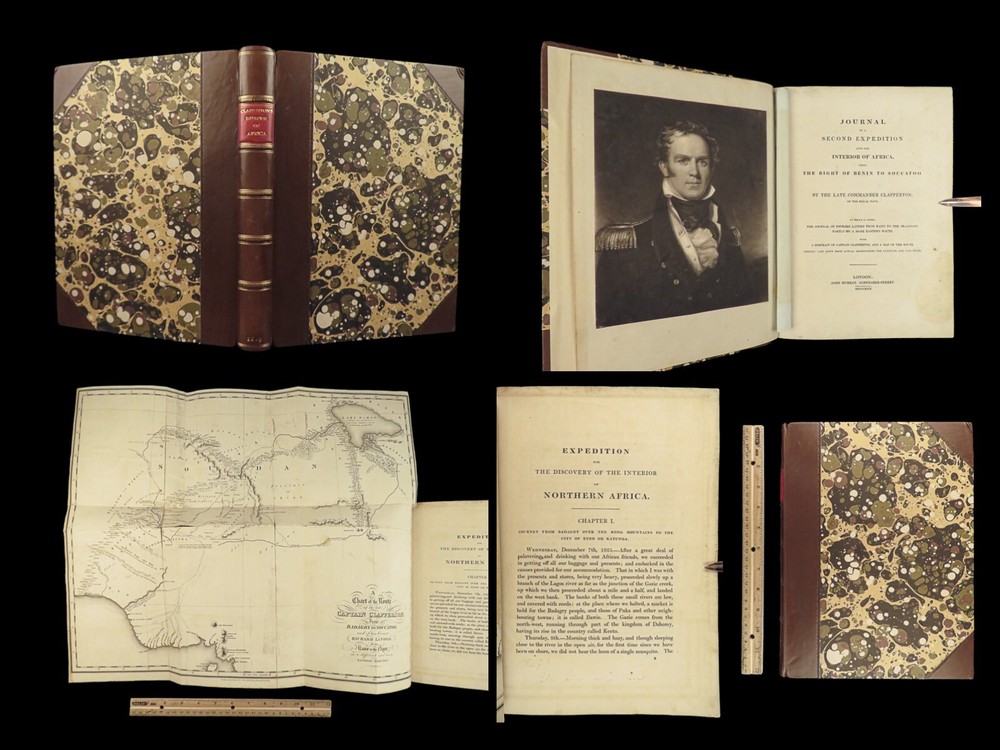 1829 AFRICA Voyages Slavery 1 ed Clapperton Journal Slaves Mungo Park HUGE MAP Hugh Clapperton and Dixon Denham were 19 th -century English explorers who is best known for their 1822 African expedition. While there, Denham and crew encountered numerous slave-trade exploits and did their part to rescue slaves. Following the mission, Denham and Clapperton aided the British plan to help settle rescued slaves in England. In 1829, following Clapperton’s second voyage to Africa, he published an expedition memoir, describing the events of the journey, descriptions of cities and villages near the Nile River, and the curious findings of Clapperton’s investigation into the death of Mungo Park. This impressive first edition of Clapperton’s ‘Journal’ includes the highly coveted large folding map! Item number: #24017 Price: $750 CLAPPERTON, Hugh Journal of a second expedition into the interior of Africa, from the bight of Benin to Soccato London : J. Murray, 1829. First edition. Details : · Collation: Complete with all pages o xxiii, [5], 355, [1] o Large folding map o 3 engravings · References: · Language: English · Binding: Leather; tight and secure · Size : ~11in X 8.5in (28cm x 21.5cm) Our Guarantee: Very Fast. Very Safe. Free Shipping Worldwide. Customer satisfaction is our priority! Notify us with 7 days of receiving, and we will offer a full refund without reservation! 24017