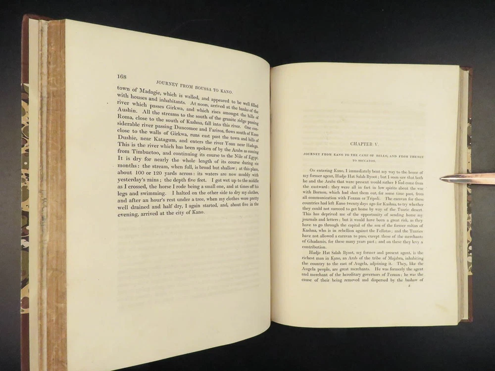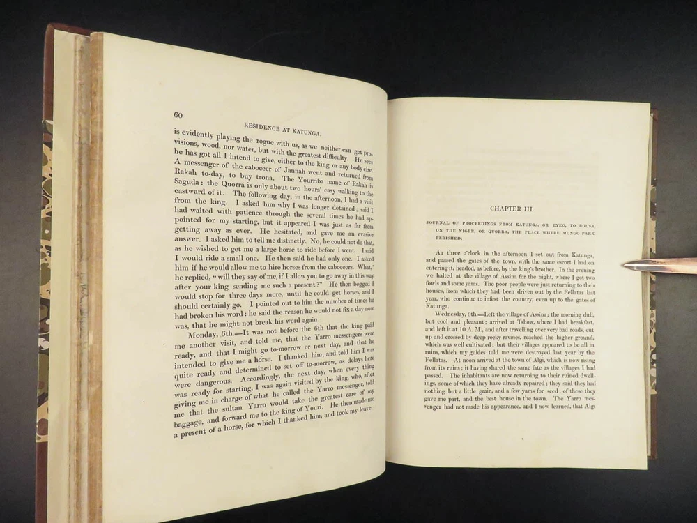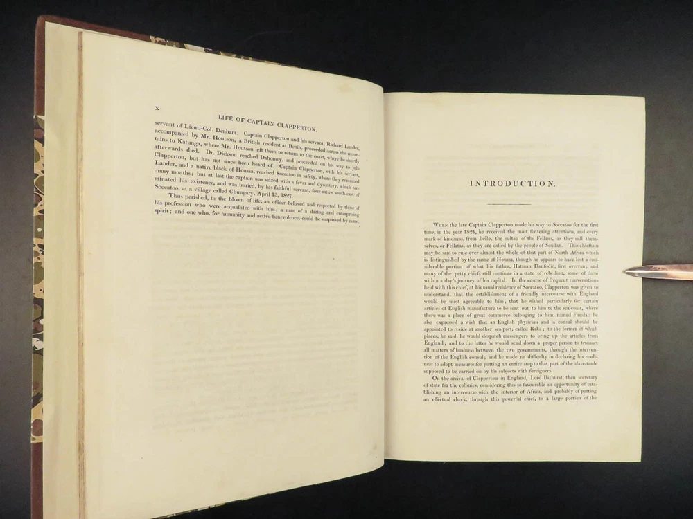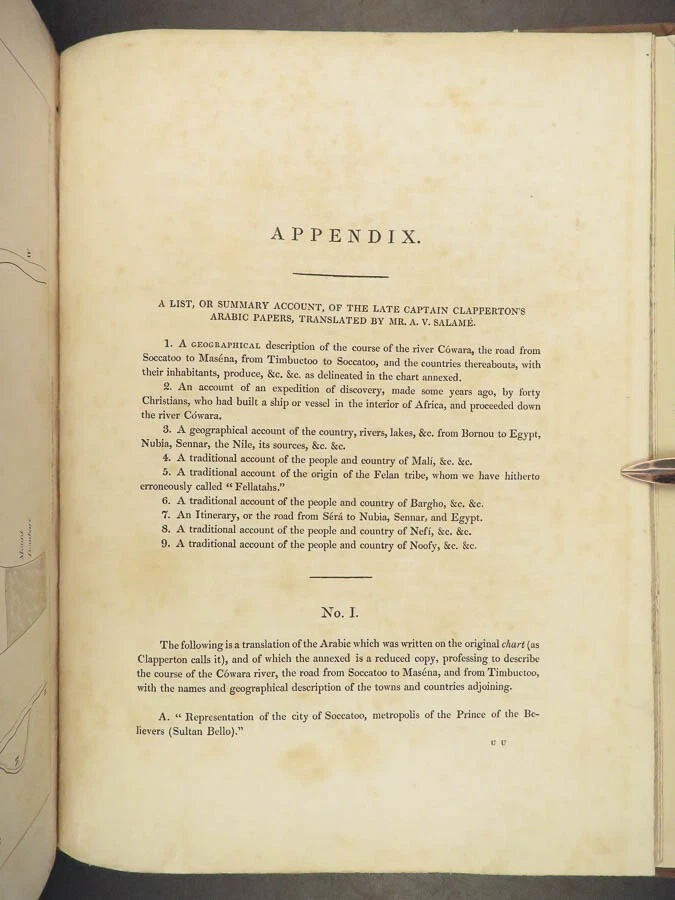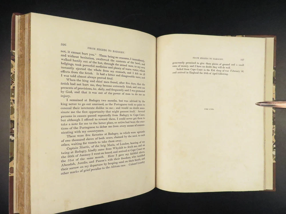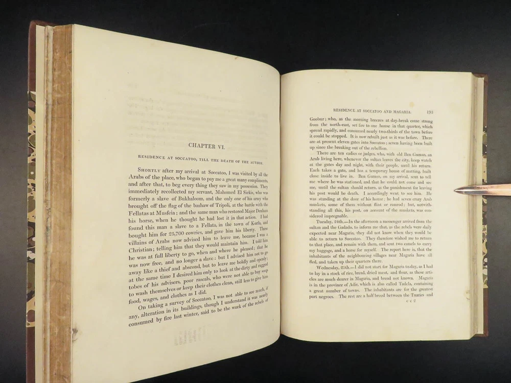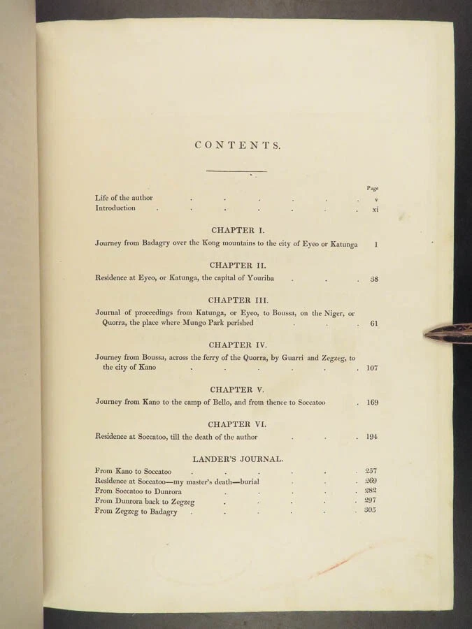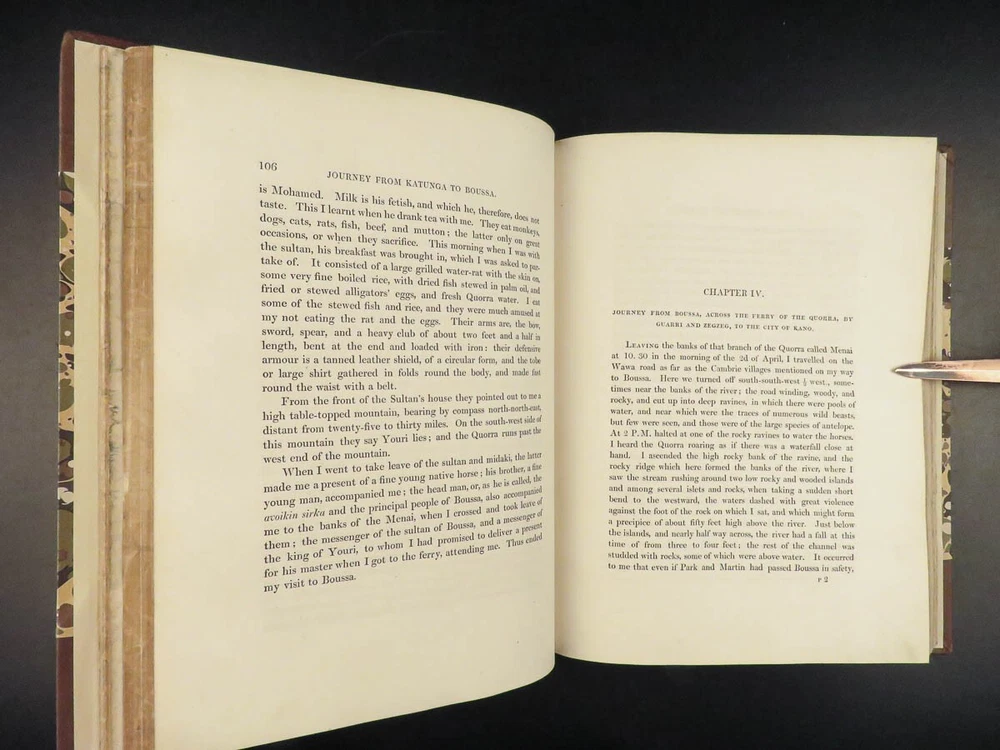 1829 AFRICA Voyages Slavery 1 ed Clapperton Journal Slaves Mungo Park HUGE MAP Hugh Clapperton and Dixon Denham were 19 th -century English explorers who is best known for their 1822 African expedition. While there, Denham and crew encountered numerous slave-trade exploits and did their part to rescue slaves. Following the mission, Denham and Clapperton aided the British plan to help settle rescued slaves in England. In 1829, following Clapperton’s second voyage to Africa, he published an expedition memoir, describing the events of the journey, descriptions of cities and villages near the Nile River, and the curious findings of Clapperton’s investigation into the death of Mungo Park. This impressive first edition of Clapperton’s ‘Journal’ includes the highly coveted large folding map! Item number: #24017 Price: $750 CLAPPERTON, Hugh Journal of a second expedition into the interior of Africa, from the bight of Benin to Soccato London : J. Murray, 1829. First edition. Details : · Collation: Complete with all pages o xxiii, [5], 355, [1] o Large folding map o 3 engravings · References: · Language: English · Binding: Leather; tight and secure · Size : ~11in X 8.5in (28cm x 21.5cm) Our Guarantee: Very Fast. Very Safe. Free Shipping Worldwide. Customer satisfaction is our priority! Notify us with 7 days of receiving, and we will offer a full refund without reservation! 24017