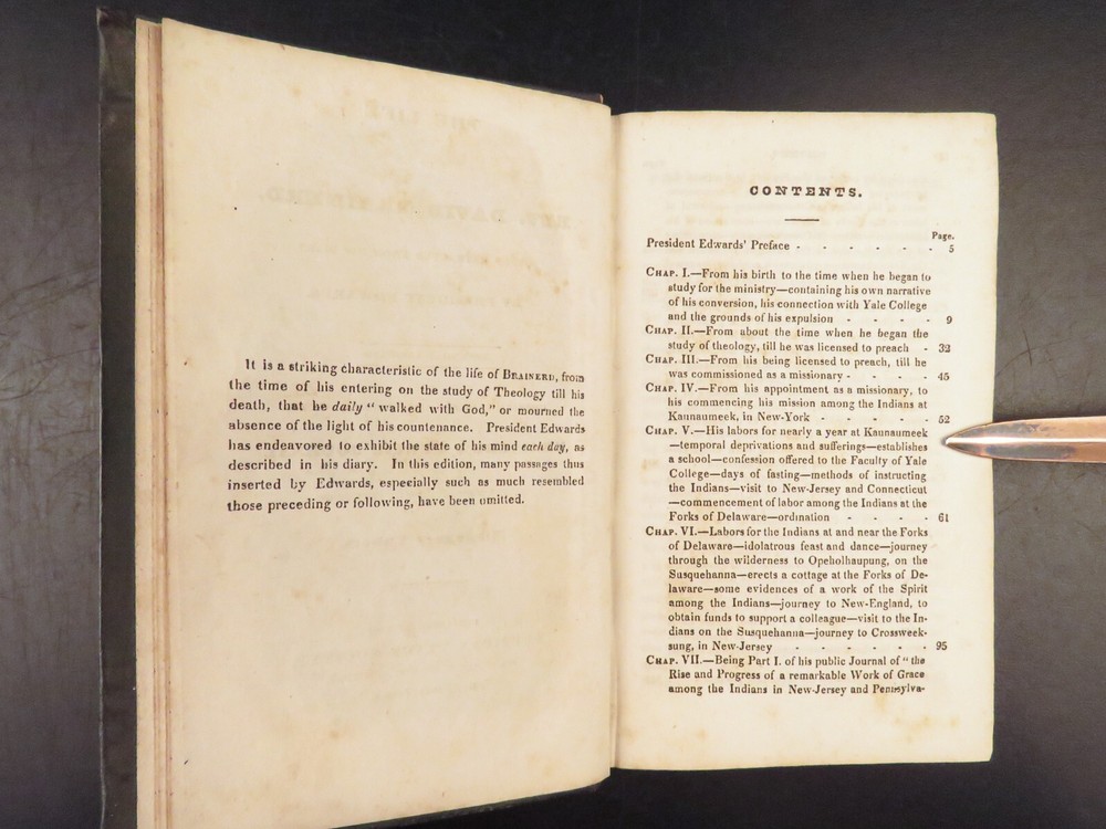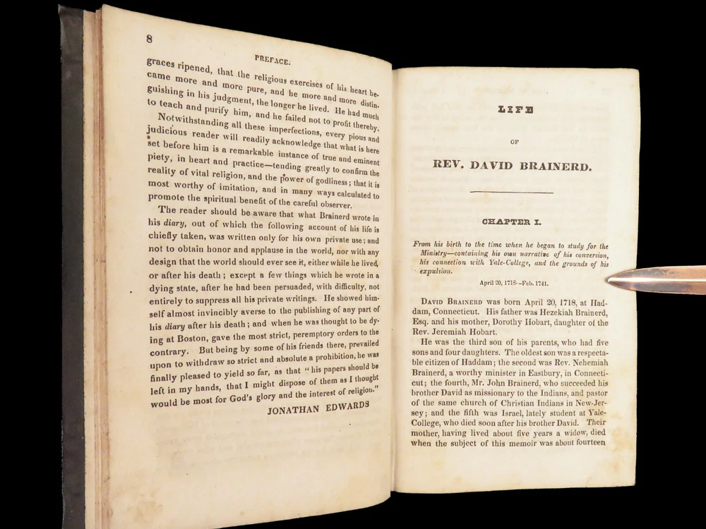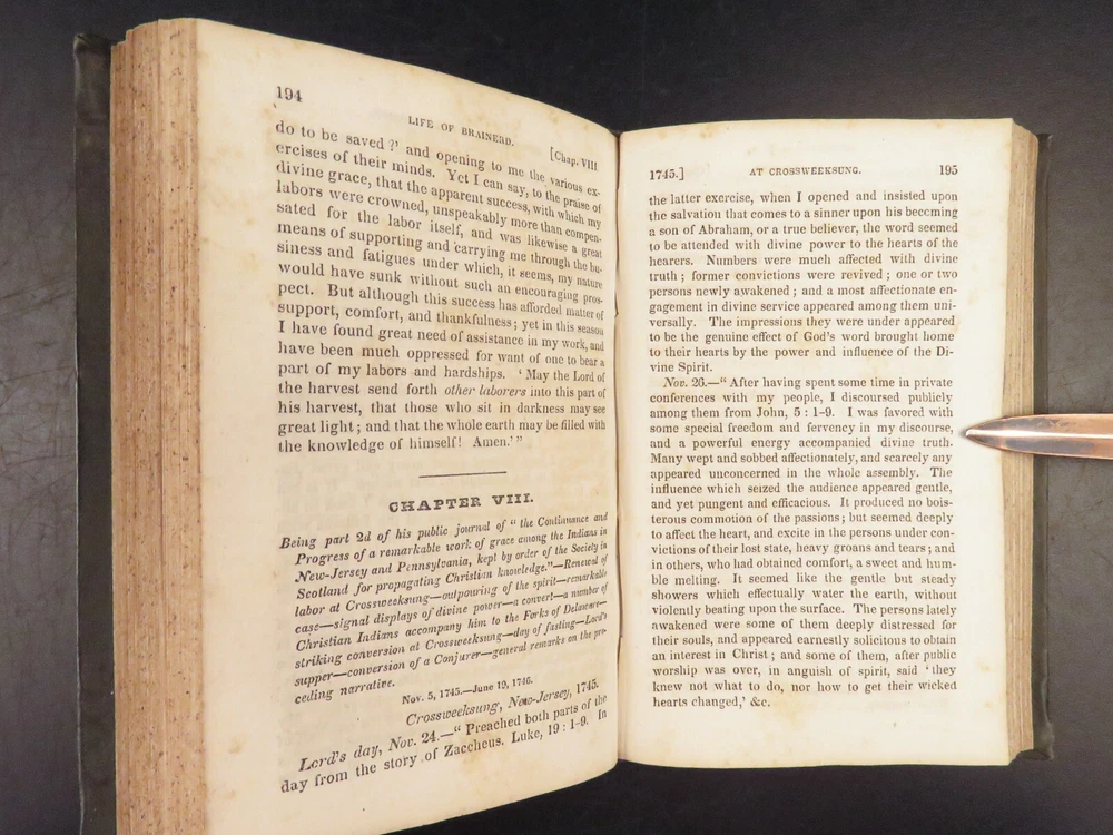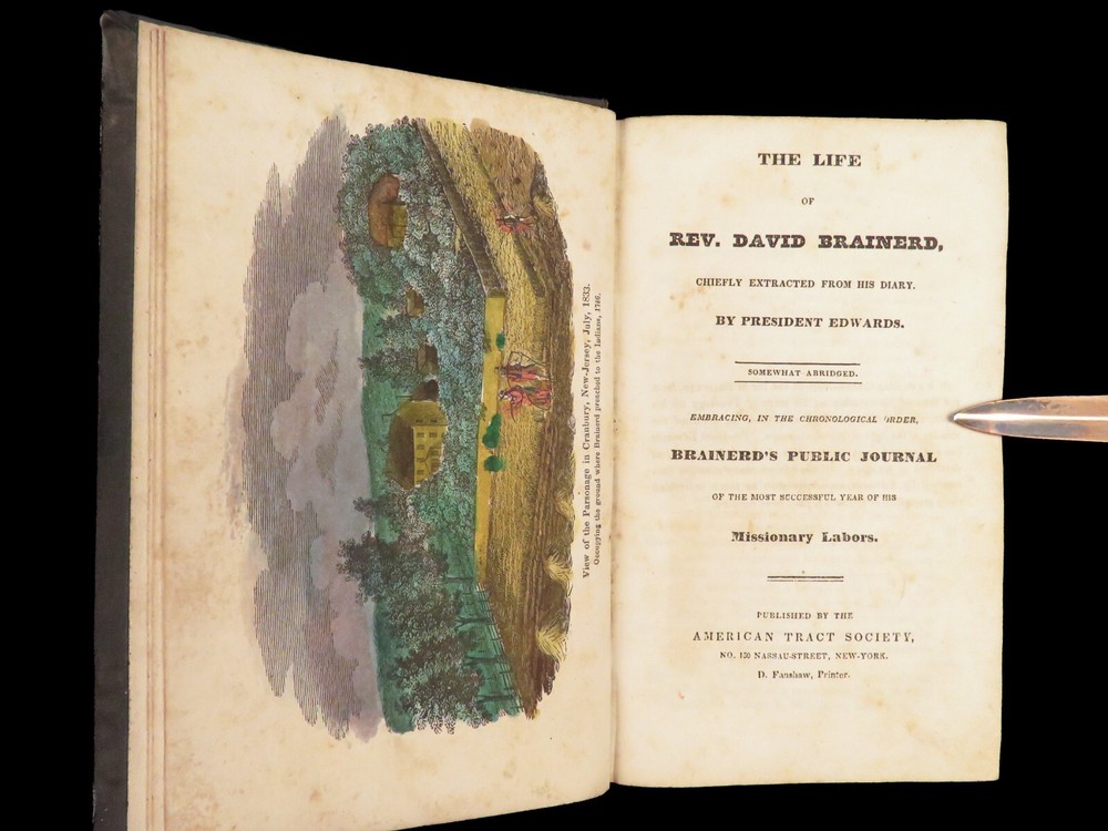 1830 David Brainerd Native American INDIAN Missionary Puritan Edwards Scottish ‘ The Life of David Brainerd’ is a biographical account of the famous evangelical missionary by theologian Jonathan Edwards. Edwards took Brainerd’s personal diary and edited and published it as a report on Brainerd’s missions to the Native Americans in Delaware and New Jersey. While Edwards left most of the diary intact, he changed a large portion of the work to present Brainerd as the antithesis to Arminianism. ‘ Life’ had a major influence on the way that Native Americans were portrayed to the American and English public. Item number: #26942 Price: $499 EDWARDS, Jonathan The life of Rev. David Brainerd, chiefly extracted from his diary New York: The American Tract Society, [ca. 1830s]. Details : · Collation: complete with all pages o IV, 5-360 · References: Howes E 56; Sabin 21927; Evans 6311; ESTC W 10110; Field 486; Larned 2992 · Provenance: Handwritten o [ Mrs. H. Torcree ] o H. E. Perkins · Language: English · Binding: Leather; tight and secure · Size : ~6in X 4in (15.5cm x 10cm) Our Guarantee: Very Fast. Very Safe. Free Shipping Worldwide. Customer satisfaction is our priority! Notify us with 7 days of receiving, and we will offer a full refund without reservation!
