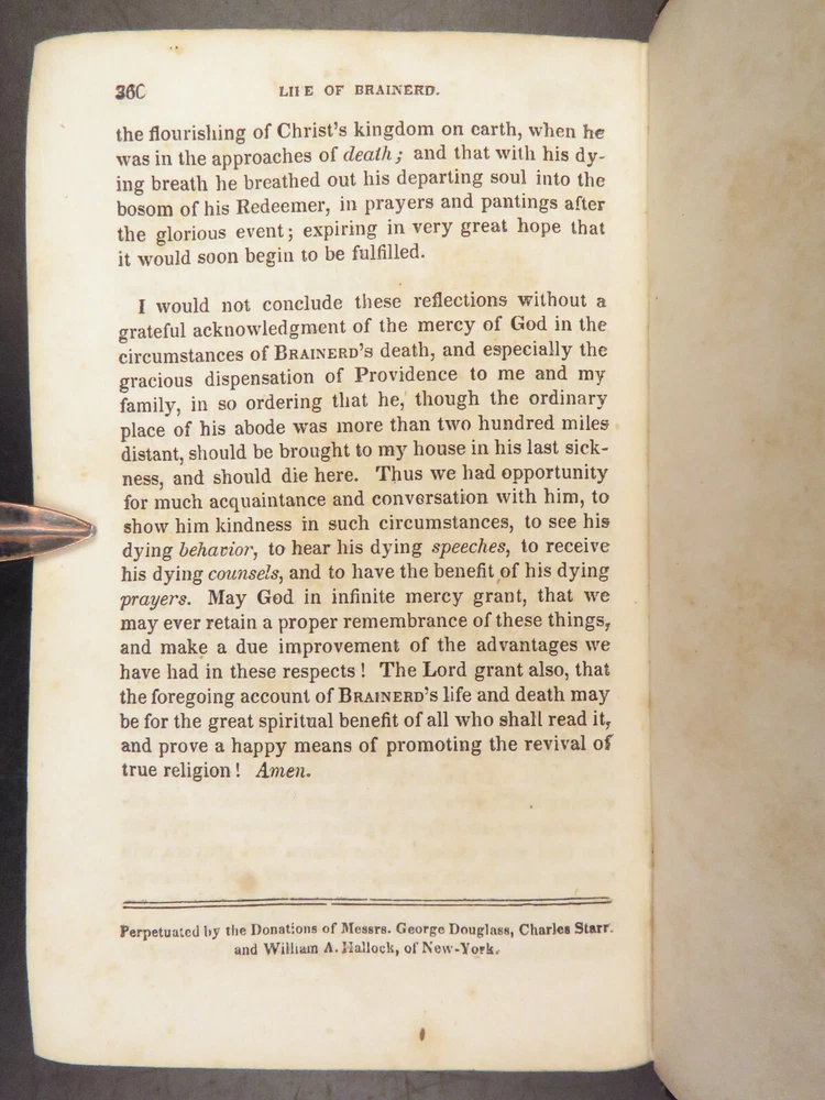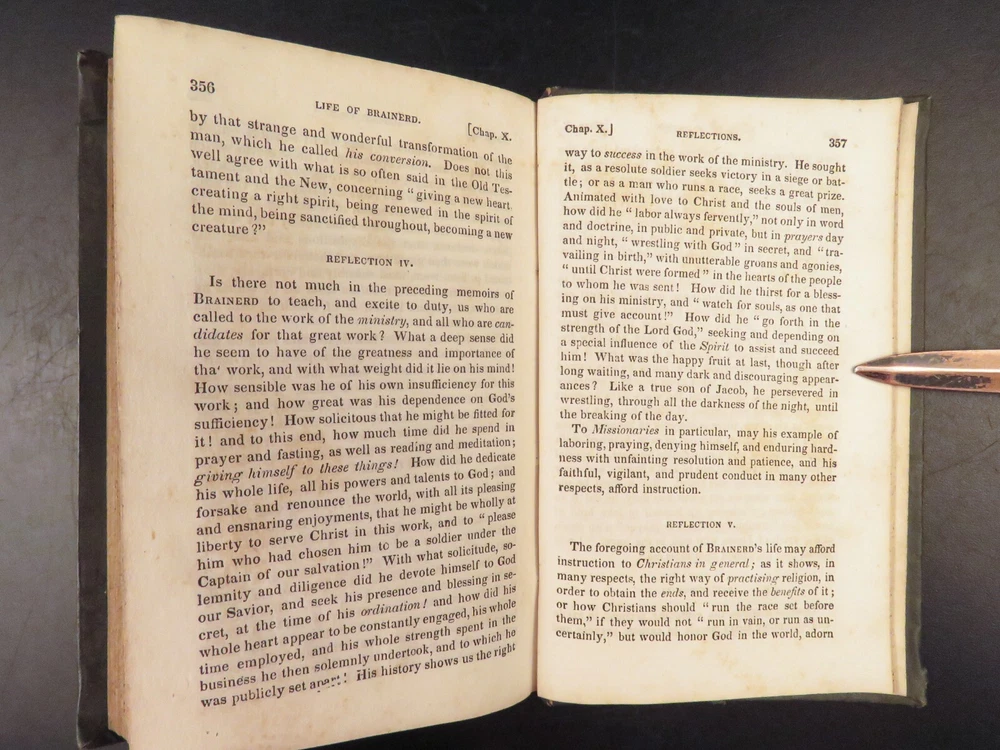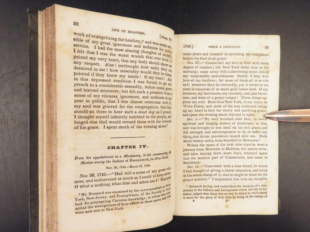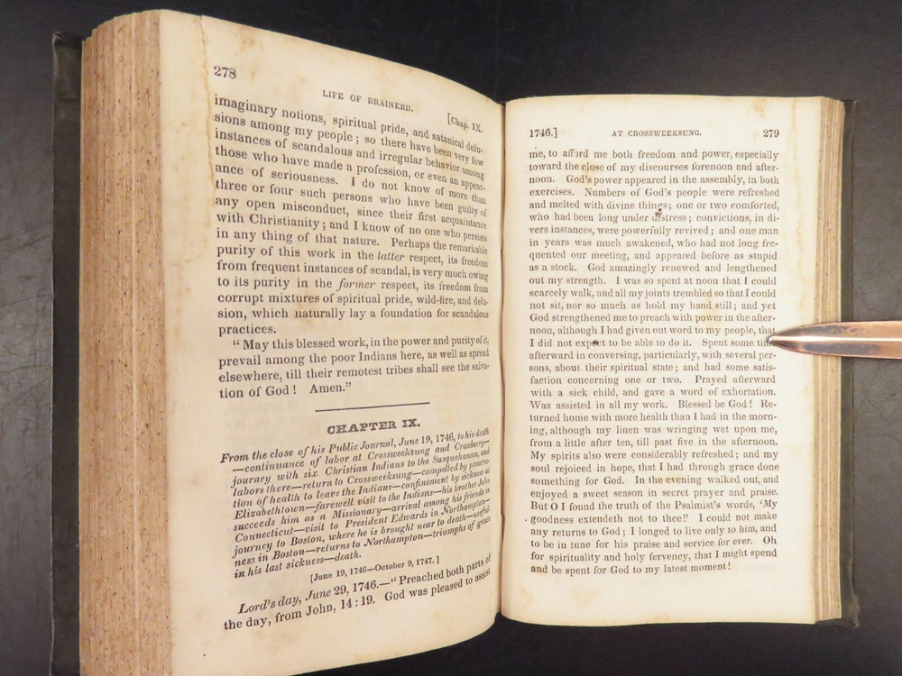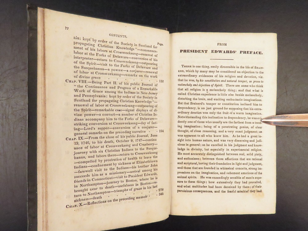 1830 David Brainerd Native American INDIAN Missionary Puritan Edwards Scottish ‘ The Life of David Brainerd’ is a biographical account of the famous evangelical missionary by theologian Jonathan Edwards. Edwards took Brainerd’s personal diary and edited and published it as a report on Brainerd’s missions to the Native Americans in Delaware and New Jersey. While Edwards left most of the diary intact, he changed a large portion of the work to present Brainerd as the antithesis to Arminianism. ‘ Life’ had a major influence on the way that Native Americans were portrayed to the American and English public. Item number: #26942 Price: $499 EDWARDS, Jonathan The life of Rev. David Brainerd, chiefly extracted from his diary New York: The American Tract Society, [ca. 1830s]. Details : · Collation: complete with all pages o IV, 5-360 · References: Howes E 56; Sabin 21927; Evans 6311; ESTC W 10110; Field 486; Larned 2992 · Provenance: Handwritten o [ Mrs. H. Torcree ] o H. E. Perkins · Language: English · Binding: Leather; tight and secure · Size : ~6in X 4in (15.5cm x 10cm) Our Guarantee: Very Fast. Very Safe. Free Shipping Worldwide. Customer satisfaction is our priority! Notify us with 7 days of receiving, and we will offer a full refund without reservation!