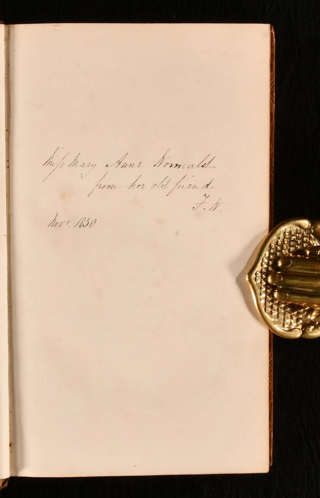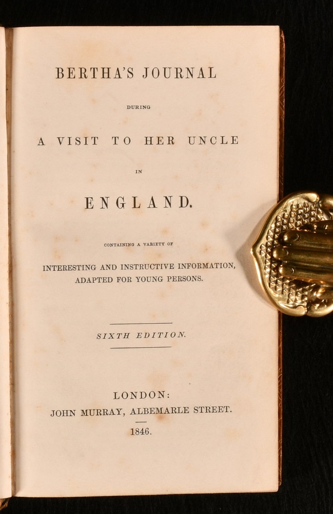 Click here to see our other books! Bertha's Journal During a Visit to Her Uncle in England Bertha 1846 John Murray : London 7" by 4" [5], vi-xii, 492pp SUMMARY A very scarce charming children's novel about a young girl's journey to England, written by Jane Marcet. Leather Binding,Very Scarce Overall Condition: Very Good This book weighs 0.75 KG when packed UK Postage: £ 3.99 US Postage: £ 19.99 EU Postage : £ 15.99 European Postage: £ 16.99 Asia Postage: £ 21.99 Worldwide Postage: £ 25.99 DESCRIPTION A very scarce work. A charming children's novel, documenting a girl's journey from Rio Janeiro to England, set over forty-five weeks. Illustrated with a frontispiece. Written by Jane Marcet, a British salonniere and author, an innovate writer of popular introductory science books. Prior owner's ink inscription to the recto to the front free endpaper. CONDITION In a full calf binding. Externally, generally smart. Minor marks and rubbing to the boards and spine. Prior owner's ink inscription to the recto to the front free endpaper. Internally, firmly bound. Pages are bright and generally clean with the odd spot, mostly to the first and last few pages. Overall Condition: Very Good GLOSSARY OF TERMS Overall Condition (Dustwrapper condition rating is shown after that for the book itself, where a dustwrapper is present) Fine - Very well preserved copy showing very little wear Very Good Indeed - Only one or two minor faults, really a very attractive copy Very Good - Quite a wide term meaning no major faults but probably several smaller ones often expected given the age of the book, but still a respectable copy Good - Meaning not very good. Some more serious faults as will be described in the condition report under 'condition' Good Only - Meaning one or more faults that could really do with repair Fair - As with good only above but with other faults leaving a compromised copy even after repair Poor - Really bad and possibly seriously incomplete. We only sell books in this condition where their rarity or value makes them attractive none the less. Major defects will be described. GUARANTEE We offer a full money back guarantee on our descriptions. Please ask for details and conditions. We prefer PAYPAL. If you pay via PAYPAL we will post the item off the same or the next working day with the postage you have selected. Please note we cannot accept USD cheques