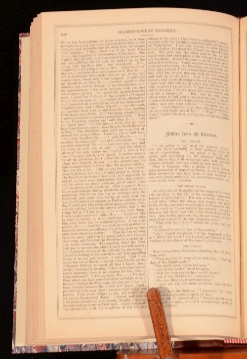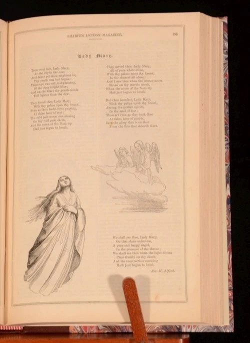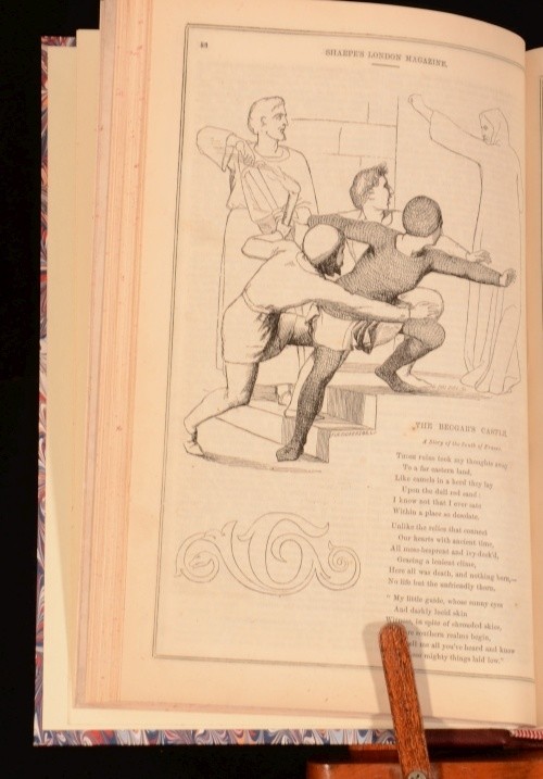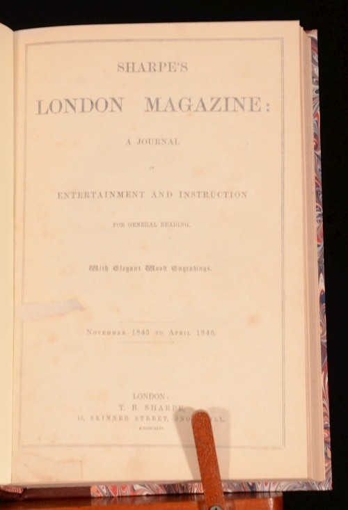 Click here to see our other books! Sharpe's London Magazine of Entertainment and Instruction for General Reading Various 1846 T B Sharpe : London 10" by 6.5" 416pp SUMMARY A collection of issues of Sharpe's London Magazine of Entertainment. Leather Binding Overall Condition: Very Good Indeed This book weighs 1 KG when packed UK Postage: £ 3.99 US Postage: £ 22.99 EU Postage : £ 16.99 European Postage: £ 17.99 Asia Postage: £ 22.99 Worldwide Postage: £ 28.99 DESCRIPTION Containing poems and short stories (including The Chances of Fortune, Marco Visconti, and The Bound Towers of Ireland). Illustrated throughout with engravings in the text. Covering November 1845-April 1846. CONDITION Rebound in a quarter-morocco binding with marbled boards. Externally, very smart. Internally, firmly bound. Pages are bright, though with some scattered light spotting. Overall Condition: Very Good Indeed GLOSSARY OF TERMS Overall Condition (Dustwrapper condition rating is shown after that for the book itself, where a dustwrapper is present) Fine - Very well preserved copy showing very little wear Very Good Indeed - Only one or two minor faults, really a very attractive copy Very Good - Quite a wide term meaning no major faults but probably several smaller ones often expected given the age of the book, but still a respectable copy Good - Meaning not very good. Some more serious faults as will be described in the condition report under 'condition' Good Only - Meaning one or more faults that could really do with repair Fair - As with good only above but with other faults leaving a compromised copy even after repair Poor - Really bad and possibly seriously incomplete. We only sell books in this condition where their rarity or value makes them attractive none the less. Major defects will be described. GUARANTEE We offer a full money back guarantee on our descriptions. Please ask for details and conditions. We prefer PAYPAL. If you pay via PAYPAL we will post the item off the same or the next working day with the postage you have selected. Please note we cannot accept USD cheques