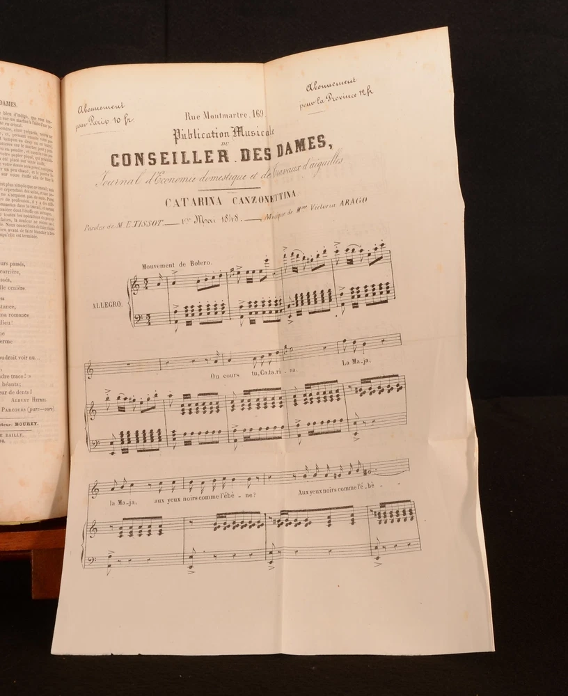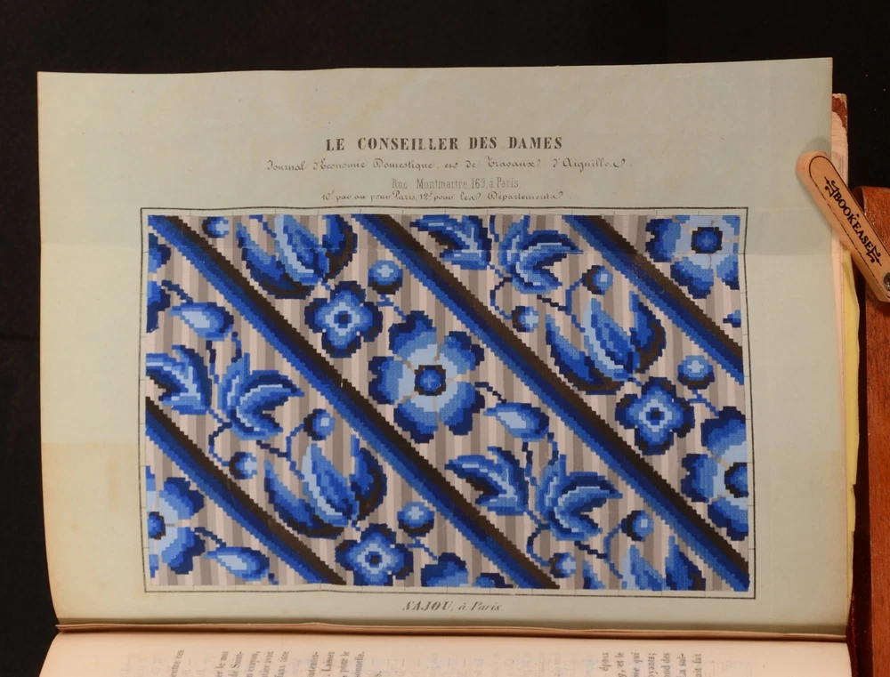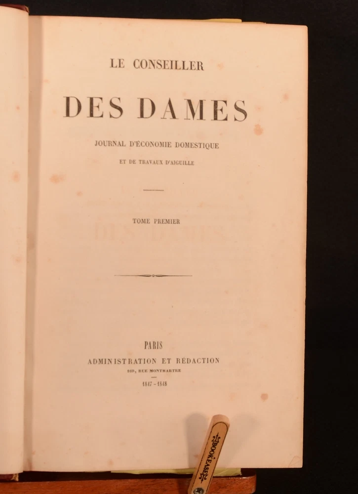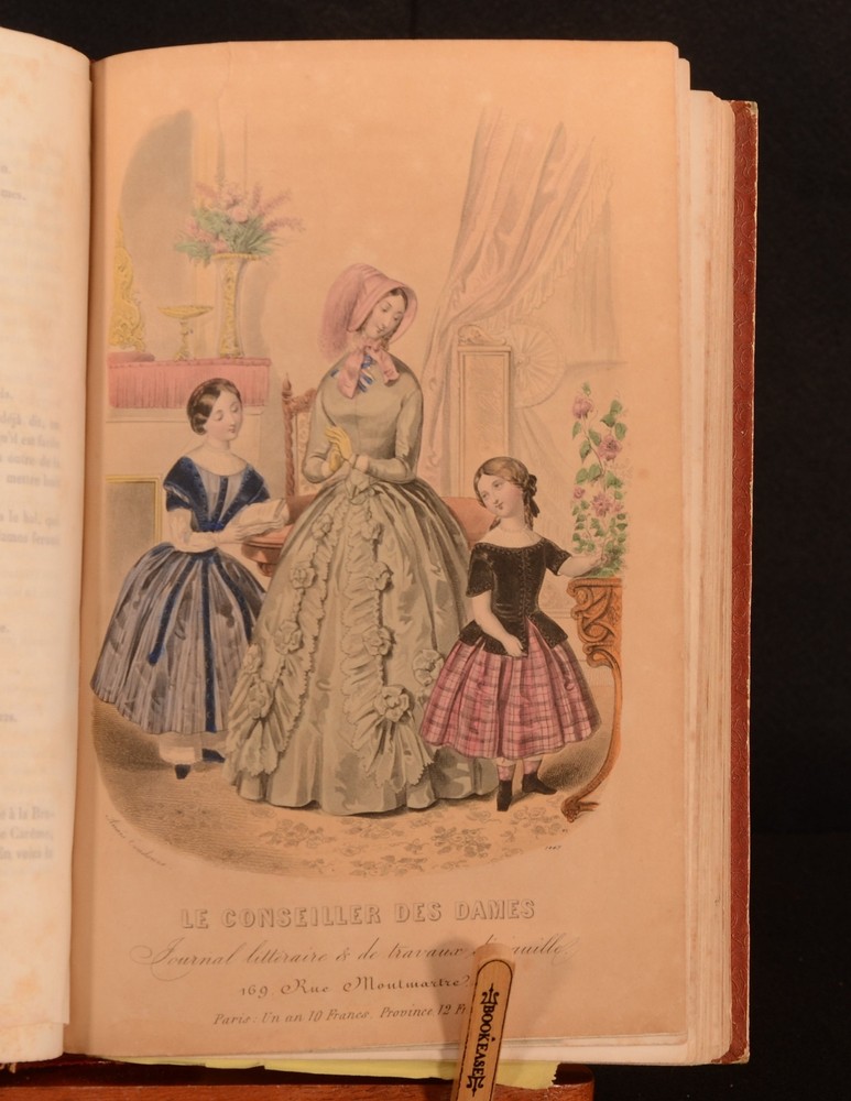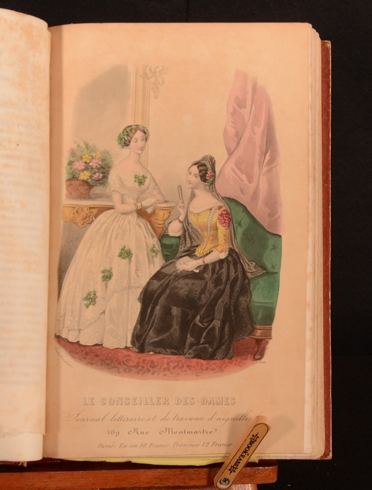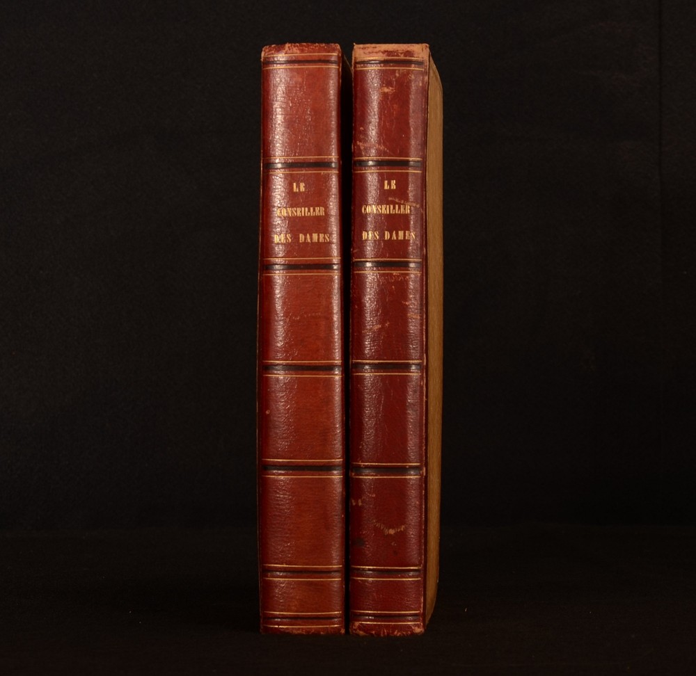Click here to see our other books! Le Conseiller des Dames Journal D'Economie Domestique Various 1847-49 Administration et Redaction : Paris 10.5" by 7" 384, [1], 66-384 SUMMARY Two volumes of this mid-Nineteenth century bourgeois newspaper for women, 'Le Conseiller des Dames'. An illustrated periodical, with many hand-coloured plates and folding embroidery patterns. Folding Plates,Illustrated,Leather Binding Overall Condition: Very Good This book weighs 3 KG when packed UK Postage: £ 3.99 US Postage: £ 36.99 EU Postage : £ 25.99 European Postage: £ 27.99 Asia Postage: £ 47.99 Worldwide Postage: £ 69.99 DESCRIPTION The first volume is December 1847-October 1848 and January 1849-October 1849. With three black and white plates, ten hand-coloured plates, four coloured cross-stitch plates, eleven yellow embroidery pattern plates dated November 1847 - October 1848 and two plates of sheet music to the 1847-8 volume. With nine yellow embroidery plates, two tapestry pattern plates, three cross stitch plates, one black and white folding plate, two music plates and eight coloured plates to the second volume (Jan-October 1849). The hand-coloured plates across both volumes are typically scenes of women and their fashion. Mai 1848 embroidery pattern plate, also has a pattern for negligee to the rear. Janvier 1849 embroidery plate has a sewing pattern to the rear. May has a sewing pattern for an outer garment to the rear. This beautifully illustrated periodical began in November 1847, and was edited by one Z Bourey. In addition to the many sewing patterns and plates representing fashion, there are articles discussing the February Revolution, the revival of clubs and the voice of women, female writers under the republic (written by Leonie Verrieres.) and much more. CONDITION A quarter morocco binding with paper covered boards. Externally, generally smart. Patches of rubbing to the joints and extremities. Further patches of rubbing to the spine and paper covered boards. Internally, both volumes are firmly bound. Pages are generally bright. April 1848 yellow sewing plate to 1847-8 volume has had a small amount cut out. Small closed tear to the hand-coloured plate at page 133 of the first volume. Small chips to the edges of some of the yellow embroidery pattern plates. The September embroidery plate to the second volume is detached but present. Closed tear to the first music plate to the second volume. One emboidery plate has been completely removed to September and October of vol II. Occasional scattered spots to pages, with heavy spotting to pages 333-352 to the 1849 volume. Overall Condition: Very Good GLOSSARY OF TERMS Overall Condition (Dustwrapper condition rating is shown after that for the book itself, where a dustwrapper is present) Fine - Very well preserved copy showing very little wear Very Good Indeed - Only one or two minor faults, really a very attractive copy Very Good - Quite a wide term meaning no major faults but probably several smaller ones often expected given the age of the book, but still a respectable copy Good - Meaning not very good. Some more serious faults as will be described in the condition report under 'condition' Good Only - Meaning one or more faults that could really do with repair Fair - As with good only above but with other faults leaving a compromised copy even after repair Poor - Really bad and possibly seriously incomplete. We only sell books in this condition where their rarity or value makes them attractive none the less. Major defects will be described. GUARANTEE We offer a full money back guarantee on our descriptions. Please ask for details and conditions. We prefer PAYPAL. If you pay via PAYPAL we will post the item off the same or the next working day with the postage you have selected. Please note we cannot accept USD cheques