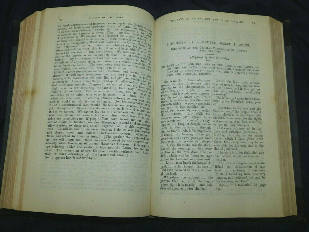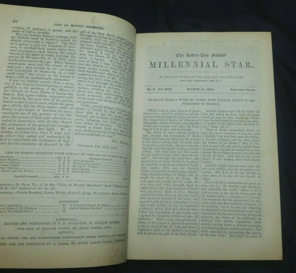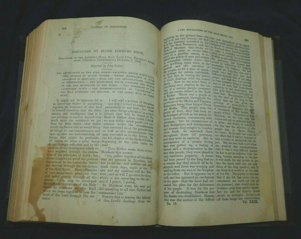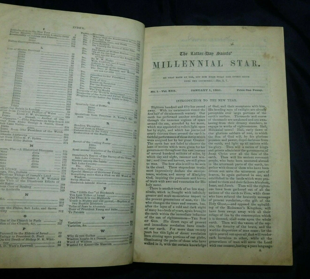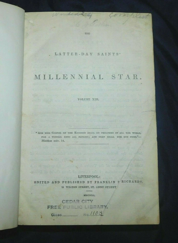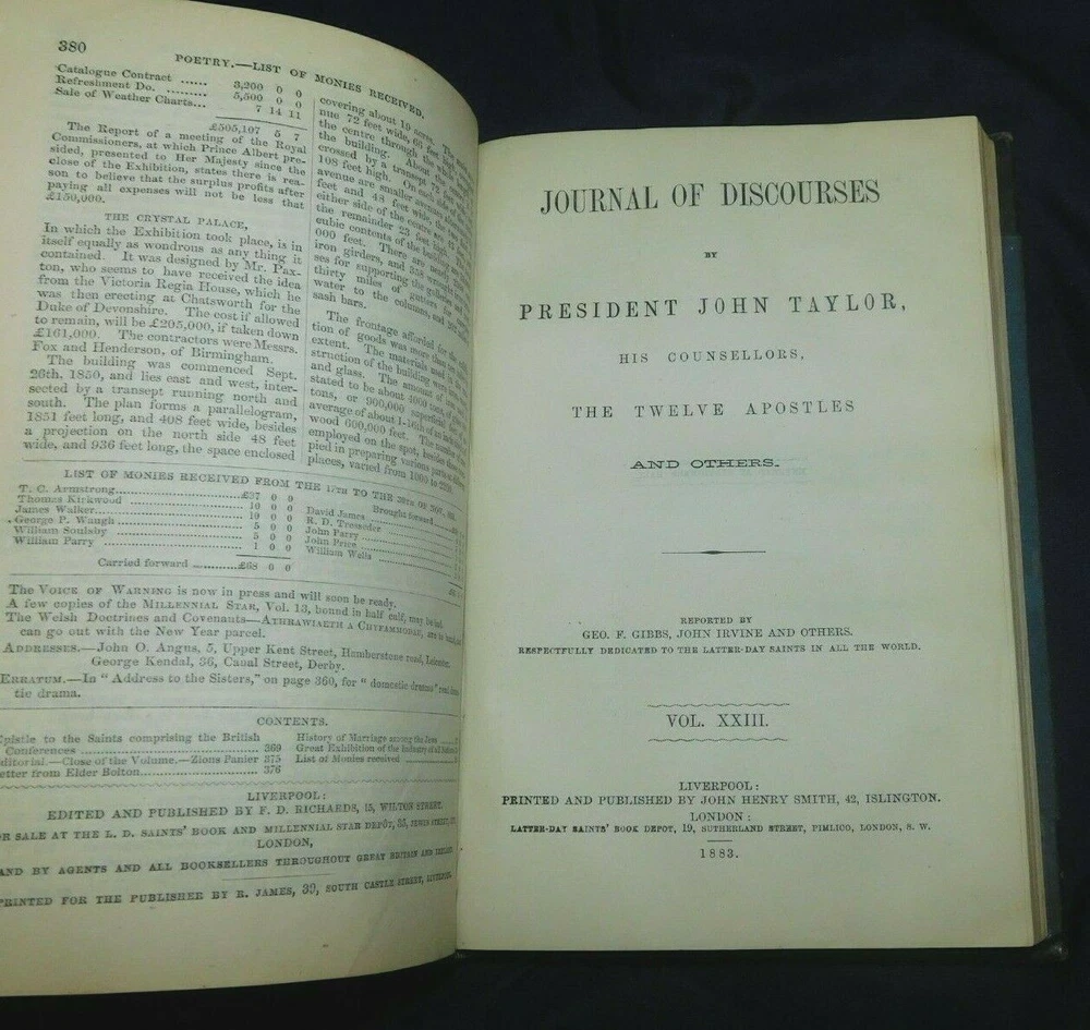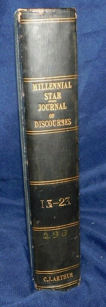THE LATTER-DAY SAINTS MILLENNIAL STAR 1851 volume XIII (includes all 24 issues for the year) 380 pages It also includes JOURNAL OF DISCOURSES By President John Taylor Vol XXIII, 1883 Title page, index, and 376 pages It measures 5 1/2" x 8 3/4" Condition: Very Good The cloth covered boards as well as the leather corners and spine have some rubbing but have no cracks or tears. The boards are sturdy, no soft corners. The gold gilt bands and lettering on the spine are bright and bold. The binding is tight. It has a Cedar City Public Library sticker on the inside front cover and has a library marking on the spine. It also has a gift note written on the front fly page. The title page also has a library markings and pencil writing on the top edge. Most of the pages are in excellent condition. It has about 10 intermittent pages with light chipping to the edges that does not affect the print. Page 237 of the Journal of Discourses has a stain, please see picture.