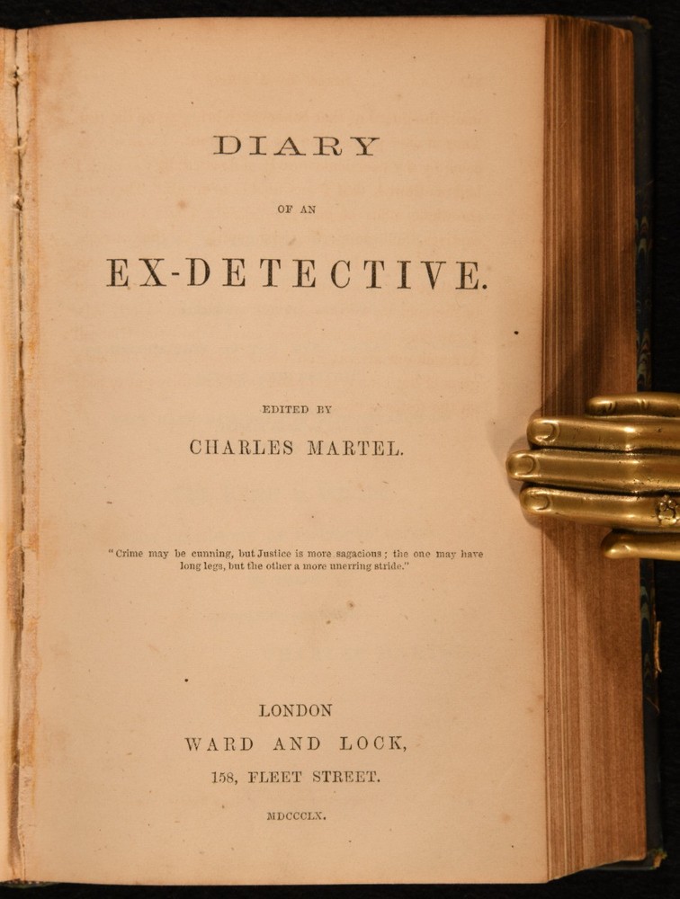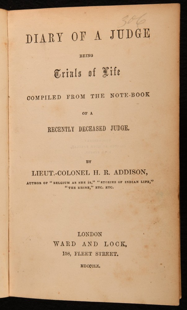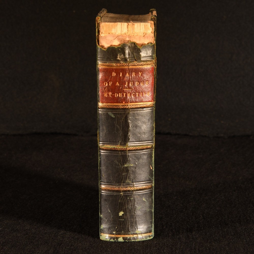 Click here to see our other books! Diary of a Judge, Being Trials of Life, Compiled from the Notebook of a Recently Deceased Judge; Diary of an Ex-Detective Henry Robert Addison; Charles Martel [Thomas Delf] 1860 Ward and Lock; : London 6.5" by 5" 312; 315pp SUMMARY Two very scarce 1860 collections of entertaining, macabre and thrilling short stories, framed as being excerpts from the diary of a Judge and a Detective. First Edition,Leather Binding,Very Scarce Overall Condition: Good Only This book weighs 1 KG when packed UK Postage: £ 3.99 US Postage: £ 22.99 EU Postage : £ 16.99 European Postage: £ 17.99 Asia Postage: £ 22.99 Worldwide Postage: £ 28.99 DESCRIPTION The first of these works is the scarce 1860 work 'Diary of a Judge, Being Trials of Life, Compiled from the Notebook of a Recently Deceased Judge', by Henry Robert Addison. Addison was the author of about sixty dramas and farces on the London stage, and authored a further twelve novels and stories. This collection of short stories is claimed to be 'carefully extracted from the note-book of the Baron de -----, who for several years acted as a judge during the reign of Napoleon'. Stories include 'The Haunted House', 'The Poisoned Creece', 'An Irish Ghost Story' and 'The Phrenologist'. The second work is the very scarce 1860 collection 'Diary of an Ex-Detective', edited by Charles Martel, which is the pseudonym of author and translator Thomas Delf. Short stories include 'The Murdered Judge', 'Cheating the Gallows' and 'Robbing the Bank'. Two thrilling collections of extraordinary tales. CONDITION In a half calf binding, with marbled paper covered boards. Loss of calf to back strip head. Light rubbing to joints, board perimeters, and back strip tail. Front joint starting, with board firmly held. Rear joint starting and firmly held. Rear free endpaper removed. Internally, firmly bound. Pages lightly age toned, with handling marks and instances of spotting throughout. Overall Condition: Good Only GLOSSARY OF TERMS Overall Condition (Dustwrapper condition rating is shown after that for the book itself, where a dustwrapper is present) Fine - Very well preserved copy showing very little wear Very Good Indeed - Only one or two minor faults, really a very attractive copy Very Good - Quite a wide term meaning no major faults but probably several smaller ones often expected given the age of the book, but still a respectable copy Good - Meaning not very good. Some more serious faults as will be described in the condition report under 'condition' Good Only - Meaning one or more faults that could really do with repair Fair - As with good only above but with other faults leaving a compromised copy even after repair Poor - Really bad and possibly seriously incomplete. We only sell books in this condition where their rarity or value makes them attractive none the less. Major defects will be described. GUARANTEE We offer a full money back guarantee on our descriptions. Please ask for details and conditions. We prefer PAYPAL. If you pay via PAYPAL we will post the item off the same or the next working day with the postage you have selected. Please note we cannot accept USD cheques