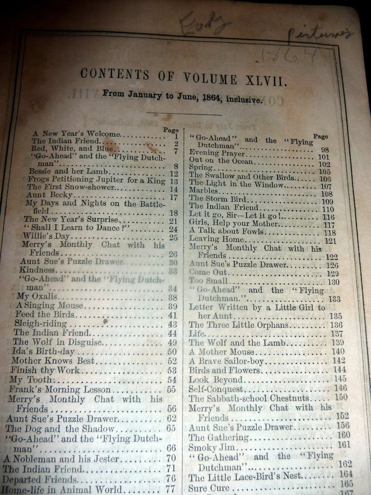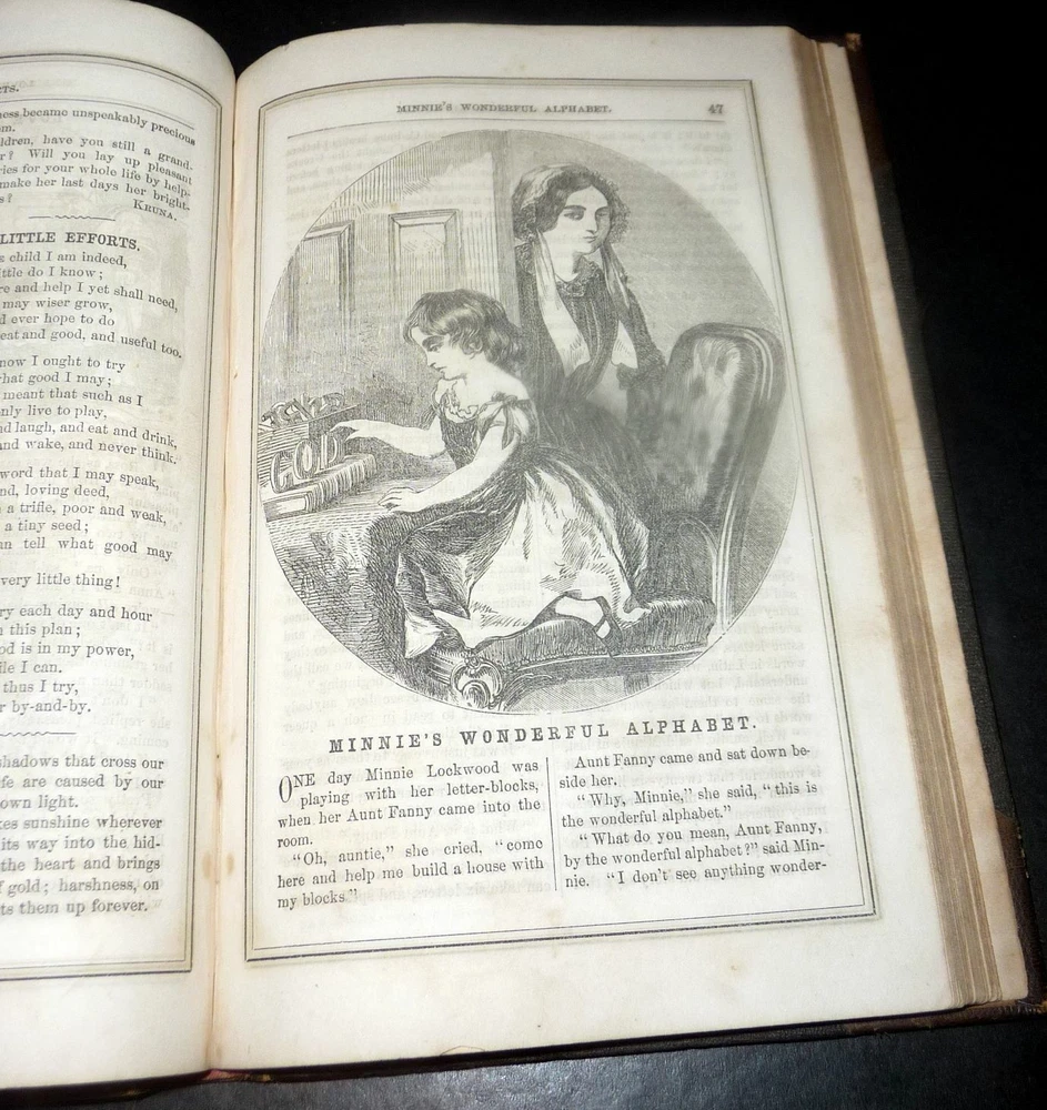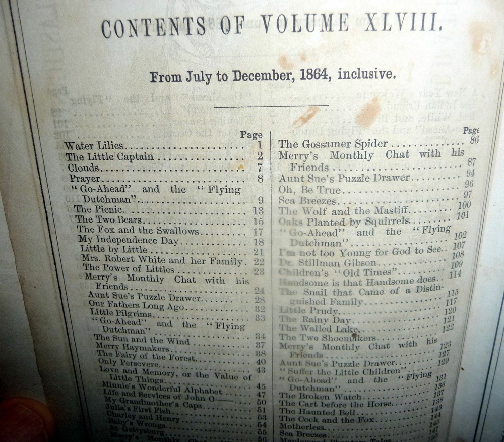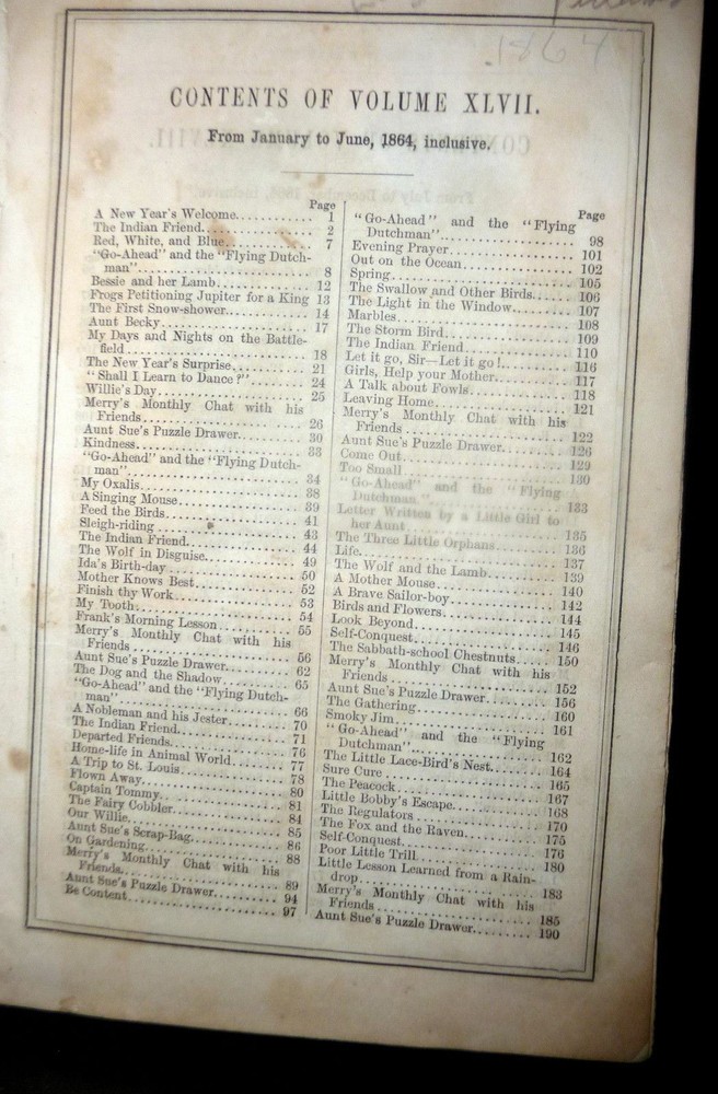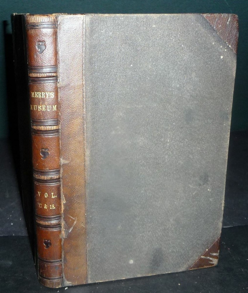 1864 Merry's Museum, Hardbound Illustrated Journal for Youth, Civil war Era 1864 Merry's Museum, Hardbound Illustrated Journal for Youth, Civil war Era Merry's Museum Volume 17 (Jan. - June 1864) and Volume 18 (July - Dec. 1864) [Bound in One Volume] Three-quarter leather over cloth-covered boards, ribbed spine, gilt spine titles, octavo, 192 + 188 pages, b&w full-page and intext illustrations throughout. The volume includes the full text as well as the semi annual indexes but it does not include the original covers of the issues. Literary journal for children. Includes non-fiction, fiction, poetry, puzzles, advice. Subjects include a trip to St. Louis, an Indian friend, birds and flowers, microscopic wonders, Independence Day, An essay on the Union soldiers on the way to fight at Gettysburg, Song for Our Soldiers, etc. Merry's Museum (1841-ca.1872) was an illustrated children's magazine established by Samuel Griswold Goodrich in Boston, Massachusetts, in 1841. Louisa May Alcott served as editor for a year or so, and also contributed stories, as did Lucretia Peabody Hale, Caroline M. Hewins, Rebecca Sophia Clarke, Helen W. Pierson, and others. Goodrich continued to oversee the magazine until 1854. For some time it was published in New York. In 1868 Boston's Horace B. Fuller bought the enterprise, and remained as publisher until ca. 1872, when the magazine ceased. Editors included Goodrich (1841-1850); Rev. S.T. Allen (ca.1850); and Alcott (ca.1868-1870). Among the many contributors were Mary Bedford; Katherine Bertha; Emer Birdsey; Kitty Carroll; Margaret Field; Lilian Louise Gilbert; E.B. Greene; Mary B. Harris; Annie Moore; Anna North; Annie Phillips; Mary N. Prescott; Rose Scott; M.G. Sleeper; Olive Thorne; and Elisabeth A. Thurston. Very scarce volume. CONDITION: Good. (Covers have moderate wear, light soiling. Age tanning of paper, brown spots. Closed tear on blank rear endpaper. Unmarked contents. Tight binding) Check our other auctions and store listings for additional unusual items. Check our other auctions and store listings for additional unusual items Listing and template services provided by inkFrog