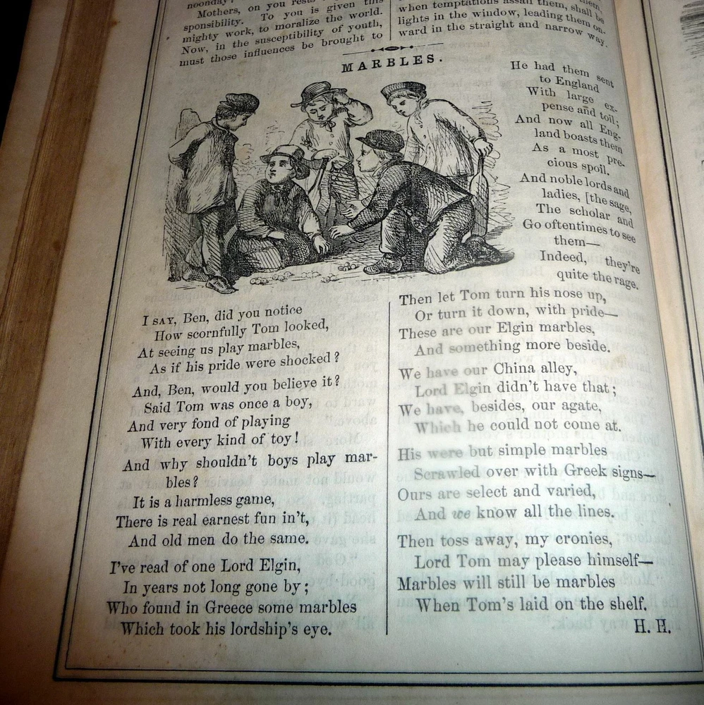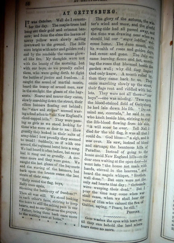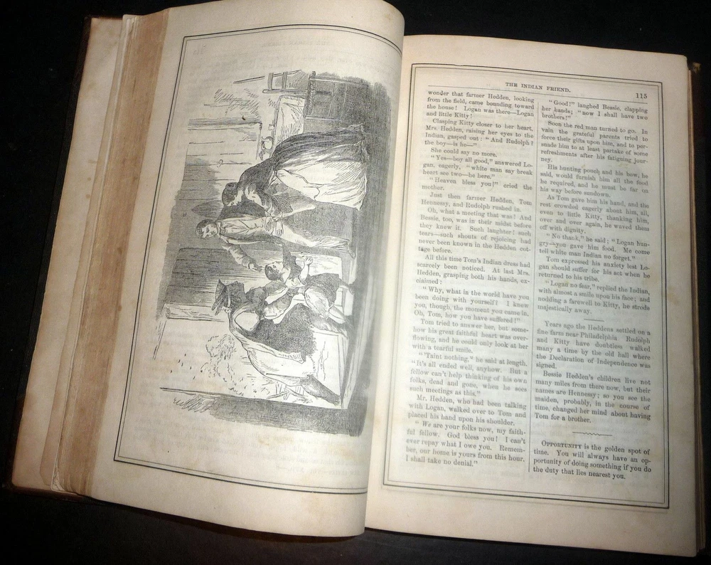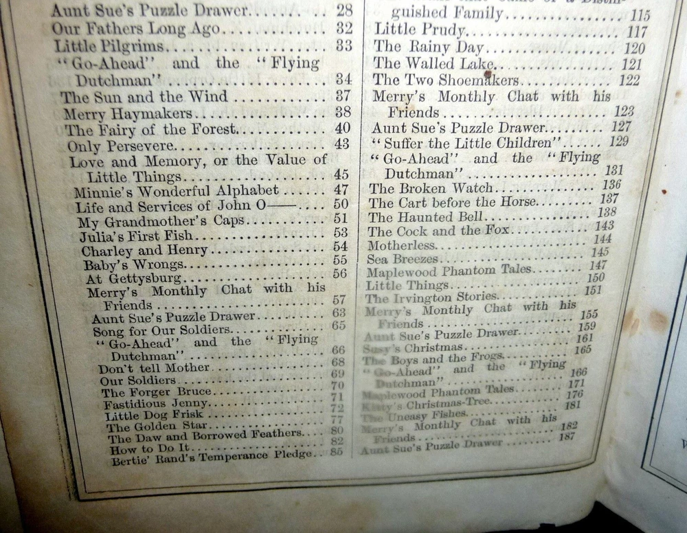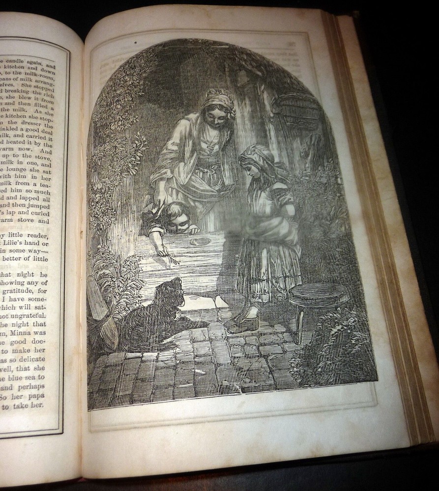 1864 Merry's Museum, Hardbound Illustrated Journal for Youth, Civil war Era 1864 Merry's Museum, Hardbound Illustrated Journal for Youth, Civil war Era Merry's Museum Volume 17 (Jan. - June 1864) and Volume 18 (July - Dec. 1864) [Bound in One Volume] Three-quarter leather over cloth-covered boards, ribbed spine, gilt spine titles, octavo, 192 + 188 pages, b&w full-page and intext illustrations throughout. The volume includes the full text as well as the semi annual indexes but it does not include the original covers of the issues. Literary journal for children. Includes non-fiction, fiction, poetry, puzzles, advice. Subjects include a trip to St. Louis, an Indian friend, birds and flowers, microscopic wonders, Independence Day, An essay on the Union soldiers on the way to fight at Gettysburg, Song for Our Soldiers, etc. Merry's Museum (1841-ca.1872) was an illustrated children's magazine established by Samuel Griswold Goodrich in Boston, Massachusetts, in 1841. Louisa May Alcott served as editor for a year or so, and also contributed stories, as did Lucretia Peabody Hale, Caroline M. Hewins, Rebecca Sophia Clarke, Helen W. Pierson, and others. Goodrich continued to oversee the magazine until 1854. For some time it was published in New York. In 1868 Boston's Horace B. Fuller bought the enterprise, and remained as publisher until ca. 1872, when the magazine ceased. Editors included Goodrich (1841-1850); Rev. S.T. Allen (ca.1850); and Alcott (ca.1868-1870). Among the many contributors were Mary Bedford; Katherine Bertha; Emer Birdsey; Kitty Carroll; Margaret Field; Lilian Louise Gilbert; E.B. Greene; Mary B. Harris; Annie Moore; Anna North; Annie Phillips; Mary N. Prescott; Rose Scott; M.G. Sleeper; Olive Thorne; and Elisabeth A. Thurston. Very scarce volume. CONDITION: Good. (Covers have moderate wear, light soiling. Age tanning of paper, brown spots. Closed tear on blank rear endpaper. Unmarked contents. Tight binding) Check our other auctions and store listings for additional unusual items. Check our other auctions and store listings for additional unusual items Listing and template services provided by inkFrog