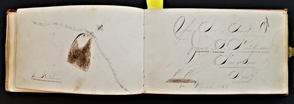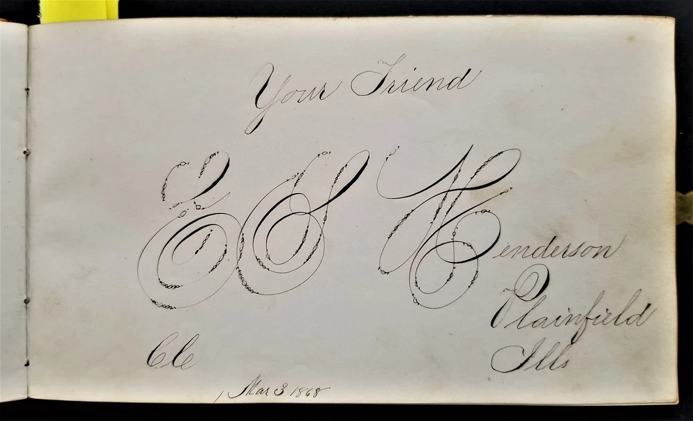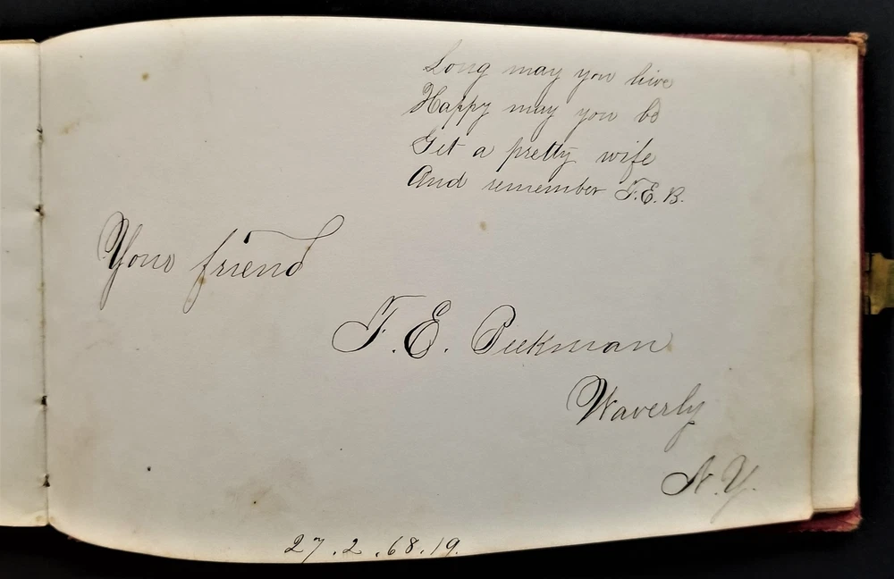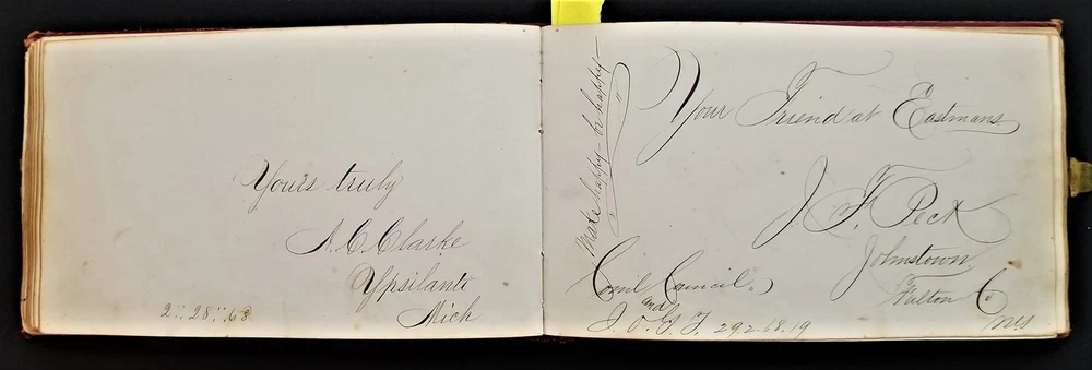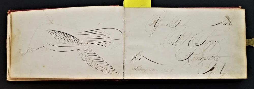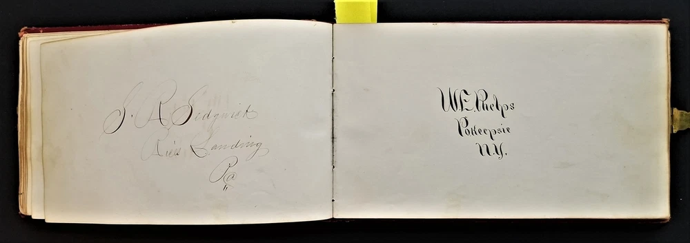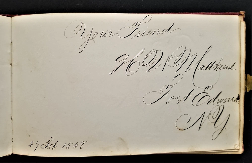 1868 antique FRAKTUR penmanship AUTOGRAPH ALBUM poughkeepsie ny Thos CLARK bird SCROLL DOWN for MORE PHOTOS in DESCRIPTION Click HERE to view or search ANTIQUE.COTTAGE listings. Autograph/folk art album from 1868 from Thomas Baxter Clark II, a student at Eastman School of Business. Over 100 entries in it, some signatures, some very fancy calligraphy, and others with folk art drawings. 74 pages with penmanship. The handful with fraktur art as shown. Also there are empty pages. This measures approx 7.25"x4.25". Hardcover, leather over board binding. With working brass clasp. Excellent original early family, and/or town genealogy, history, antique, museum, collectible heirloom and/or ephemera. CONDITION : Beautiful penmanship. Working clasp. Scuffs on cover. Some loosening pages. See listing description and photos - International buyers are responsible to pay VAT or other Taxes to their countries as required. - eBAY collects and remits sales tax on behalf of several states. If you are a dealer, you can write to eBay to file a form to become tax exempt. LOC: LOC2: BOOKBOX27-IN.SLEEVE-TMK Powered by SixBit's eCommerce Solution