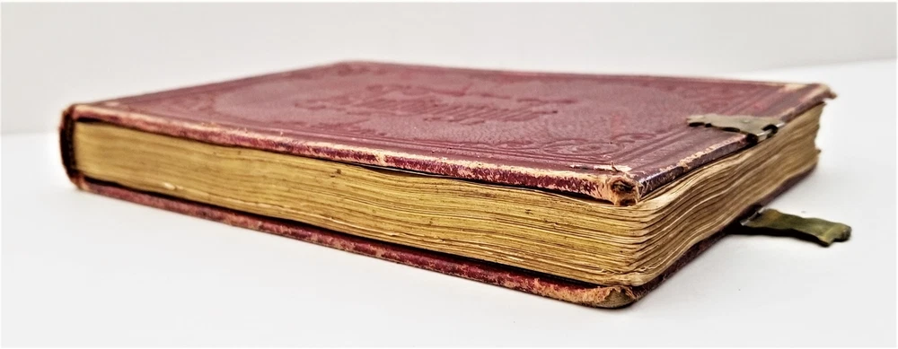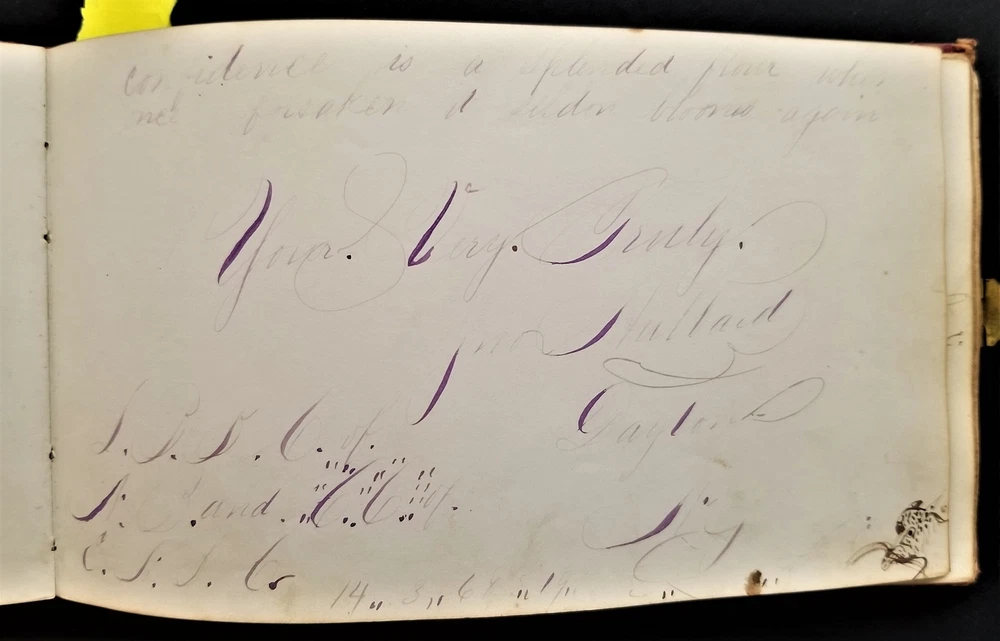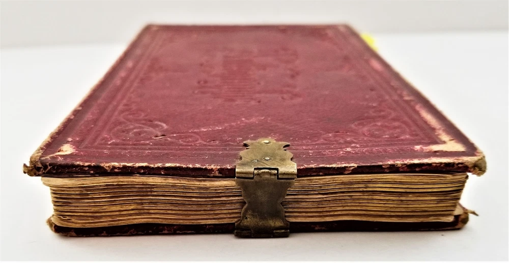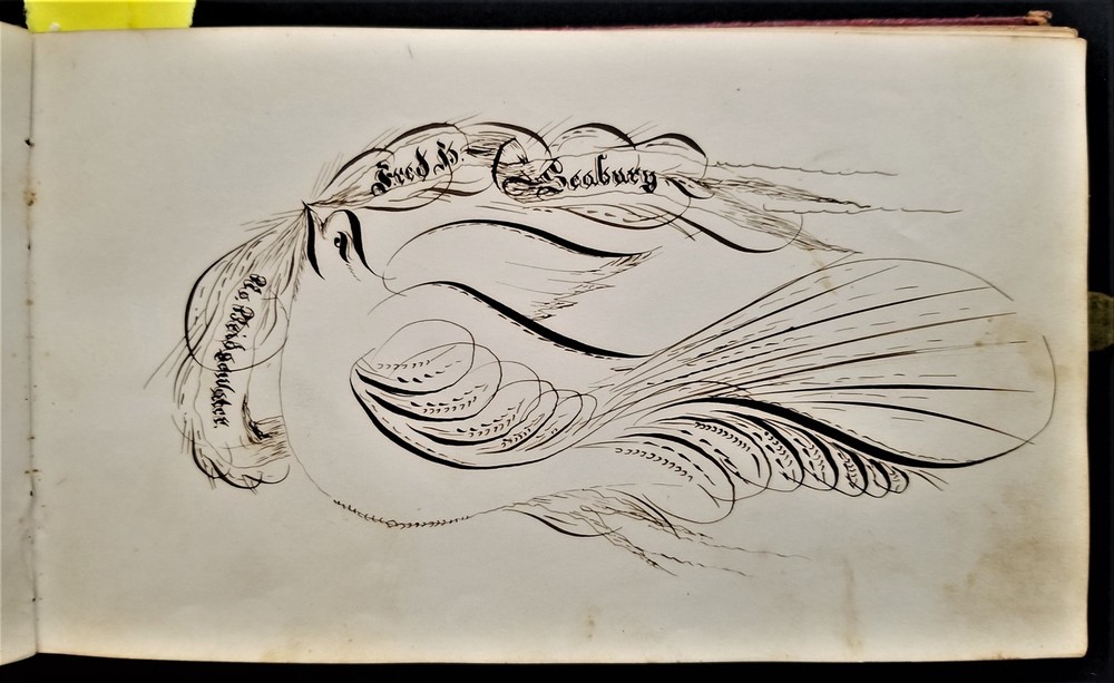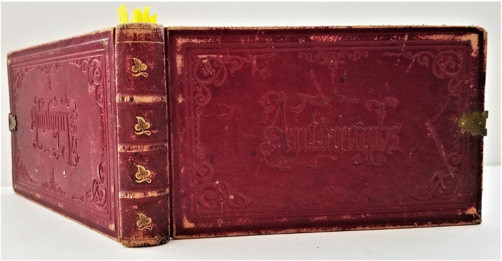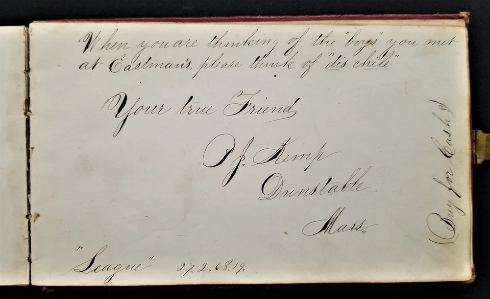 1868 antique FRAKTUR penmanship AUTOGRAPH ALBUM poughkeepsie ny Thos CLARK bird SCROLL DOWN for MORE PHOTOS in DESCRIPTION Click HERE to view or search ANTIQUE.COTTAGE listings. Autograph/folk art album from 1868 from Thomas Baxter Clark II, a student at Eastman School of Business. Over 100 entries in it, some signatures, some very fancy calligraphy, and others with folk art drawings. 74 pages with penmanship. The handful with fraktur art as shown. Also there are empty pages. This measures approx 7.25"x4.25". Hardcover, leather over board binding. With working brass clasp. Excellent original early family, and/or town genealogy, history, antique, museum, collectible heirloom and/or ephemera. CONDITION : Beautiful penmanship. Working clasp. Scuffs on cover. Some loosening pages. See listing description and photos - International buyers are responsible to pay VAT or other Taxes to their countries as required. - eBAY collects and remits sales tax on behalf of several states. If you are a dealer, you can write to eBay to file a form to become tax exempt. LOC: LOC2: BOOKBOX27-IN.SLEEVE-TMK Powered by SixBit's eCommerce Solution