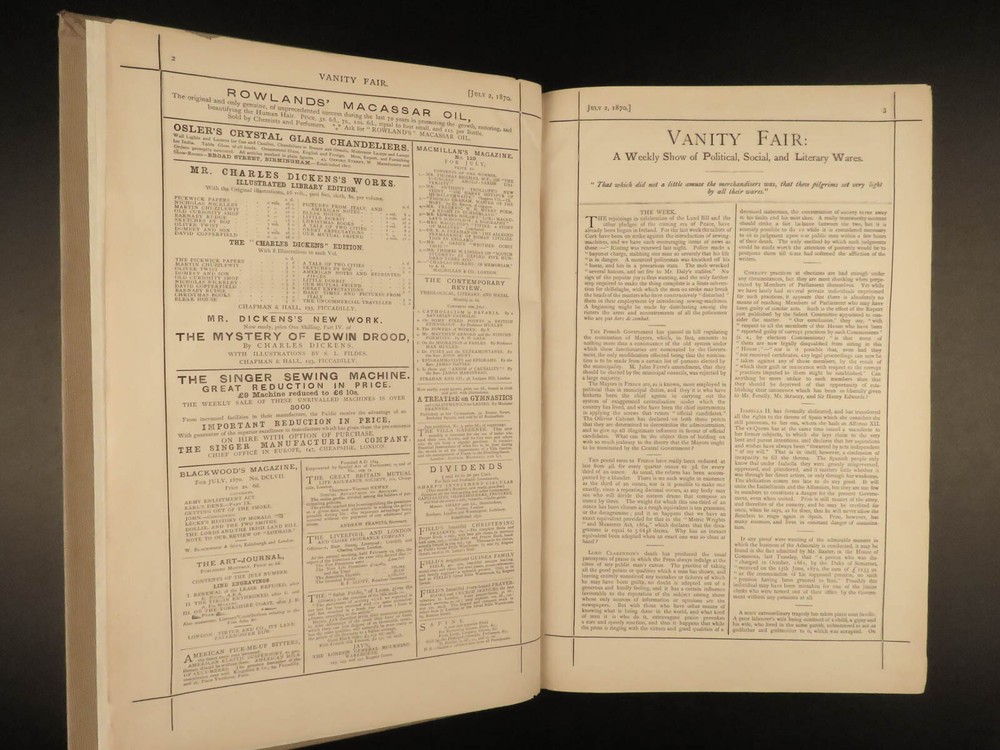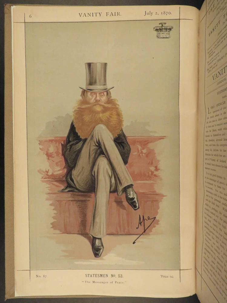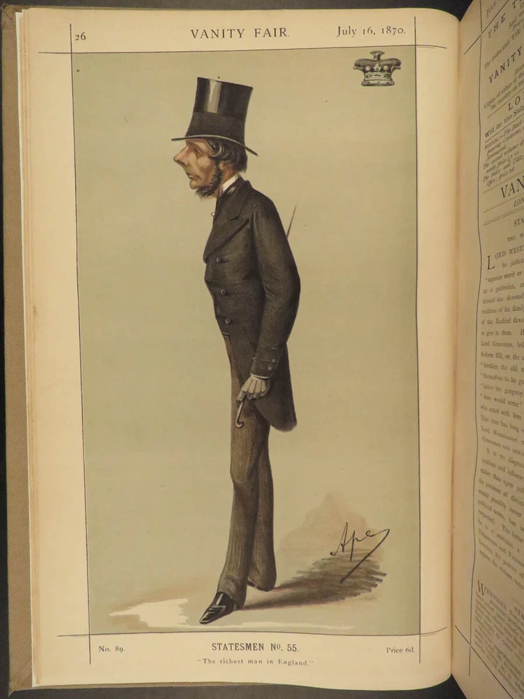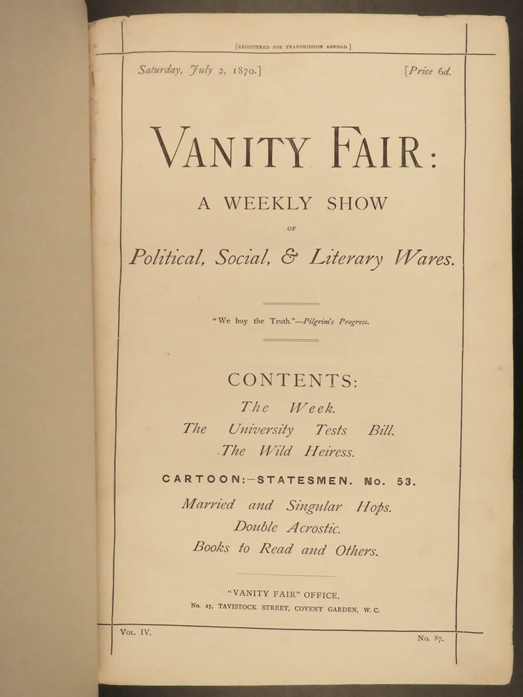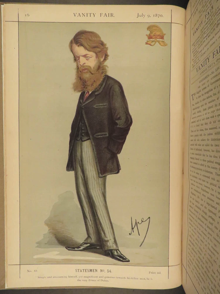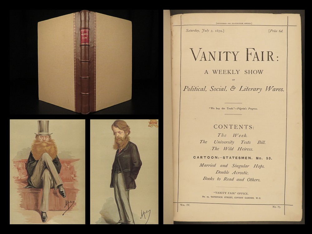 1870 Vanity Fair ART Henry Bulwer Frederick III of Prussia Illustrated COLOR A rare printing of the first volume of the Vanity Fair Album . Vanity Fair is best known for full-page, color lithographs of world celebrities and dignitaries including artists, athletes, royalty, , scientists, authors, and scholars. More than 2000 of these images appeared, and they are considered the chief cultural legacy of the magazine, forming a pictorial record of the period. According to author and editor Jehu Junior, “The Vanity Fair Portraits are and remain the only work of their kind ever attempted ; and as such they must always hold a special and distinct place as a permanent record of men of eminence in the nineteenth century.” This 1870 edition includes 24 full page color plates of famous figures including · Marquis of Westminster · The Duke of Sutherland · Lord Henry Gordon-Lennox · Robert Montagu · Prince of Prussia, Frederick III · Henry Bulwer Item number: #18941 Price: $795 JUNIOR, Jehu (pseud. Thomas Gibson Bowles) Vanity Fair: a weekly show of political, social & literary wares… July - December London: Vanity Fair Office, 1870. Details : · Collation: o 270 o Wanting p. 155-158, 165-166; p. 167-168 present but damaged o 24 lithograph engravings · References: Jehu Junior, Vanity Fair Album: List of Cartoons and Volumes from the foundation of Vanity Fair in 1868 · Language: English · Binding: Leather; tight and secure · Size : ~14.25in X 9.5in (36.5cm x 24.5cm) Our Guarantee: Very Fast. Very Safe. Free Shipping Worldwide. Customer satisfaction is our priority! Notify us with 7 days of receiving, and we will offer a full refund without reservation! 18941