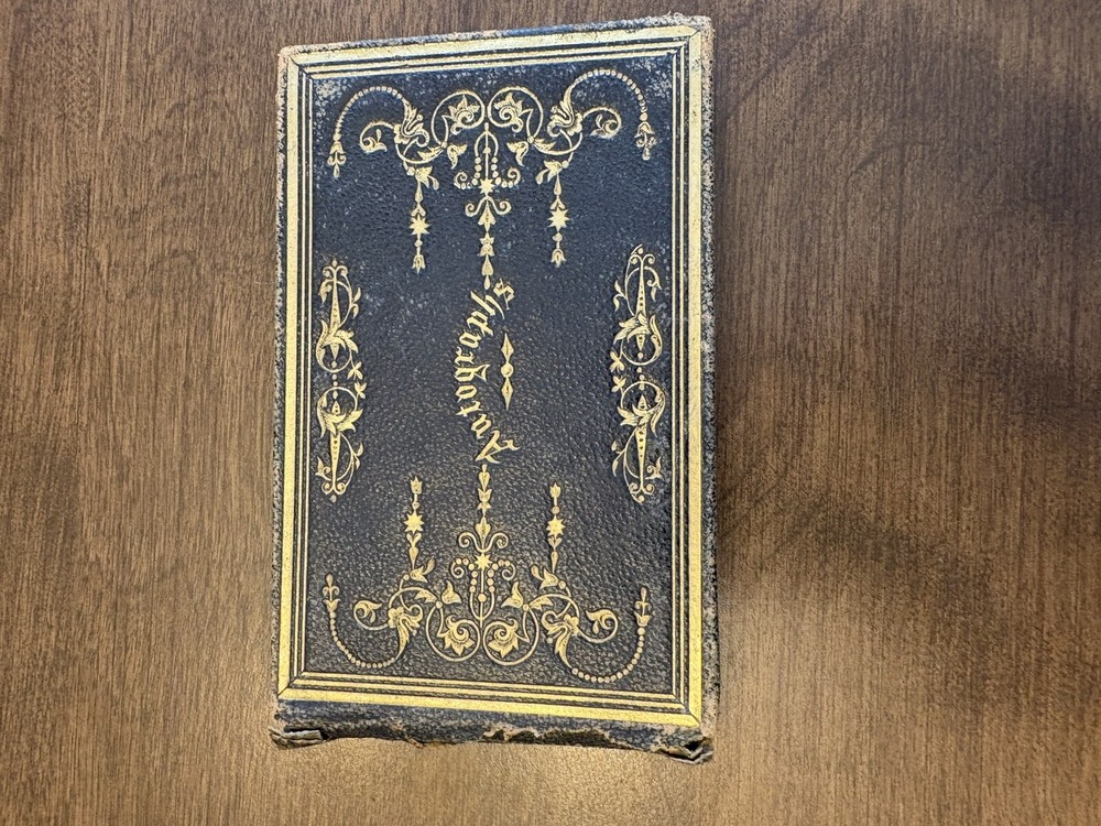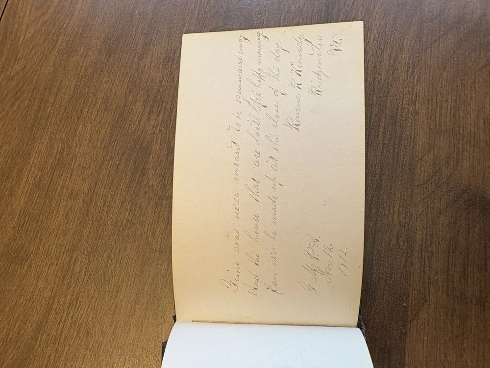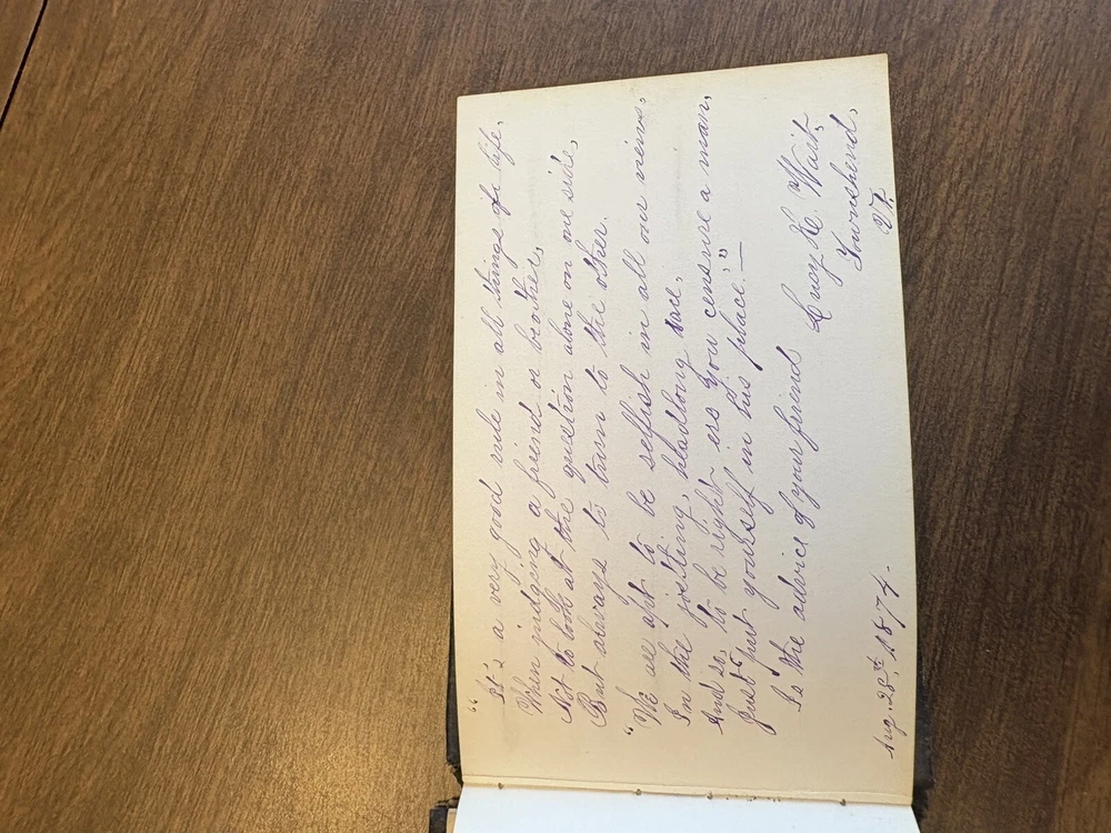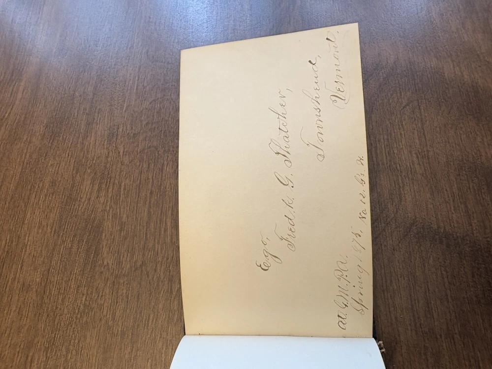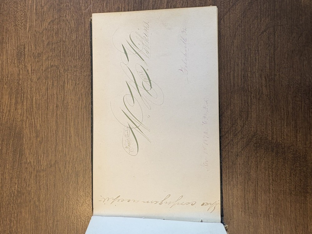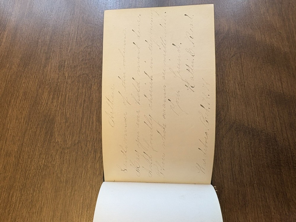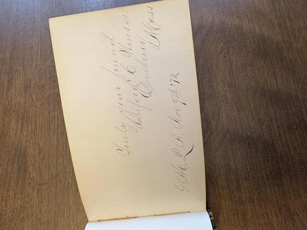 This antique autographs album was owned by Arthur J Barber (Jan 18th 1853 - Jan 14th 1928), born in wadsboro, VT, and died in Oshkosh, WI. This album is a true gem for collectors of books and autographs. The leather-bound cover adds a touch of elegance and durability, making it a great addition to any collection. Inside, you'll find autographs of the original owners acquaintances between 1872 -1874, making it a one of a kind item. The album is in good condition for the age, although the binding is in poor condition and the cover has separated from the album. Overall, the album has been very well-preserved over the years. This album is a rare find and a great addition to any book or autograph collection. Don't miss your chance to own this unique piece of history.