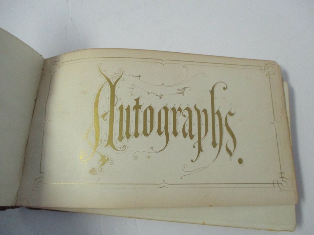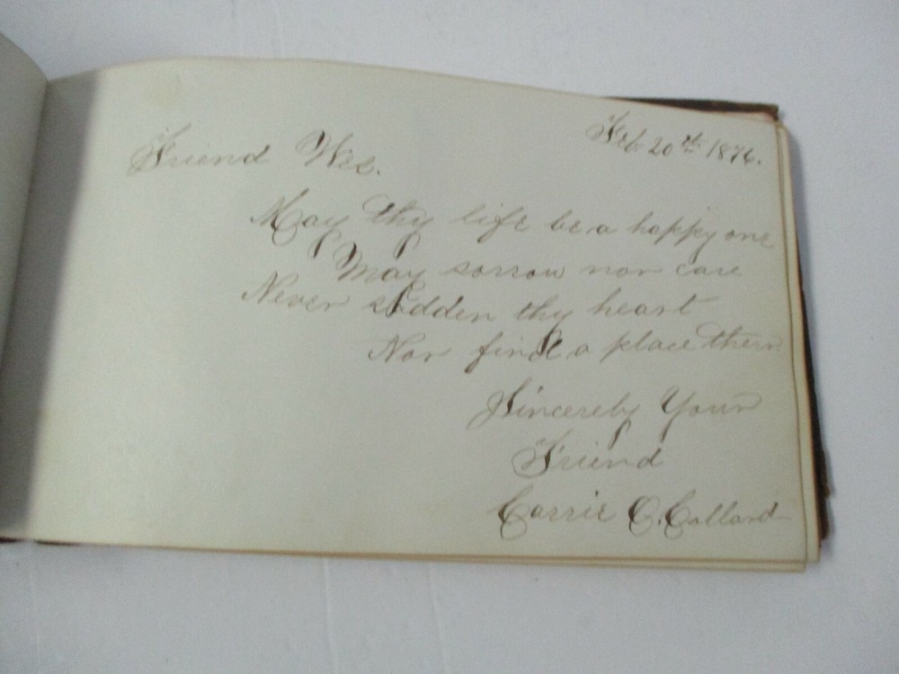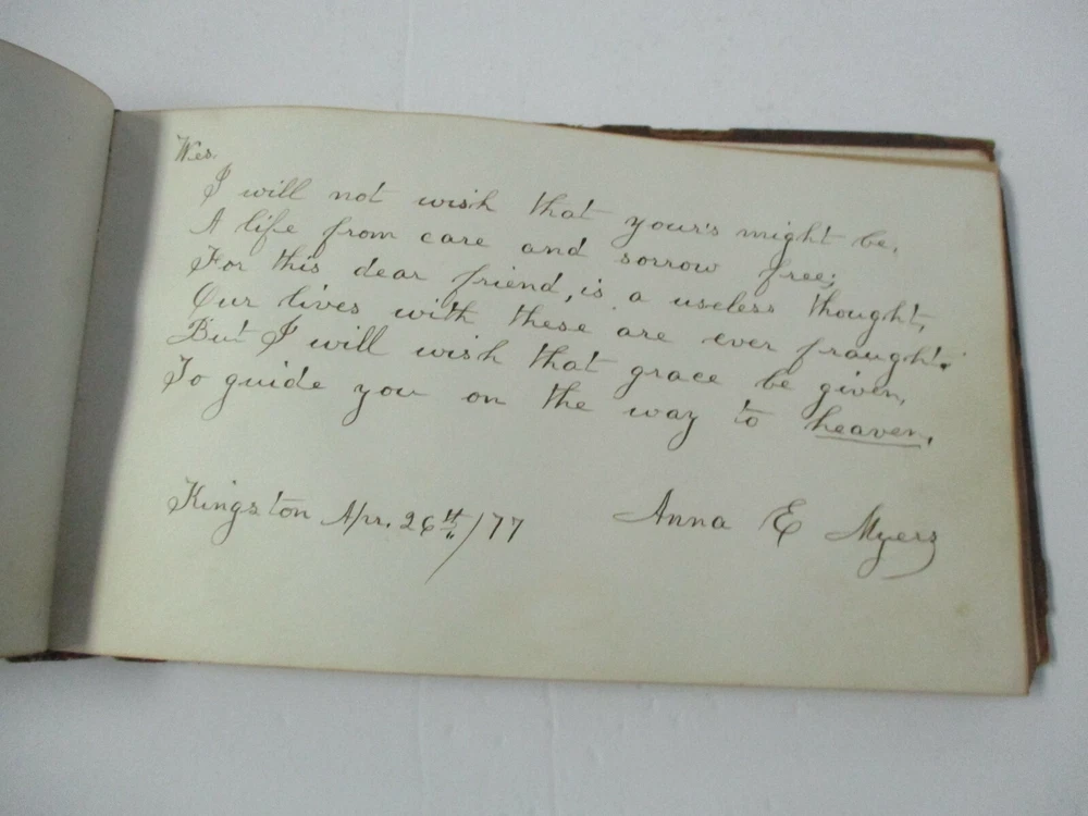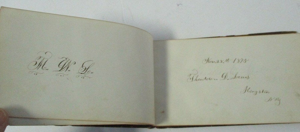 Album measures 7 x 4 1//4 inches with 36 entries and messages. The messages are dated 1875-1893 from family and friends, mostly it would appear, from the Kingston area. The book belonged to M. Westbrook Snyder, who went by Wes. City directories indicate that he was a clerk and salesman during the time; working and residing at Washington Ave. and North Front Street addresses. The 1901 City Directory lists him as residing at 16 John St. Kingston and with Lowe & Snyder Shoe Store, which was at 41 North Front Street, Kingston. Thank you.