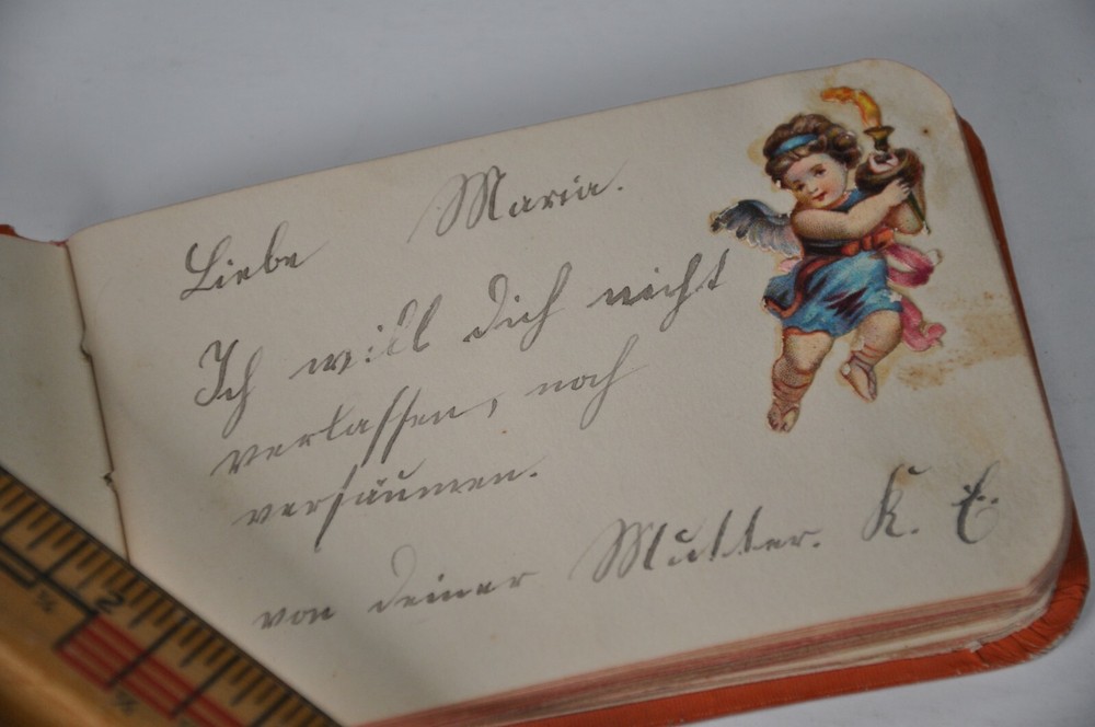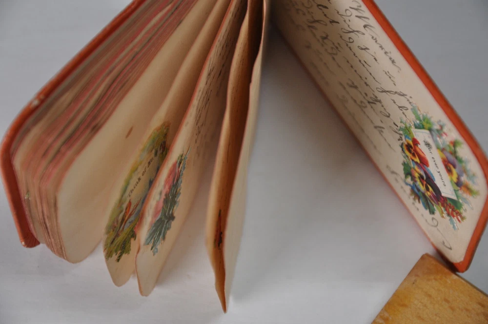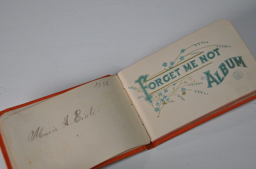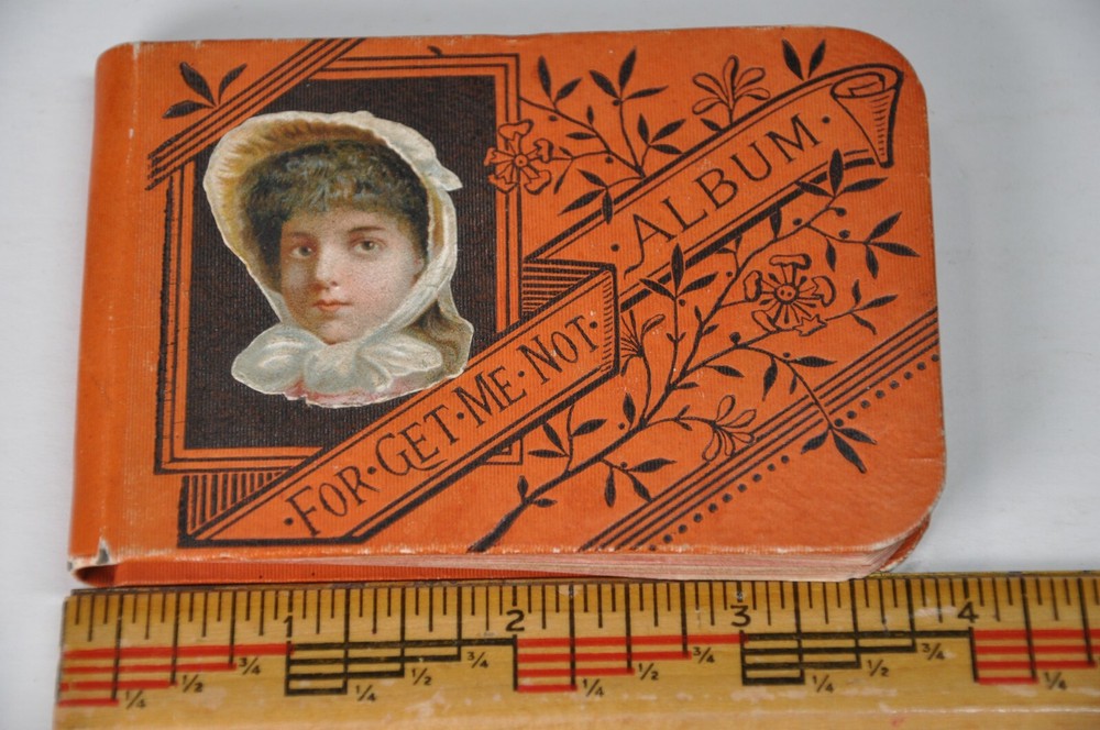 Gently owned, light wear. Some writing, marked 1886 inside, with a name and some entries. Sticker like additions to some pages. See photos. Visit our store for more like this. Forget me not album 1886...