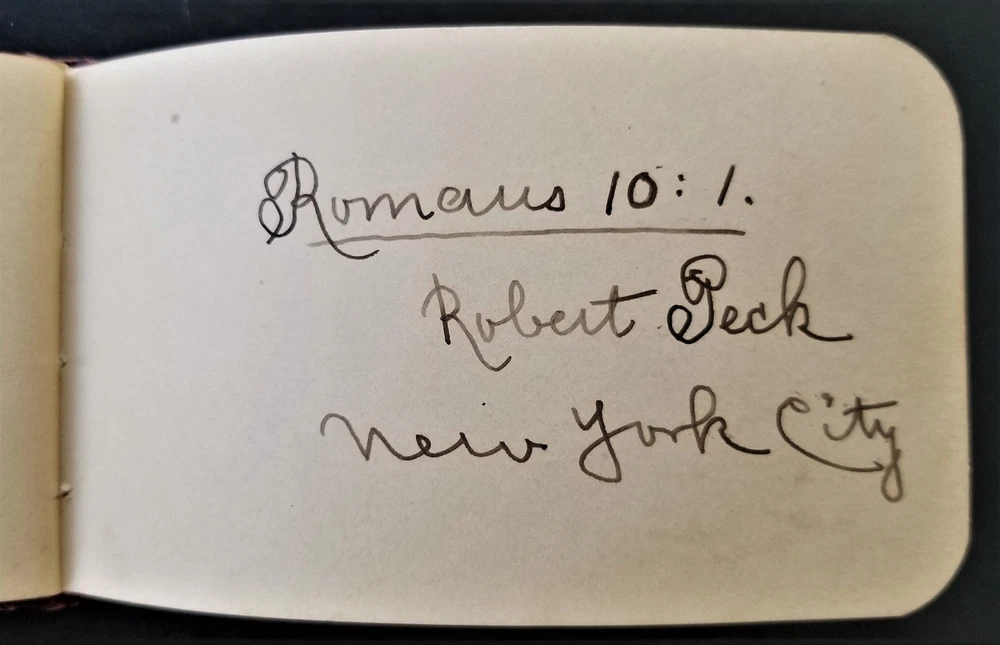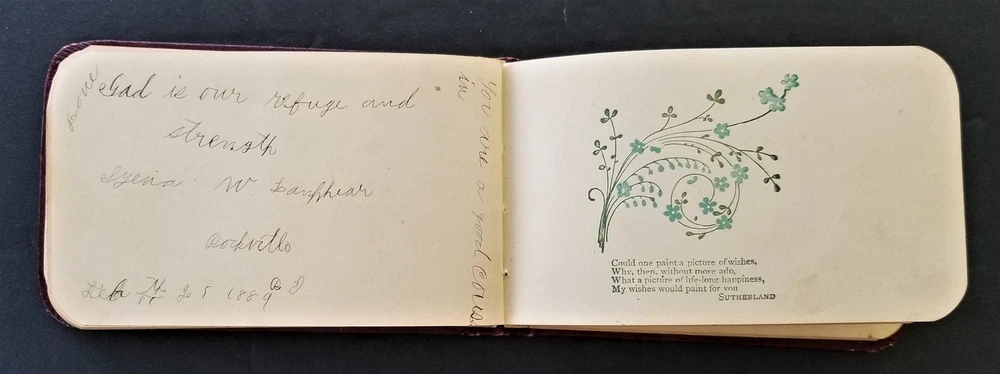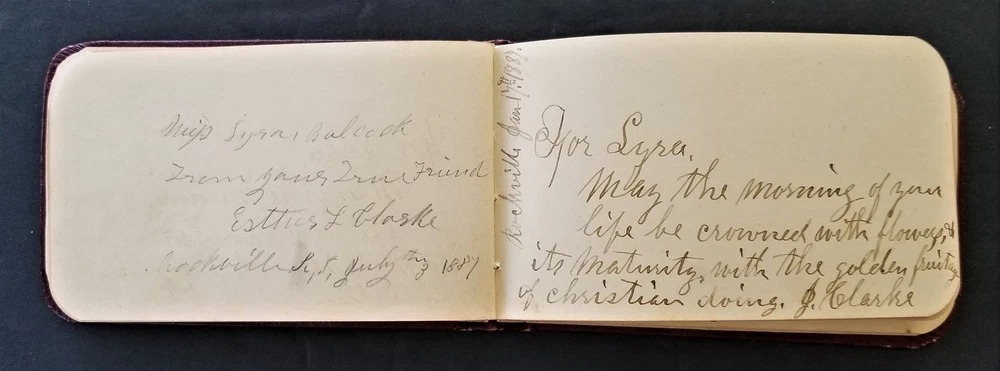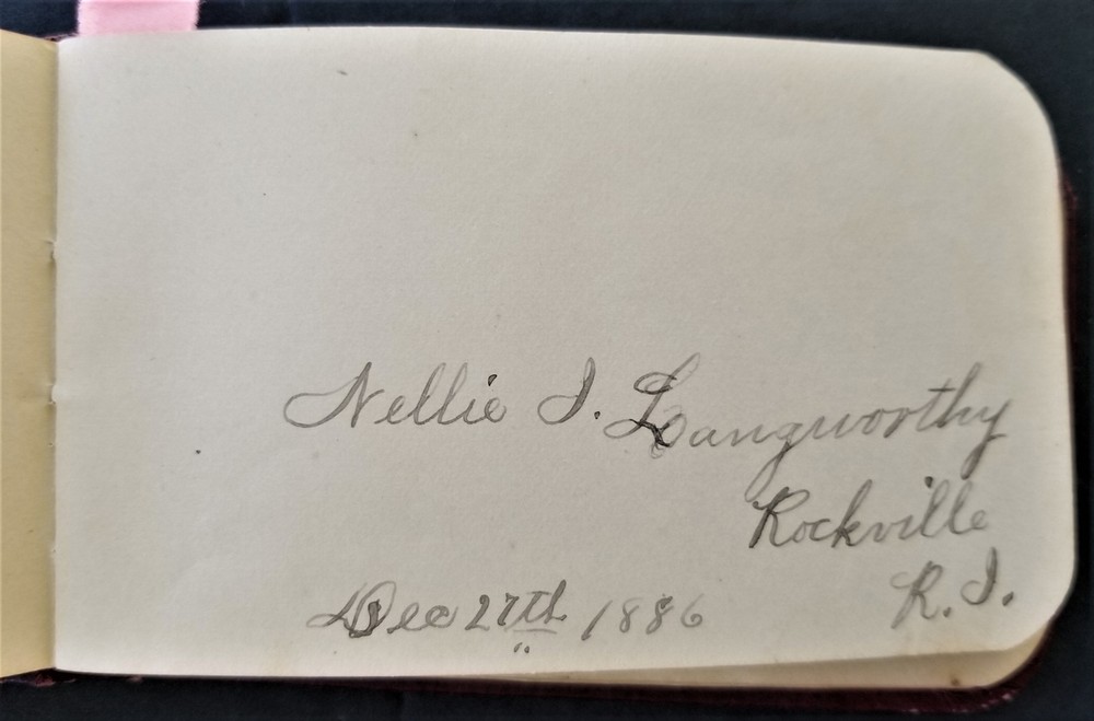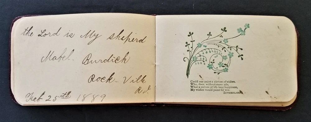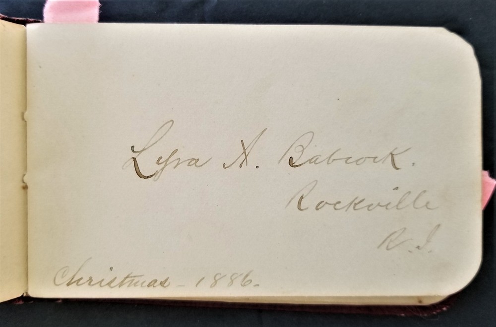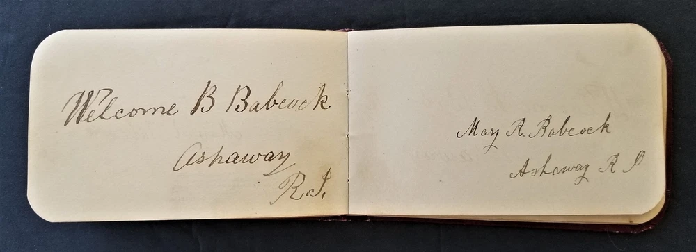 1886 antique AUTOGRAPH ALBUM rockville ri LYRA BABCOCK handwritten leather SCROLL DOWN for MORE PHOTOS in DESCRIPTION Click HERE to view or search ANTIQUE.COTTAGE listings. This listing is for the sweet little autograph. Measures approx 3.75"x4.5". This leather covered book has the following signatures: - Lyra A. Babcock, Rockville RI - A. S. Babcock - Lantie A. Babcock, Rockville - Mary P. Palmer - Jared G. barber - Bessie Barber - A. A. Barber - Nellie Langworthy - Mabel Burdick - Welcome B. Babcock, Ashaway - Mary R. Babcock, Ashaway - George Woodman - ? - Gardner Burdick - Cora L. Keny, Hope Valley - May L. E. McLearn, Rockville - Charlotte P. Woodmancy, Rockville - Esther L. Clarke - J. Clarke - Robert Peck, New York City - Lyena W. Laufhear, Rockville There are additional blank pages and 3 pages with blue flower print. Excellent original early family, and/or town genealogy, history, antique, museum, collectible heirloom and/or ephemera. CONDITION : See listing description and photos. Some warp to the cover. Some cracks on spine. Other light wear. - International buyers are responsible to pay VAT or other Taxes to their countries as required. - eBAY collects and remits sales tax on behalf of several states. If you are a dealer, you can write to eBay to file a form to become tax exempt. LOC: LOC2: SMALLBOOKS17-TMK Powered by SixBit's eCommerce Solution