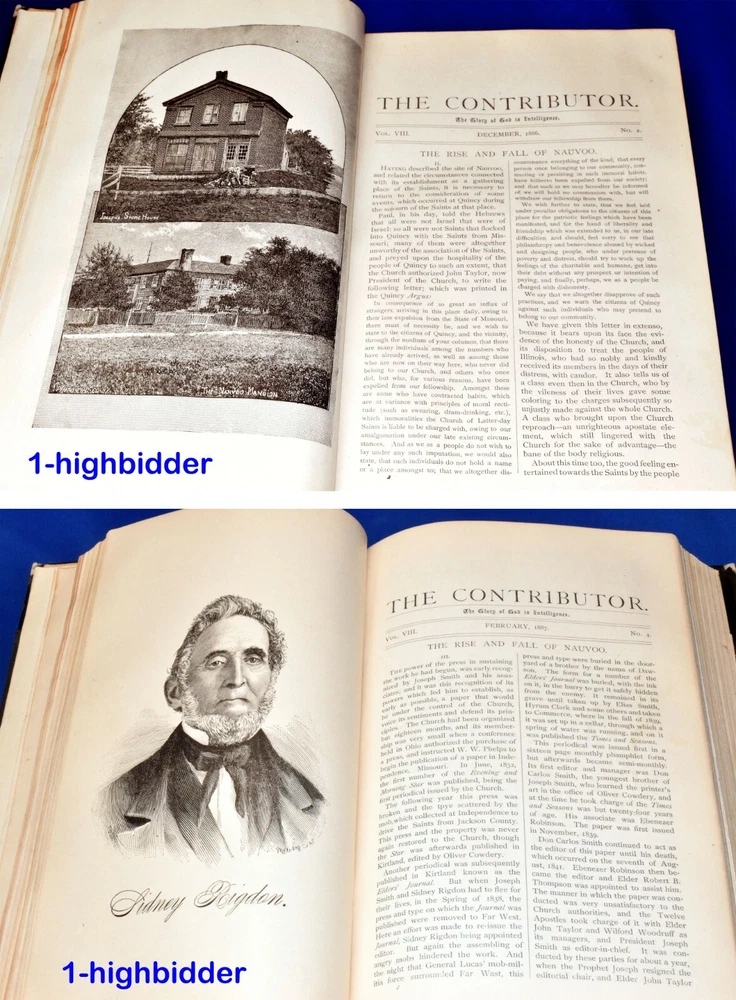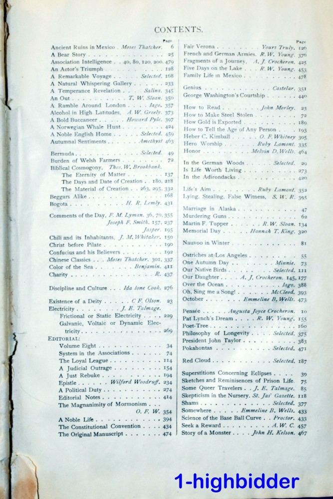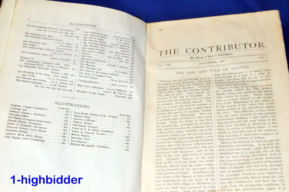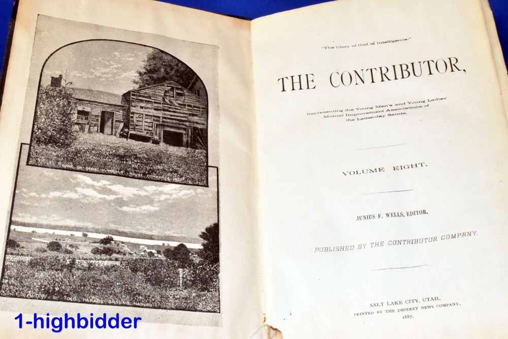 1887 The Contributor Young Mens & Ladies Mutual Improvement Assoc. LDS Mormon _____________________________________ The Contributor: A Monthly Magazine Representing the Young Men's & Young Ladies Mutual Improvement Associations of the Latter-Day Saints, Volume Eight by Junius F. Wells (editor) Published by Junius F. Wells, Salt Lake City (1887) Condition: Good condition 1st Edition Hardcover Book! The binding is tight and all 480 pages within are present. There is some yellowing throughout the book and a few pages at the beginning of the book do have some tearing (shown) but considering it is over 130 years old, the condition is very tolerable. The covers look good with wear appropriate, as can be seen in my photos. You will be happy with this one! Always handled carefully and packaged securely! Buy with confidence from a seller who takes the time to show you the details and not use just stock photos. Please check out all my pictures and email with any questions! Thanks for looking! About the Book: This is complete bound set of all volume 8 issues of the Contributor from November 1886 to October 1887 and contains an index for the full year in the front of the book. The Contributor was an independent publication associated with The Church of Jesus Christ of Latter-day Saints (LDS Church) between 1879 and 1896. It was a monthly periodical and sought to represent the Young Men's and Young Ladies' Mutual Improvement Associations (YMMIA and YLMIA respectively), the youth organizations of the LDS Church at the time. It was founded by Junius F. Wells, the inaugural head of the YMMIA. Abraham H. Cannon became editor when the magazine was purchased by the Cannon Publishing Company in 1892. With the death of Cannon in July 1896, The Contributor ceased publication a few months later and was not immediately replaced. The Young Woman's Journal had begun publication in 1889 and it replaced The Contributor for the YLMIA in all but name. However, to provide an official replacement for The Contributor that would cater to both young men and young women, the YMMIA and the YLMIA began publication of the Improvement Era in 1897. Copyright © 2018-2022 TDM Inc. The photos and text in this listing are copyrighted. I spend lots of time writing up my descriptions and despise it when un-original losers cut and paste my descriptions in as their own. It is against ebay policy and if you are caught, you will be reported to ebay and could be sued for copyright infringement and damages.