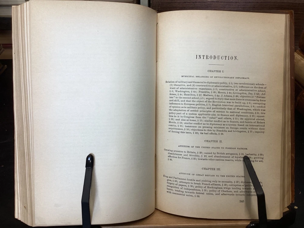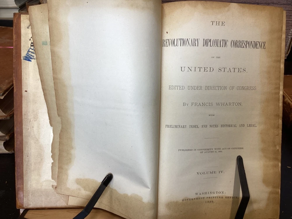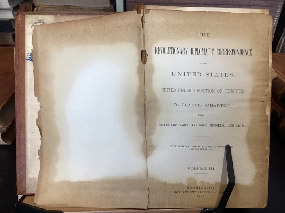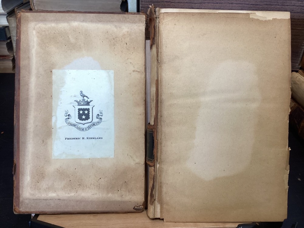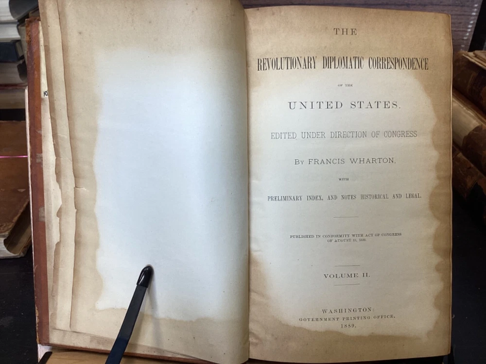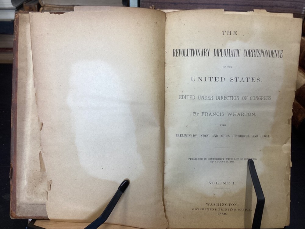 The Revolutionary Diplomatic Correspondence of the United States. Edited Under Direction of Congress by Francis Wharton, with Preliminary Index, and Notes Historical and Legal, Volumes I-V, Government Printing Office, Washington, D.C., 1889, 666pp, 875pp, 883pp, 869pp, 881pp, leather, 6 x 9”, 8vo Poor condition/as is. Wear and chipping to all boards. Front and rear boards of volumes I, III, and IV are completely detached from binding. Front board of volume V is completely detached from binding. All remaining joints show some level of cracking. Spines are lacking on volumes I, IV, and V. Spines of II and III show cracking and chipping. Provenance bookplate for Frederic Richardson Kirkland on front pastedown of all volumes. Bookplate for The Historical Society of Pennsylvania on front pastedown of volumes II-V. Toning, age-staining, and tea-staining throughout all textblocks. Marginalia scattered throughout textblocks. Please see photos and ask any questions prior to purchase. Please note that this listing is for volumes I-V of a six volume set. Frederic Richardson Kirkland (1887-1961) was an investment broker, amateur historian, and collector. He served as the treasurer of the Pennsylvania Historical Society and his valuable library was auctioned after his death by Parke-Berner Galleries in March of 1962. Volumes I-V of a set of important Revolutionary War source records. These records were originally published as a supplement to Francis Wharton’s “Digest of the International Law of the U.S.” which was taken from documents issued by presidents and secretaries of state, etc. Also includes “A Brief sketch of the life of Francis Wharton, by John Bassett Moore”. FORN-SHELF-0610-BB-2405-JC761