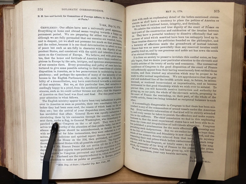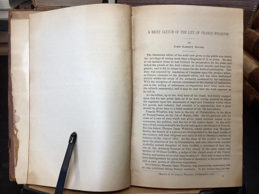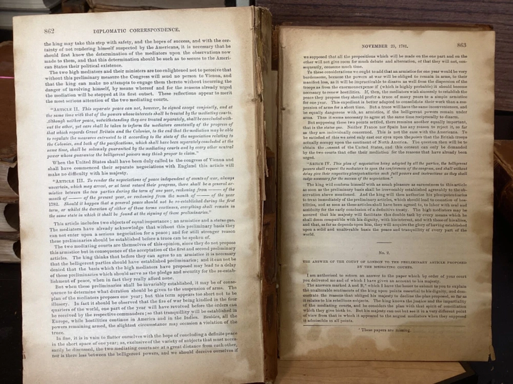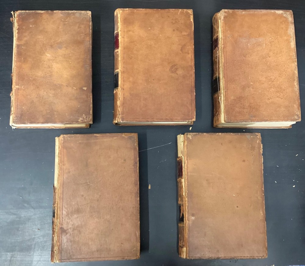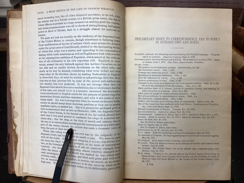 The Revolutionary Diplomatic Correspondence of the United States. Edited Under Direction of Congress by Francis Wharton, with Preliminary Index, and Notes Historical and Legal, Volumes I-V, Government Printing Office, Washington, D.C., 1889, 666pp, 875pp, 883pp, 869pp, 881pp, leather, 6 x 9”, 8vo Poor condition/as is. Wear and chipping to all boards. Front and rear boards of volumes I, III, and IV are completely detached from binding. Front board of volume V is completely detached from binding. All remaining joints show some level of cracking. Spines are lacking on volumes I, IV, and V. Spines of II and III show cracking and chipping. Provenance bookplate for Frederic Richardson Kirkland on front pastedown of all volumes. Bookplate for The Historical Society of Pennsylvania on front pastedown of volumes II-V. Toning, age-staining, and tea-staining throughout all textblocks. Marginalia scattered throughout textblocks. Please see photos and ask any questions prior to purchase. Please note that this listing is for volumes I-V of a six volume set. Frederic Richardson Kirkland (1887-1961) was an investment broker, amateur historian, and collector. He served as the treasurer of the Pennsylvania Historical Society and his valuable library was auctioned after his death by Parke-Berner Galleries in March of 1962. Volumes I-V of a set of important Revolutionary War source records. These records were originally published as a supplement to Francis Wharton’s “Digest of the International Law of the U.S.” which was taken from documents issued by presidents and secretaries of state, etc. Also includes “A Brief sketch of the life of Francis Wharton, by John Bassett Moore”. FORN-SHELF-0610-BB-2405-JC761