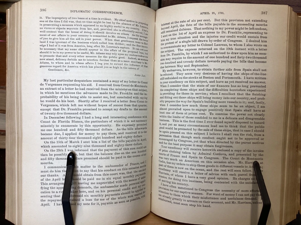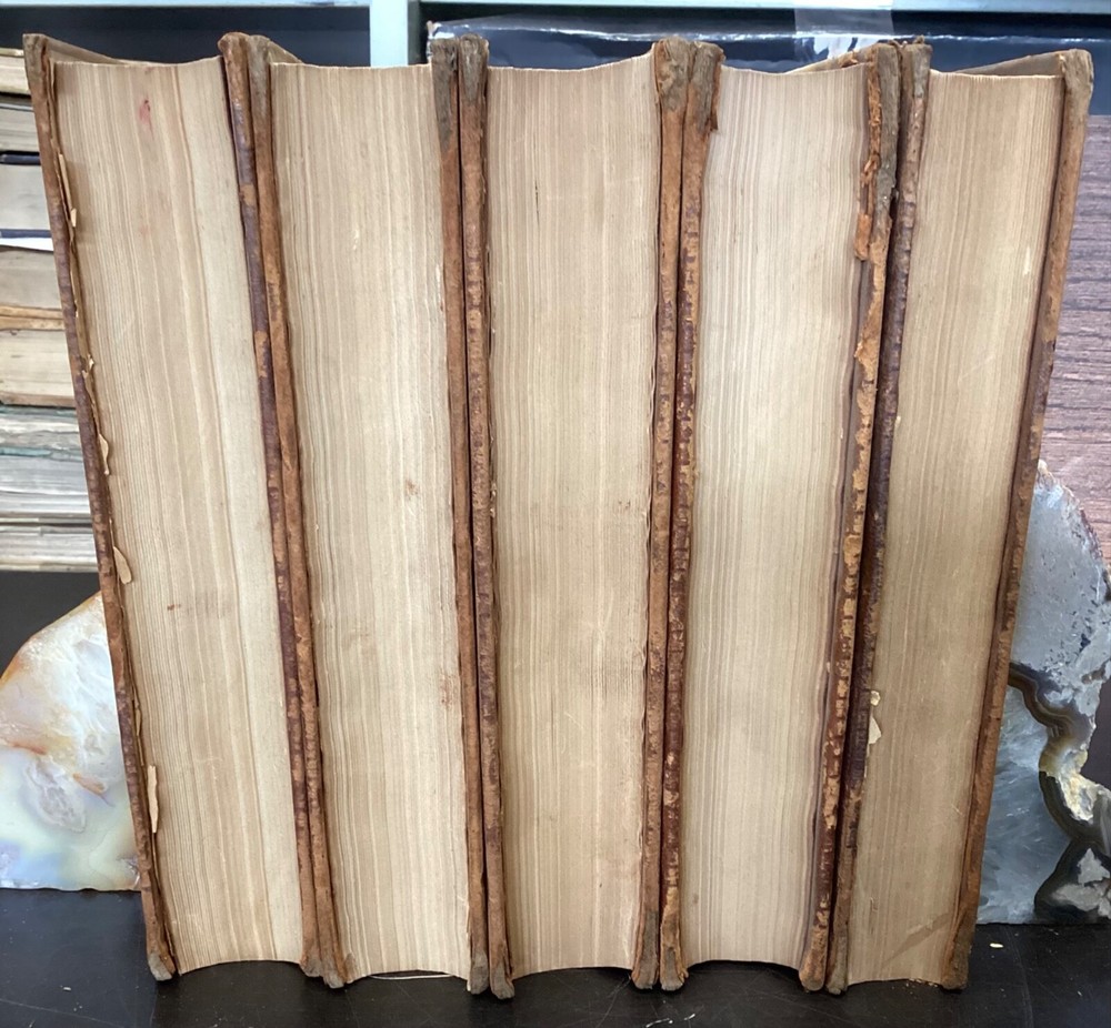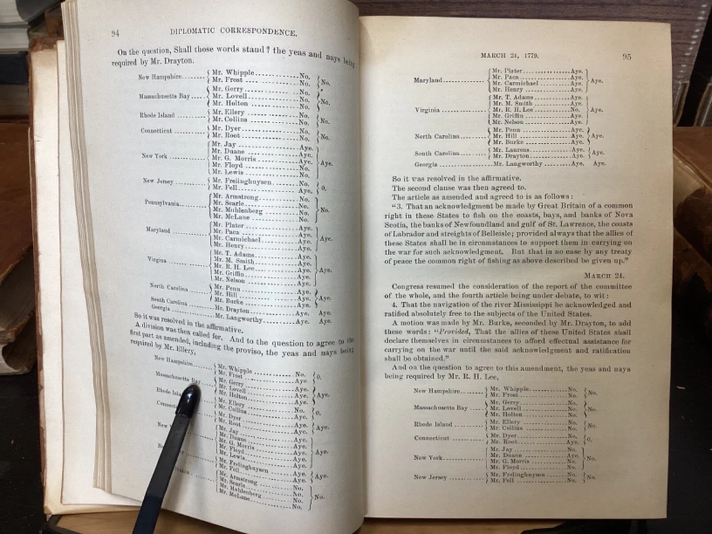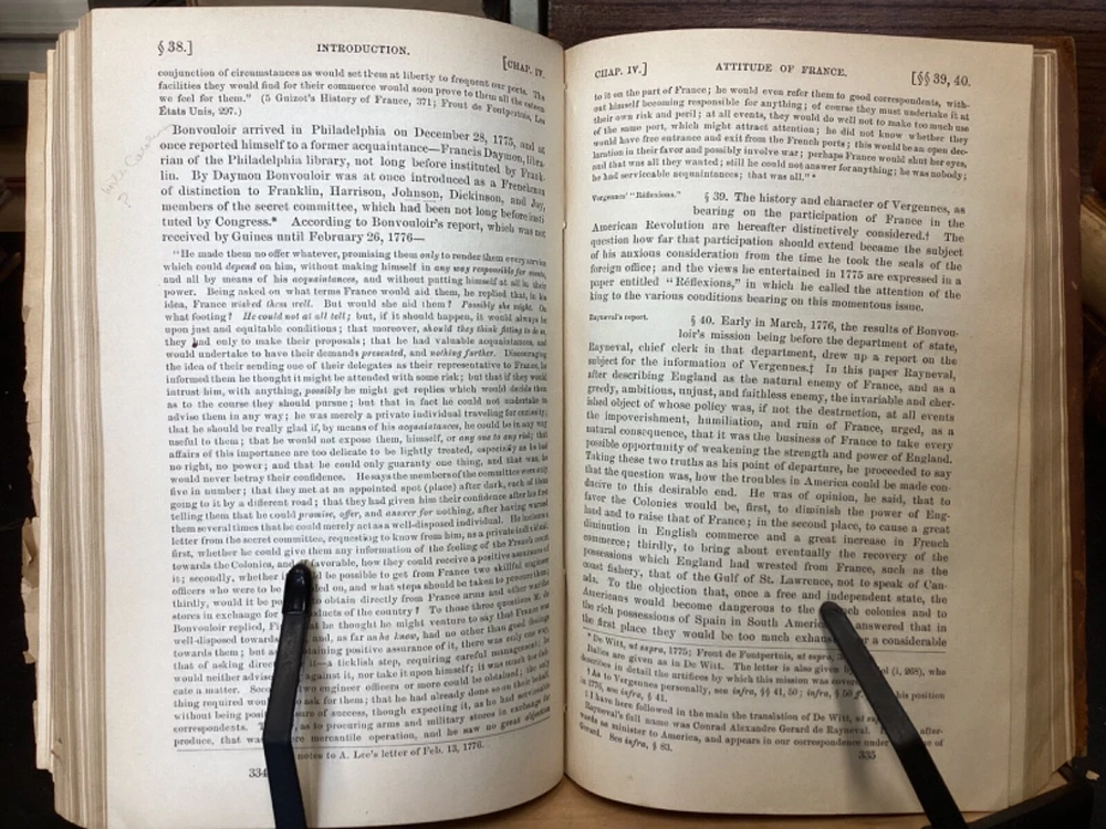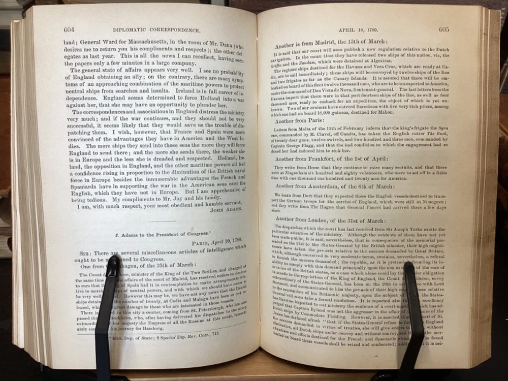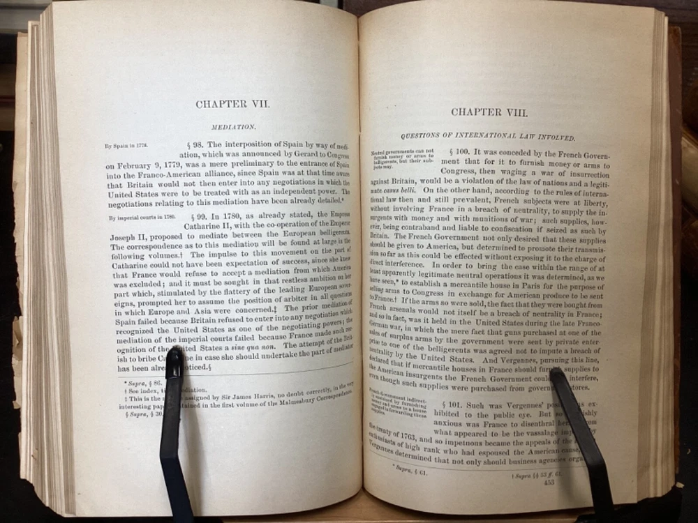 The Revolutionary Diplomatic Correspondence of the United States. Edited Under Direction of Congress by Francis Wharton, with Preliminary Index, and Notes Historical and Legal, Volumes I-V, Government Printing Office, Washington, D.C., 1889, 666pp, 875pp, 883pp, 869pp, 881pp, leather, 6 x 9”, 8vo Poor condition/as is. Wear and chipping to all boards. Front and rear boards of volumes I, III, and IV are completely detached from binding. Front board of volume V is completely detached from binding. All remaining joints show some level of cracking. Spines are lacking on volumes I, IV, and V. Spines of II and III show cracking and chipping. Provenance bookplate for Frederic Richardson Kirkland on front pastedown of all volumes. Bookplate for The Historical Society of Pennsylvania on front pastedown of volumes II-V. Toning, age-staining, and tea-staining throughout all textblocks. Marginalia scattered throughout textblocks. Please see photos and ask any questions prior to purchase. Please note that this listing is for volumes I-V of a six volume set. Frederic Richardson Kirkland (1887-1961) was an investment broker, amateur historian, and collector. He served as the treasurer of the Pennsylvania Historical Society and his valuable library was auctioned after his death by Parke-Berner Galleries in March of 1962. Volumes I-V of a set of important Revolutionary War source records. These records were originally published as a supplement to Francis Wharton’s “Digest of the International Law of the U.S.” which was taken from documents issued by presidents and secretaries of state, etc. Also includes “A Brief sketch of the life of Francis Wharton, by John Bassett Moore”. FORN-SHELF-0610-BB-2405-JC761
