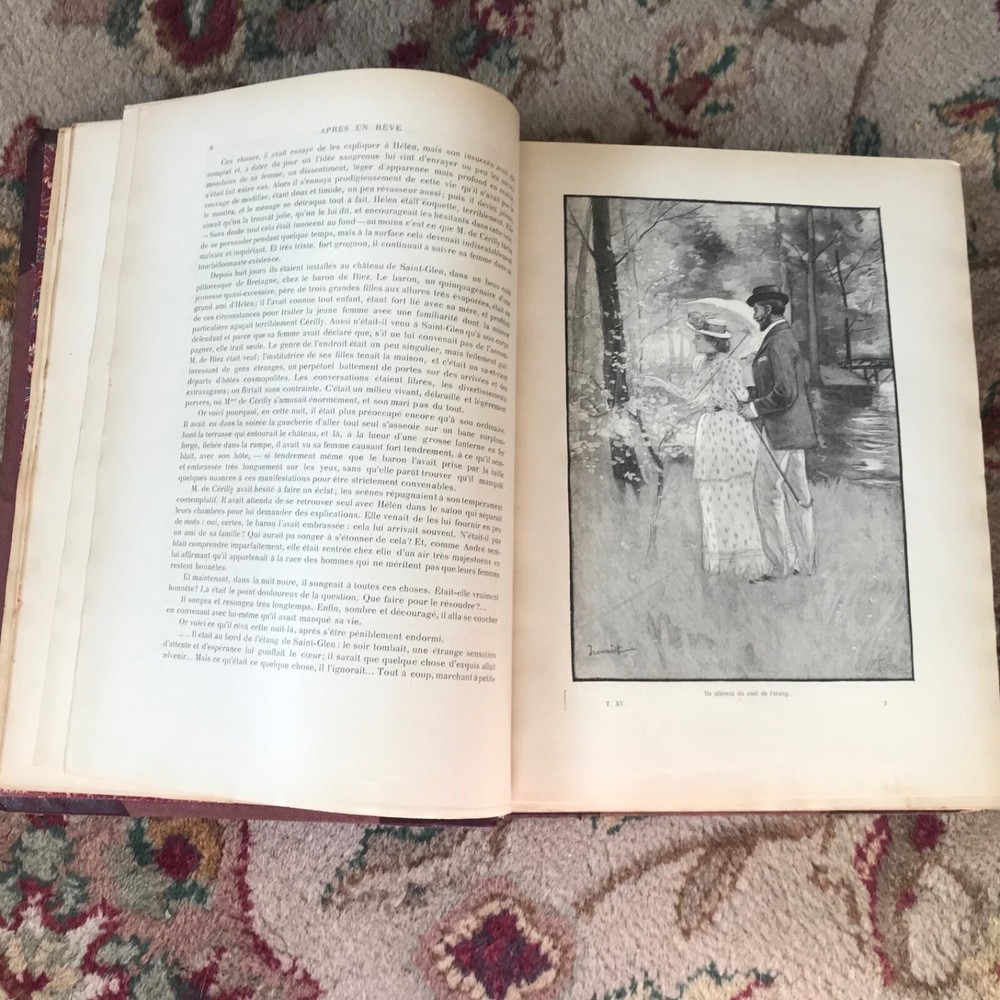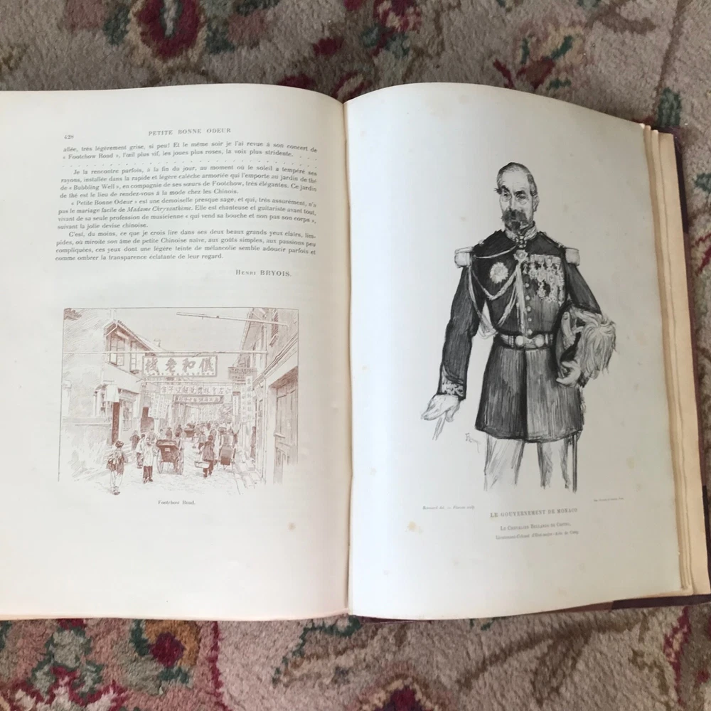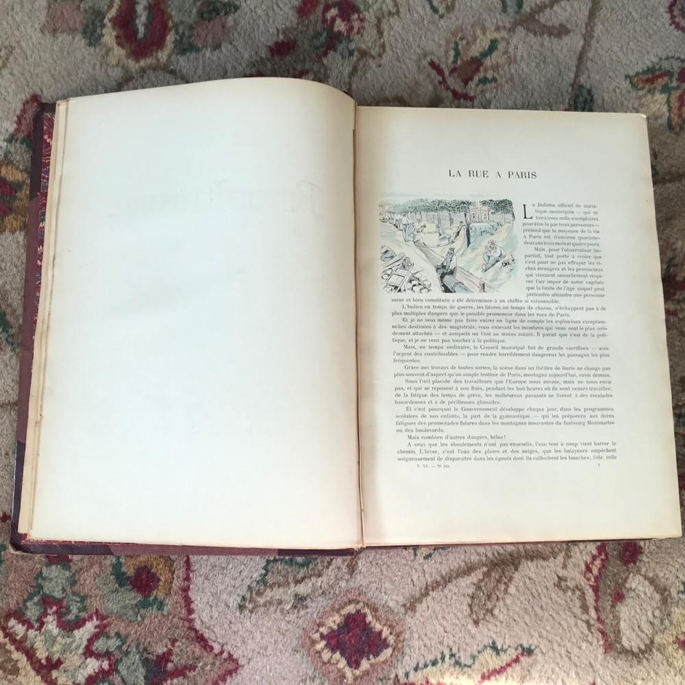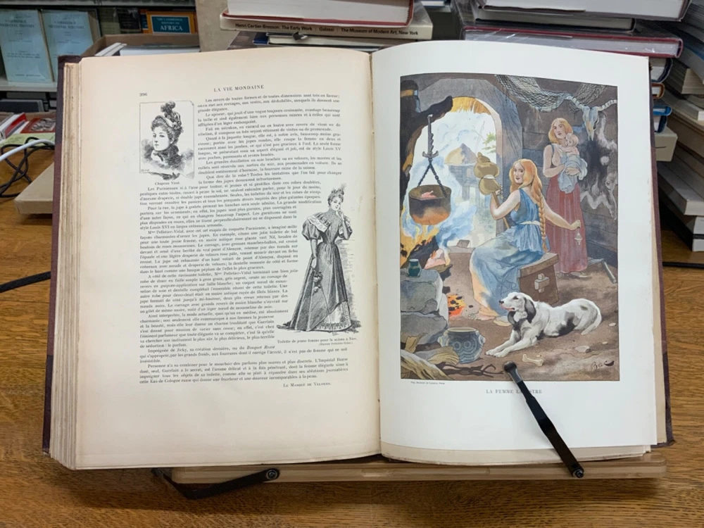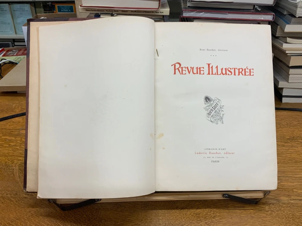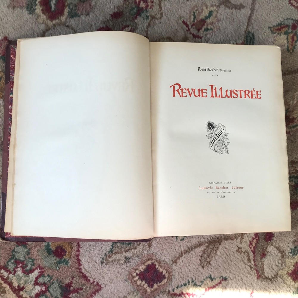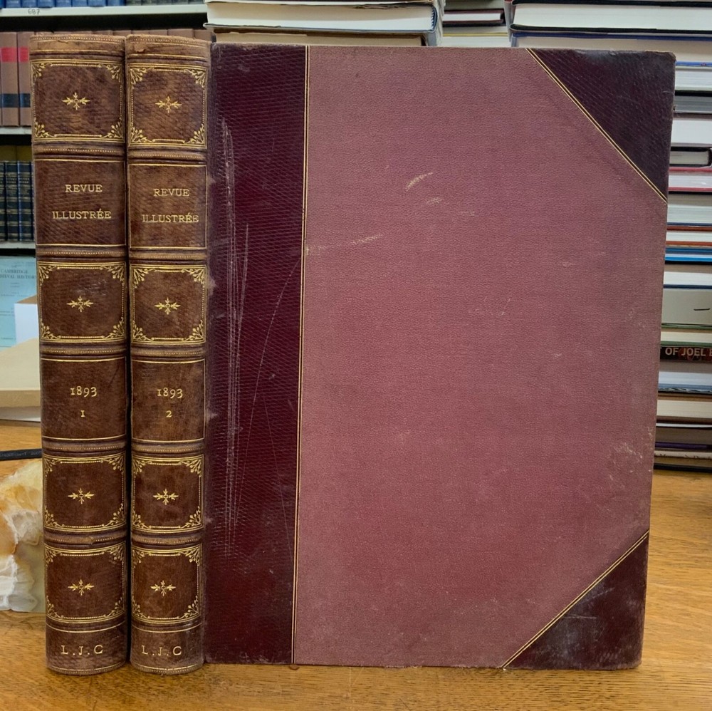 Revue Illustrée, Rene Baschet, Lodovic Baschet, Paris, 1893, 438 pp, 444 pp, 3/4 leather, 13 x 9.75”, 4tos. In good condition. Lovely monogrammed binding. Maroon leather is lightly scuffed along edges, more moderate at tips. Light fading overall to cloth segments. Gilt finishing bright and clean. Leather lightly faded on spine. Printed marbled end papers. Interior typically age-toned with nominal foxing. Binding intact. Free of ownership. Please see photos. Revue Illustrée was a French language biweekly arts magazine which was published between 1885 and 1912 in Paris, France. COLI1893ABJB 11/23 - HK879