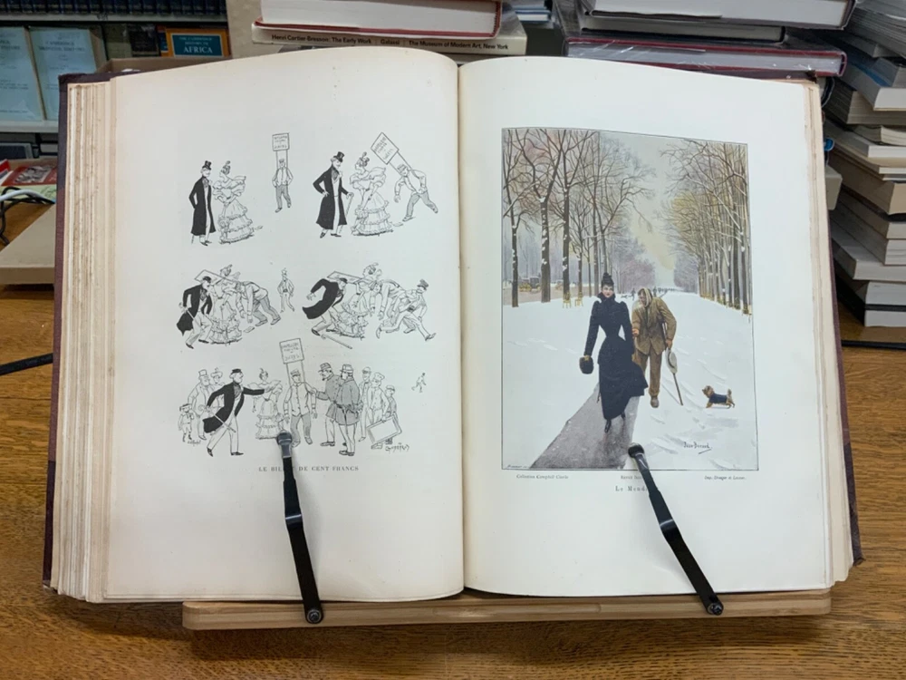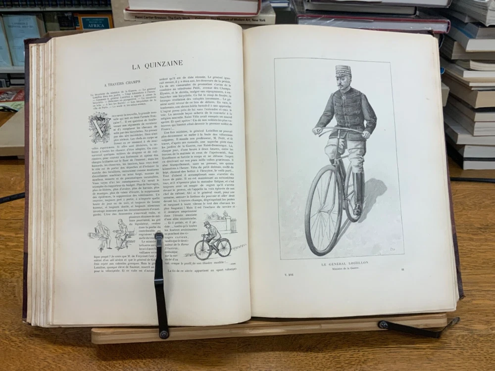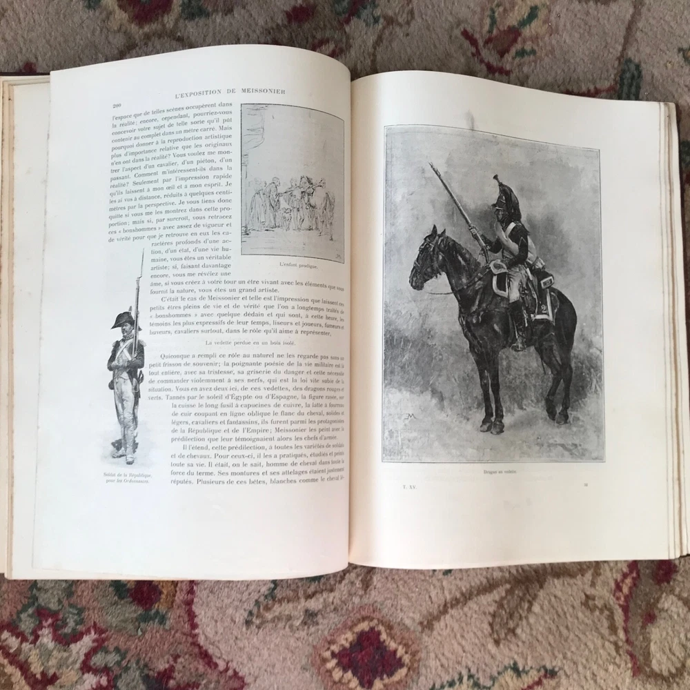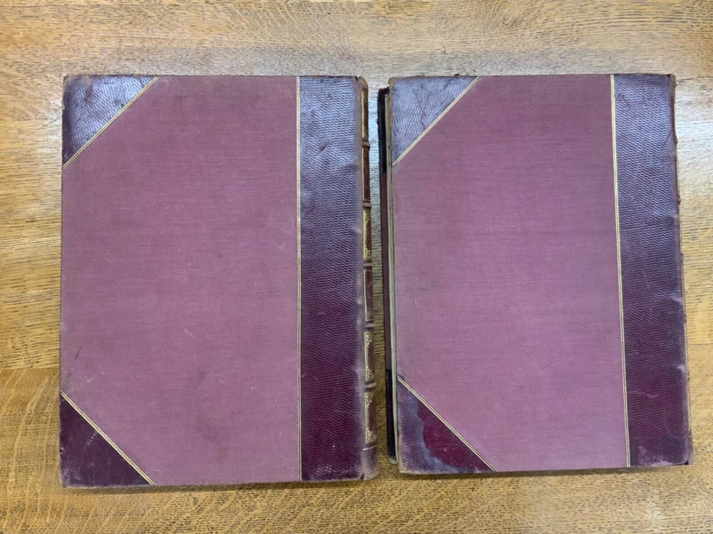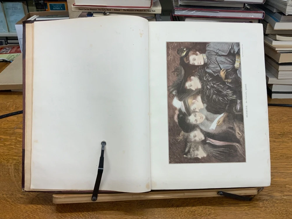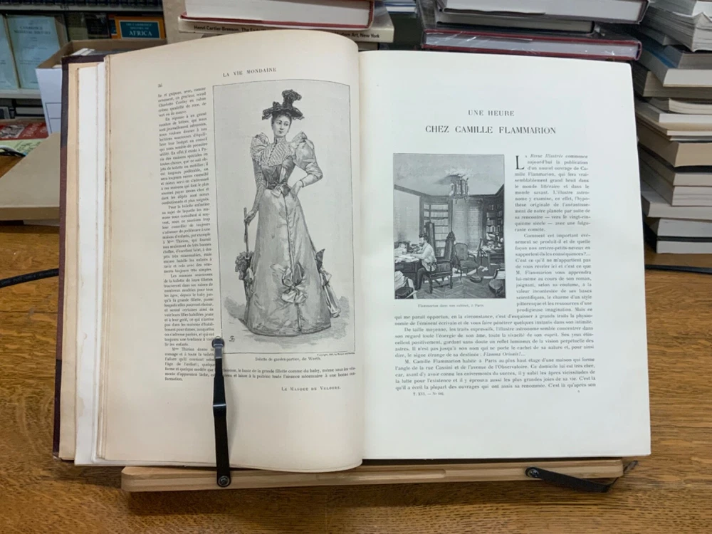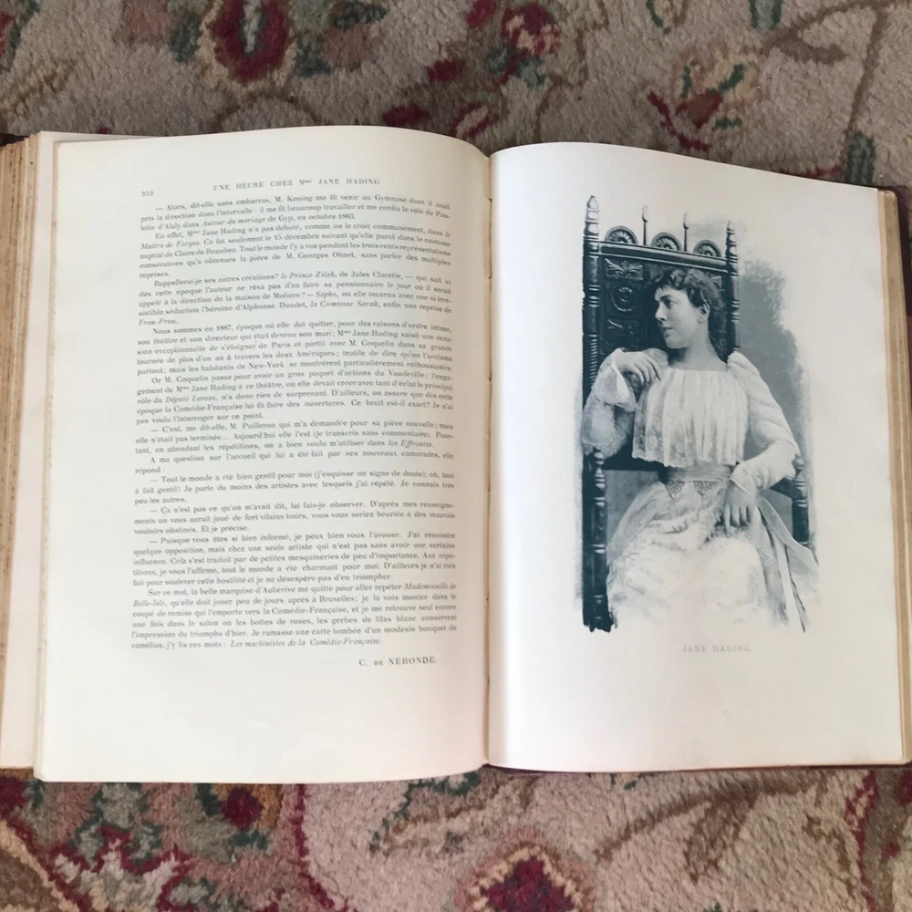 Revue Illustrée, Rene Baschet, Lodovic Baschet, Paris, 1893, 438 pp, 444 pp, 3/4 leather, 13 x 9.75”, 4tos. In good condition. Lovely monogrammed binding. Maroon leather is lightly scuffed along edges, more moderate at tips. Light fading overall to cloth segments. Gilt finishing bright and clean. Leather lightly faded on spine. Printed marbled end papers. Interior typically age-toned with nominal foxing. Binding intact. Free of ownership. Please see photos. Revue Illustrée was a French language biweekly arts magazine which was published between 1885 and 1912 in Paris, France. COLI1893ABJB 11/23 - HK879