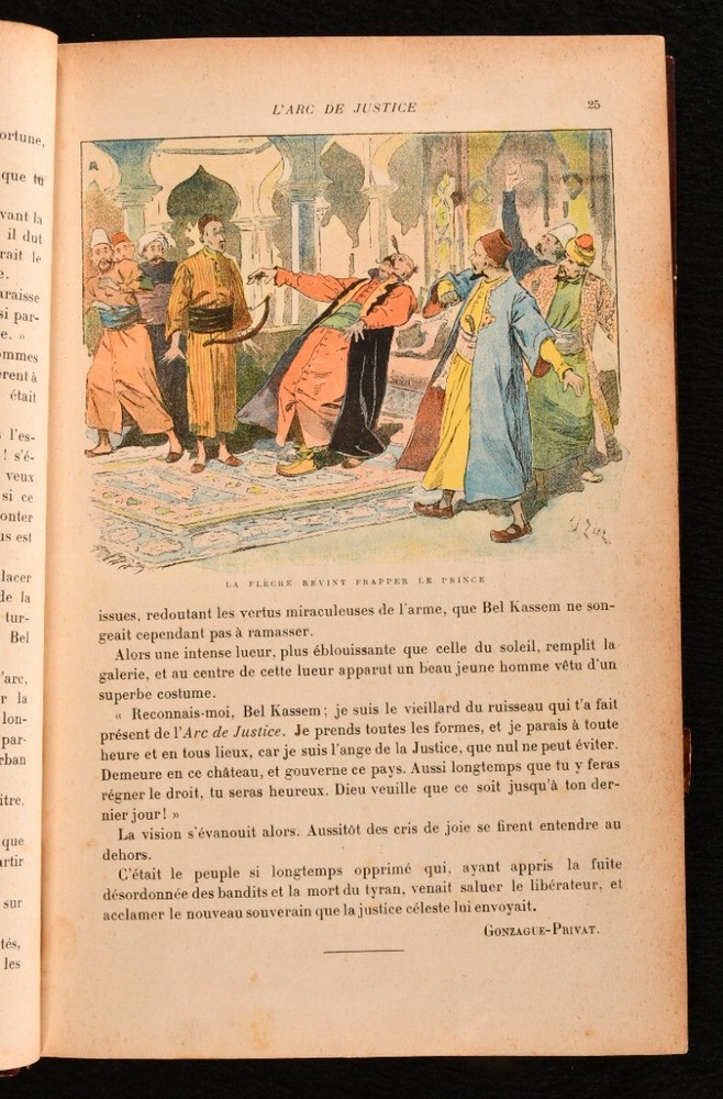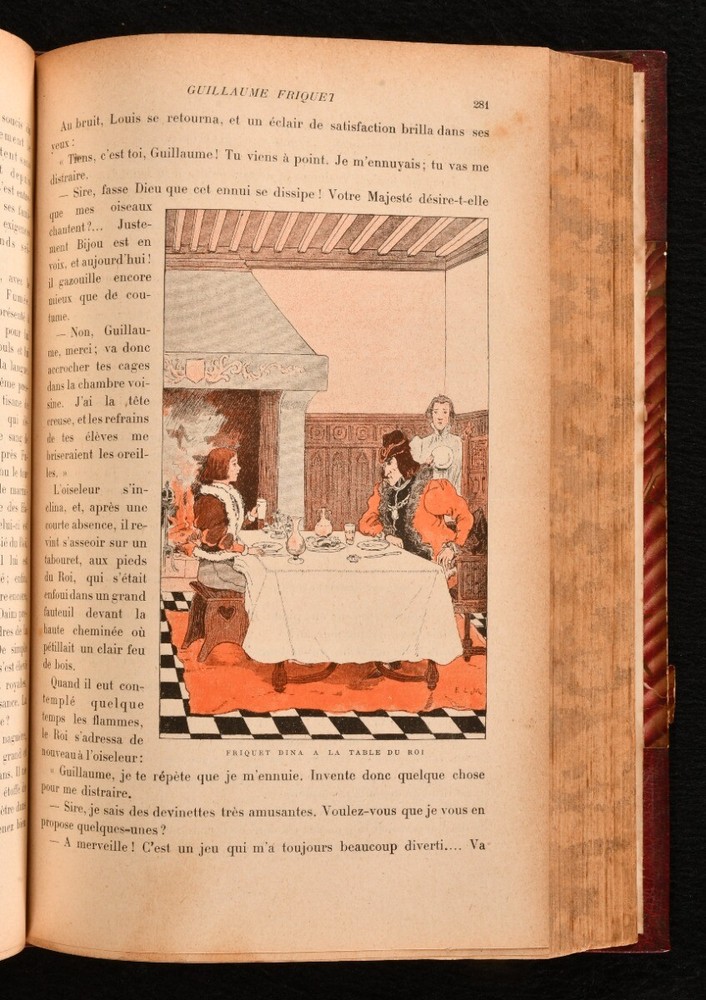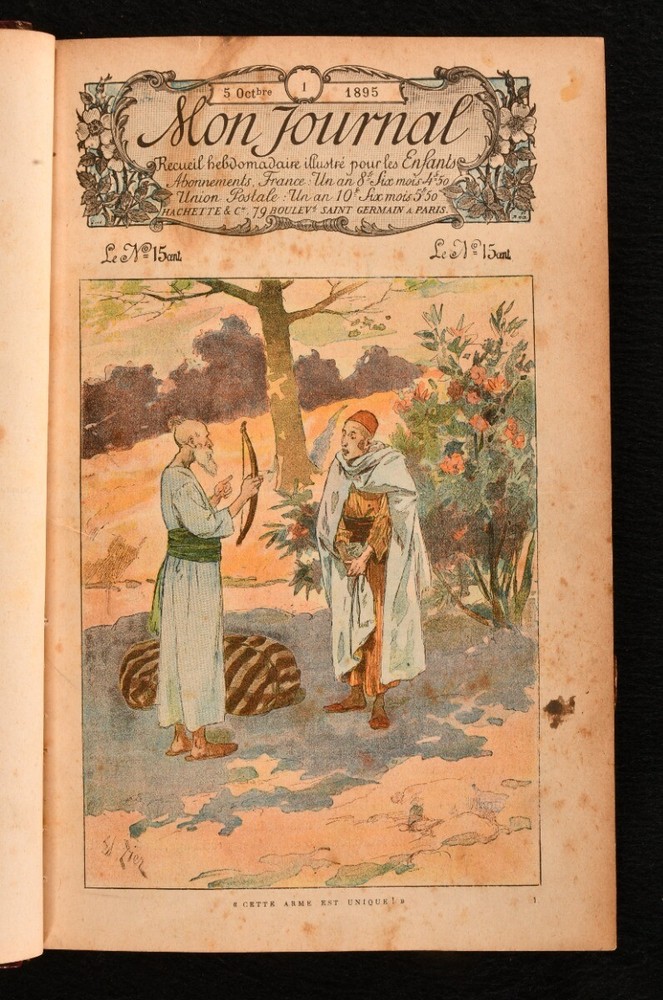 Click here to see our other books! mon Journal Recueil Hebomadaire Illustre de Gravures en Couleur et en Noir pour les Enfants de 8 a 12 Ans Various 1895-6 Librairie Hachette : Paris 10" by 6.5" [4], 608pp. SUMMARY A collection of the issues from October 1895 to June 1896 of this French weekly juvenile magazine, with illustrations both in colour and in black and white. Colour Plates,First Edition,Illustrated,Leather Binding,Pleasing Copy,Rebound Overall Condition: Very Good This book weighs 1.5 KG when packed UK Postage: £ 3.99 US Postage: £ 23.99 EU Postage : £ 18.99 European Postage: £ 19.99 Asia Postage: £ 31.99 Worldwide Postage: £ 32.99 DESCRIPTION A collection of thirty-eight issues from this weekly illustrated magazine for children bound in one. Containing a series of short stories, poetry and music by a variety of authors such as H. and C. Guy, Gonzague Privat, and Eugene Le Mouel among others. Each issue presents a full page colour title page and other illustrations in text both in colour and in black and white. Comprising all consecutive issues from 5 Octobre 1895 No. 1 to 20 June 1896 No. 38. Pagination is continuous. Bound in a lovely half morocco binding. Title page for the 1894-5 volume, with half title included. CONDITION In a half morocco binding over marbled boards and edges, gilt tooling to the spine. Externally very smart with only minor shelf wear, minor rubbing to the spine and boards. The front hinge is only lightly strained, holding firm. The volume firmly bound. Some spotting scattered to the leaves, which are also lightly age toned, as usual due to the type of paper used. Illustrated in text with both black and white and coloured illustrations. Overall Condition: Very Good GLOSSARY OF TERMS Overall Condition (Dustwrapper condition rating is shown after that for the book itself, where a dustwrapper is present) Fine - Very well preserved copy showing very little wear Very Good Indeed - Only one or two minor faults, really a very attractive copy Very Good - Quite a wide term meaning no major faults but probably several smaller ones often expected given the age of the book, but still a respectable copy Good - Meaning not very good. Some more serious faults as will be described in the condition report under 'condition' Good Only - Meaning one or more faults that could really do with repair Fair - As with good only above but with other faults leaving a compromised copy even after repair Poor - Really bad and possibly seriously incomplete. We only sell books in this condition where their rarity or value makes them attractive none the less. Major defects will be described. GUARANTEE We offer a full money back guarantee on our descriptions. Please ask for details and conditions. We prefer PAYPAL. If you pay via PAYPAL we will post the item off the same or the next working day with the postage you have selected. Please note we cannot accept USD cheques