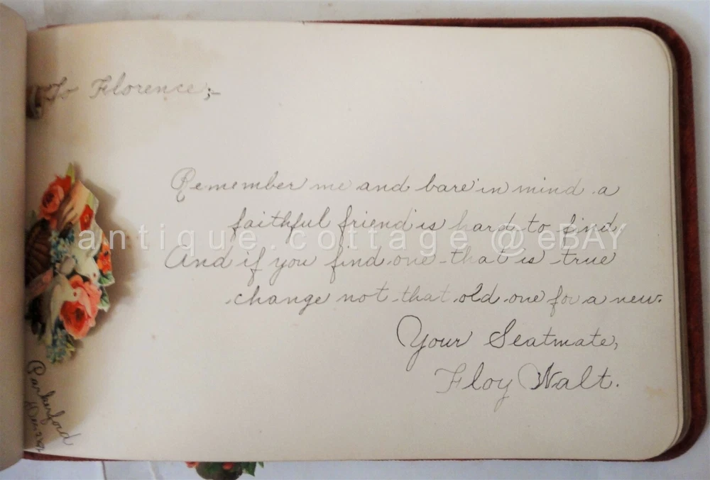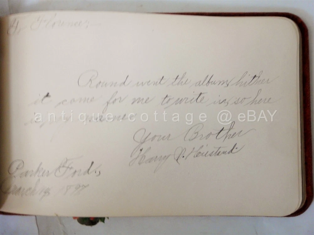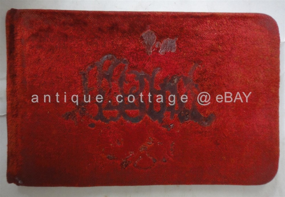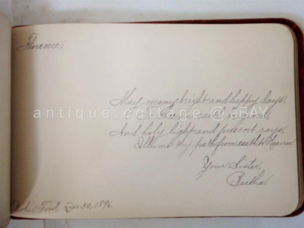 1898 antique AUTOGRAPH ALBUM parker ford pa FLORENCE HEISTAND SCROLL DOWN for MORE PHOTOS in DESCRIPTION Click HERE to view or search ANTIQUE.COTTAGE listings. 1898 antique AUTOGRAPH ALBUM parker ford pa FLORENCE HEISTAND This listing is for the autograph album shown. Owner: FLORENCE HEISHAND Antique wear as shown. Foxing on pages and wear to pages. A couple detached but included pages. Velvet fabric cover is has light antique wear. A couple of the entries are fading. All but one is 1800s. You get the following pages: - anna l. dickinson, packer ford school - Irma M. Frick - Stauffer - Gertrude Fisher, Spring City - 1897 Arthur B. Orr, Phoenixville, pa - Reba E. Brownback - 1899 Hannah Brownback (grandmother) - elizabeth sonder 1896 - floyd walt, parkerford - harry heistand, parker ford, 1897, (brother) - Floy Walt Seatmate - Sadie Raw - Bertha Christman (schoolmate) 1896 - 1896 Bertha (sister) parker ford - Rev. J. B. MacKay (1902) - 1897 Amer S. Evans, Parker Ford - the rest are blank. There are a couple of victorian diecuts. Excellent original early family, and/or town genealogy, history, antique, museum, collectible heirloom and/or ephemera. CONDITION : See listing description and photos; GLUE REMAINS on velvet cover where ALBUM and embellishments were previously attached. - International buyers are responsible to pay VAT or other Taxes to their countries as required. - eBAY collects and remits sales tax on behalf of several states. If you are a dealer, you can write to eBay to file a form to become tax exempt. LOC: LOC2: BOOKSHELF01-TM Powered by SixBit's eCommerce Solution