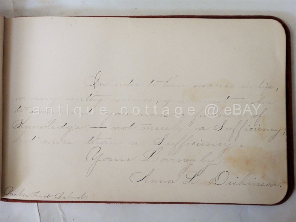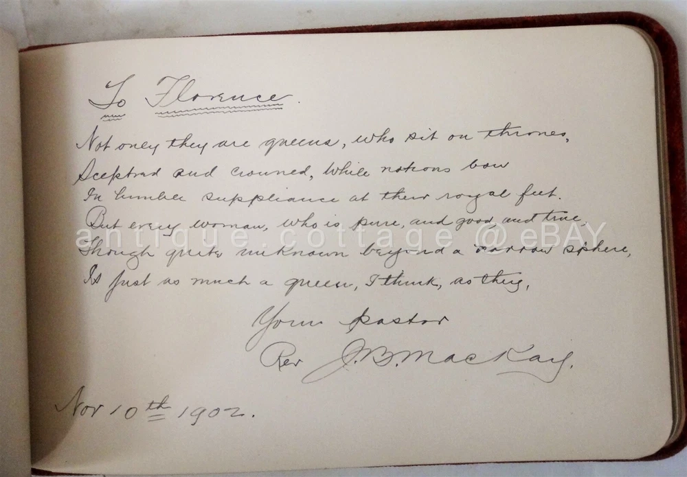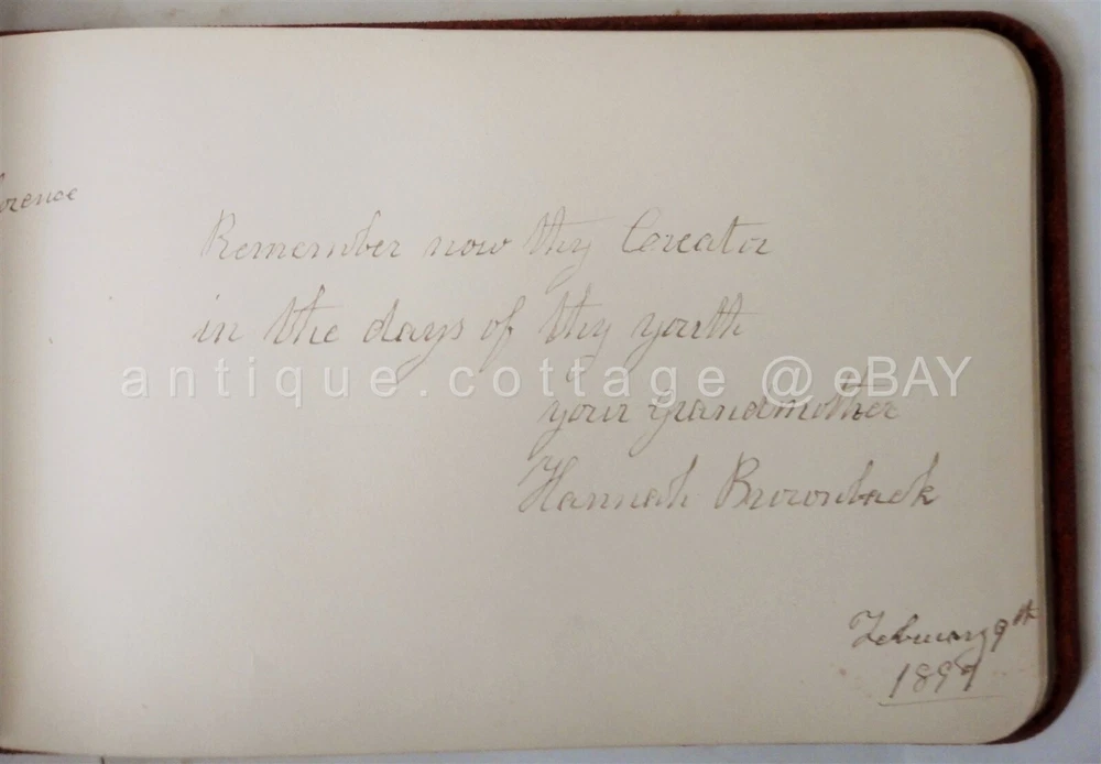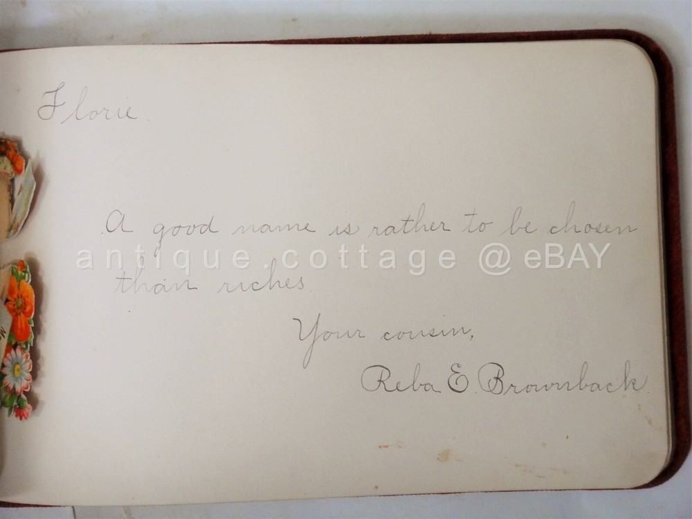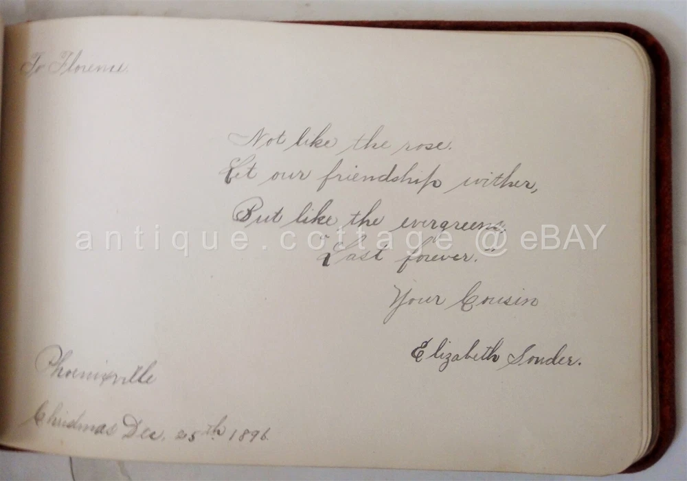 1898 antique AUTOGRAPH ALBUM parker ford pa FLORENCE HEISTAND SCROLL DOWN for MORE PHOTOS in DESCRIPTION Click HERE to view or search ANTIQUE.COTTAGE listings. 1898 antique AUTOGRAPH ALBUM parker ford pa FLORENCE HEISTAND This listing is for the autograph album shown. Owner: FLORENCE HEISHAND Antique wear as shown. Foxing on pages and wear to pages. A couple detached but included pages. Velvet fabric cover is has light antique wear. A couple of the entries are fading. All but one is 1800s. You get the following pages: - anna l. dickinson, packer ford school - Irma M. Frick - Stauffer - Gertrude Fisher, Spring City - 1897 Arthur B. Orr, Phoenixville, pa - Reba E. Brownback - 1899 Hannah Brownback (grandmother) - elizabeth sonder 1896 - floyd walt, parkerford - harry heistand, parker ford, 1897, (brother) - Floy Walt Seatmate - Sadie Raw - Bertha Christman (schoolmate) 1896 - 1896 Bertha (sister) parker ford - Rev. J. B. MacKay (1902) - 1897 Amer S. Evans, Parker Ford - the rest are blank. There are a couple of victorian diecuts. Excellent original early family, and/or town genealogy, history, antique, museum, collectible heirloom and/or ephemera. CONDITION : See listing description and photos; GLUE REMAINS on velvet cover where ALBUM and embellishments were previously attached. - International buyers are responsible to pay VAT or other Taxes to their countries as required. - eBAY collects and remits sales tax on behalf of several states. If you are a dealer, you can write to eBay to file a form to become tax exempt. LOC: LOC2: BOOKSHELF01-TM Powered by SixBit's eCommerce Solution