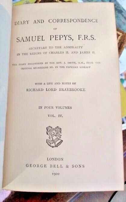 Greetings! Old Saratoga Books is pleased to offer: Diary and Correspondence of Samuel Pepys, F.R.S.: Secretary to the Admiralty in the Reigns of Charles II and James II: The Diary Deciphered by the Rev. J. Smith, A.M., from the Original Shorthand Ms. in the Pepysian Library, with a Life and Notes by Richard Lord Braybrooke. Four volumes. London: George Bell and Sons, 1900. Three-quarter brown leather with marbled side and matching endpapers. Top edges gilt. Two gilt-stamped lettering pieces on spines of each volume and three gilt fleurons stamped in other spine compartments. Several engravings in each volume. Good condition. Boards worn, lettering piece corner chipped on volume II, owner name (Edward Willis) on front flyleaves, two small brown spots on marbled area of volume III front boards, pages toned. A handsome set. Thank you for visiting our auctions. Old Saratoga Books owners Dan and Rachel Jagareski have been selling books since 1996. We had an open shop for twenty years in the historic village of Schuylerville and now sell books exclusively online. We are members of the Independent Online Booksellers Association (IOBA).