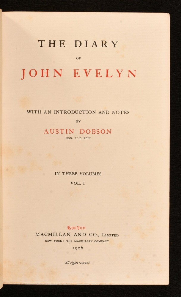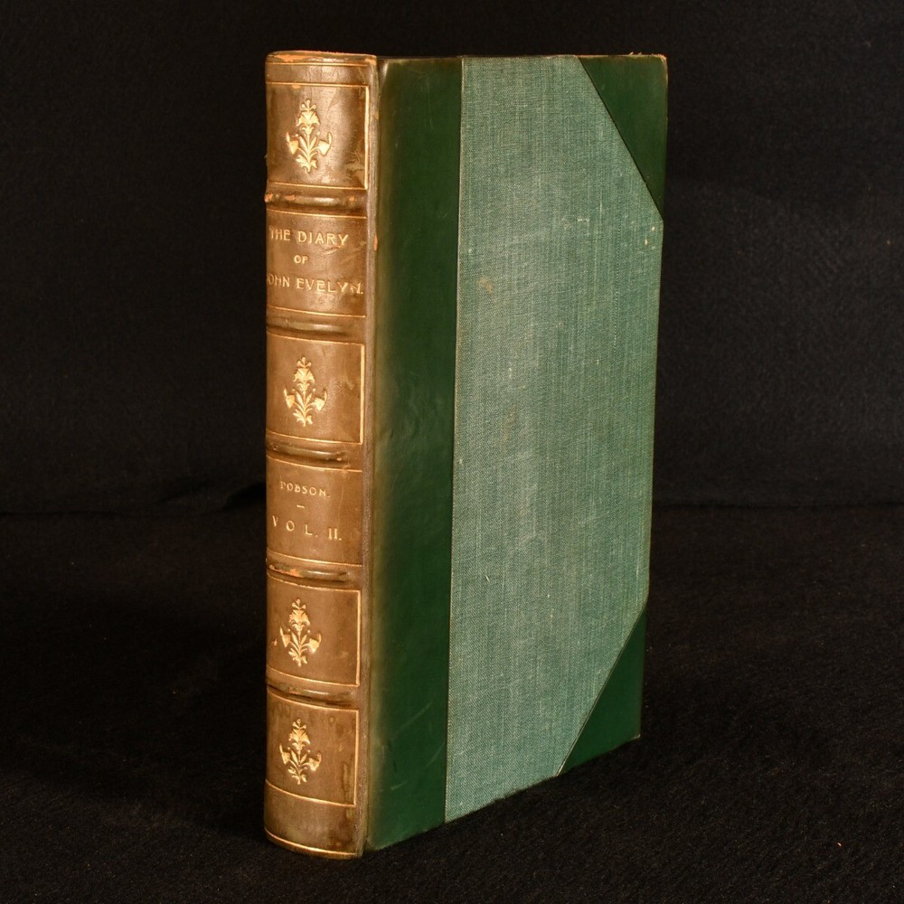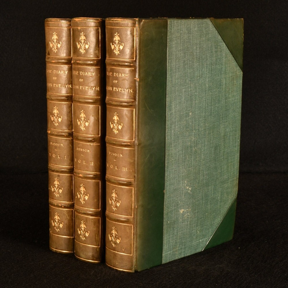 Click here to see our other books! The Diary of John Evelyn John Evelyn; Austin Dobson 1906 Macmillan and Co., Limited : London 9" by 5.5" lxxiv, 355; vi, 398; vi, 479pp. SUMMARY A complete, three volume set of Austin Dobson's compilation of John Evelyn's diaries, smartly bound in half calf. Folding Plates,Illustrated,Leather Binding,Uncommon Overall Condition: Very Good Indeed This book weighs 3 KG when packed UK Postage: £ 3.99 US Postage: £ 36.99 EU Postage : £ 25.99 European Postage: £ 27.99 Asia Postage: £ 47.99 Worldwide Postage: £ 69.99 DESCRIPTION The Dobson Edition. Complete in three volumes. Uniformly bound in a lovely half calf with cloth boards. This work features the diary of John Evelyn, an English writer, gardener, and minor government official who is best known for this diary. Evelyn's diary was extensive, spanning from 1641 to 1697 and covering many historic events such as the execution of Charles I, Oliver Cromwell's rise and death, the Great Plague of London and the Great Fire of London. Edited, with an introduction and notes by English poet and essayist, Austin Dobson. Profusely illustrated throughout, with eighteen plates and a frontispiece to volume I, twenty-four plates and a frontispiece to volume II and fourteen plates and a frontispiece to volume II. Includes maps, portraits and views, some of which are folding. Collated, complete. With the pictorial bookplate of Alexander Stone, a Scottish banker and philanthropist, and the namesake of the Sir Alexander Stone building at Glasgow University. An additional bookplate of Henry T Pearson to the front paste down. CONDITION Bound in half calf with cloth boards. Externally, very smart indeed, with light rubbing to the extremities and spines and the odd mark to boards. Slight fading to the spines. Bookplates to the front paste down and front endpaper. Light spotting to the fore edge. Internally, firmly bound. Pages are generally bright and clean, with the odd spot. Numbered stamp to the front blank. The occasional orn tissue guard. Plate bound to page 97 instead of 113 as stated, in volume III. Overall Condition: Very Good Indeed GLOSSARY OF TERMS Overall Condition (Dustwrapper condition rating is shown after that for the book itself, where a dustwrapper is present) Fine - Very well preserved copy showing very little wear Very Good Indeed - Only one or two minor faults, really a very attractive copy Very Good - Quite a wide term meaning no major faults but probably several smaller ones often expected given the age of the book, but still a respectable copy Good - Meaning not very good. Some more serious faults as will be described in the condition report under 'condition' Good Only - Meaning one or more faults that could really do with repair Fair - As with good only above but with other faults leaving a compromised copy even after repair Poor - Really bad and possibly seriously incomplete. We only sell books in this condition where their rarity or value makes them attractive none the less. Major defects will be described. GUARANTEE We offer a full money back guarantee on our descriptions. Please ask for details and conditions. We prefer PAYPAL. If you pay via PAYPAL we will post the item off the same or the next working day with the postage you have selected. Please note we cannot accept USD cheques