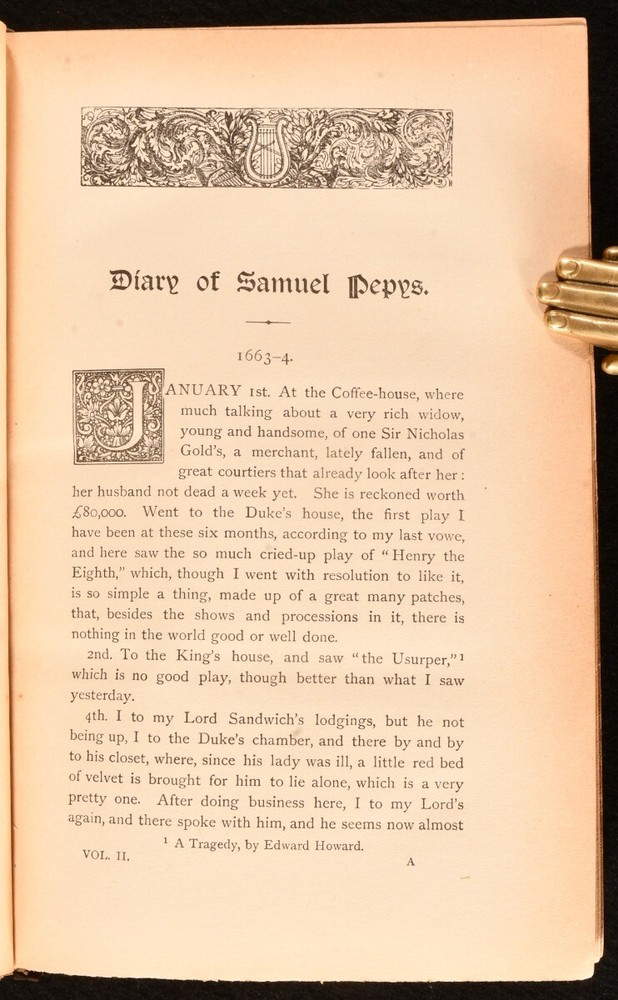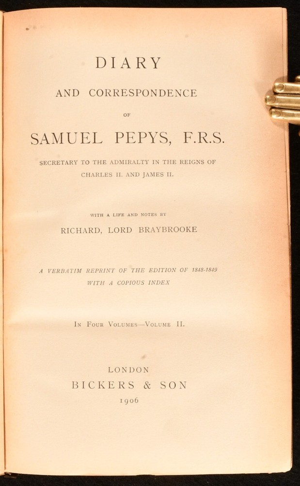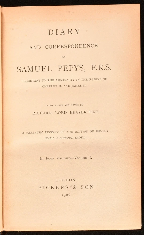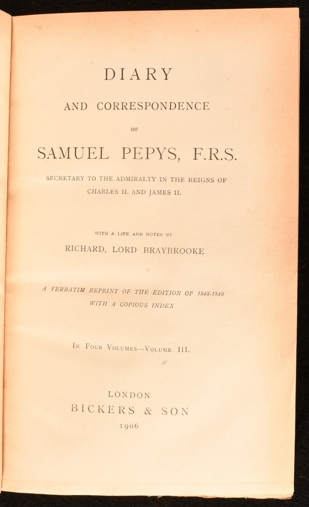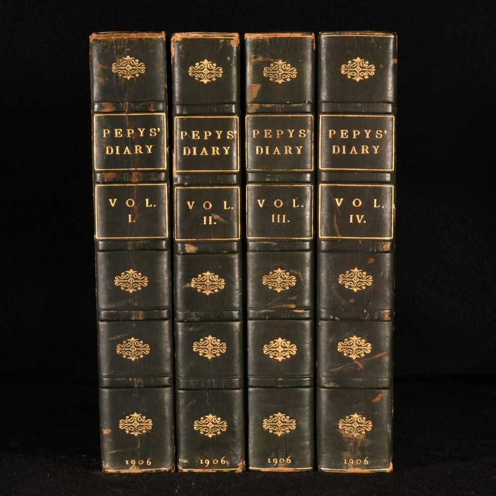 Click here to see our other books! Diary and Correspondence of Samuel Pepys Richard Lord Braybrooke; Samuel Pepys 1906 Bickers & Son : London 9" by 6" viii, 551pp; [4], 471pp; [4], 499pp; [4], 567pp SUMMARY A new edition of this four volume collection of the letters of Samuel Pepys in Bickers & Son signed leather bindings. Early Edition,Leather Binding,Uncommon Overall Condition: Good This book weighs 4 KG when packed UK Postage: £ 4.49 US Postage: £ 39.99 EU Postage : £ 26.99 European Postage: £ 36.99 Asia Postage: £ 65.99 Worldwide Postage: £ 99.99 DESCRIPTION Early edition of Diary and Correspondence of Samuel Pepys by Richard Lord Braybrooke in Bickers & Son signed half calf bindings and cloth boards. Complete in four volumes. This is a verbatim reprint of the edition of 1848-1849 with a copious index. An uncommon edition of this insight into British history. Pepys's diaries are widely considered of great importance to understanding seventeenth century English life. His records include first hand accounts of the 1666 Great Fire of London. CONDITION In half calf bindings and cloth boards. Externally, there is some bumping to the heads and tails of the spines and to the extremities. There is some slight wear to the leather to the head and tail of the spine and the extremities. There are some minor marks to the boards. Internally, firmly bound. The pages are bright and clean with the occasional spot and light age toning. Overall Condition: Good GLOSSARY OF TERMS Overall Condition (Dustwrapper condition rating is shown after that for the book itself, where a dustwrapper is present) Fine - Very well preserved copy showing very little wear Very Good Indeed - Only one or two minor faults, really a very attractive copy Very Good - Quite a wide term meaning no major faults but probably several smaller ones often expected given the age of the book, but still a respectable copy Good - Meaning not very good. Some more serious faults as will be described in the condition report under 'condition' Good Only - Meaning one or more faults that could really do with repair Fair - As with good only above but with other faults leaving a compromised copy even after repair Poor - Really bad and possibly seriously incomplete. We only sell books in this condition where their rarity or value makes them attractive none the less. Major defects will be described. GUARANTEE We offer a full money back guarantee on our descriptions. Please ask for details and conditions. We prefer PAYPAL. If you pay via PAYPAL we will post the item off the same or the next working day with the postage you have selected. Please note we cannot accept USD cheques