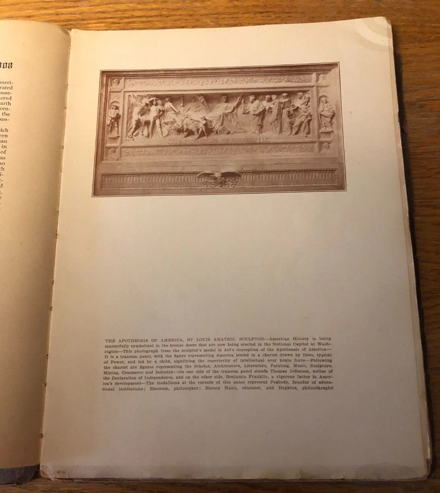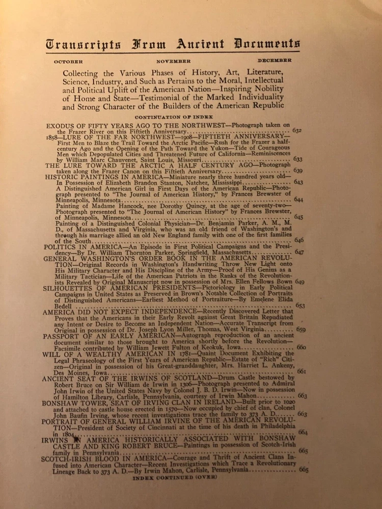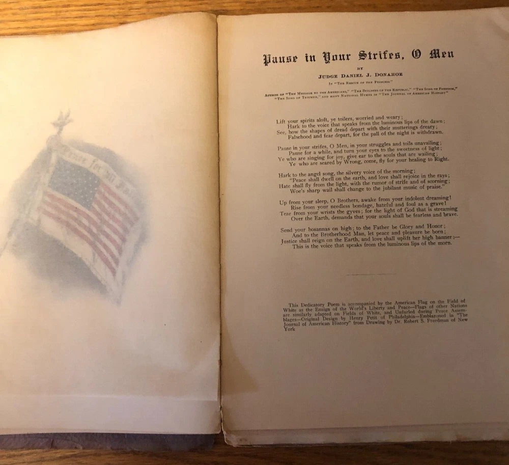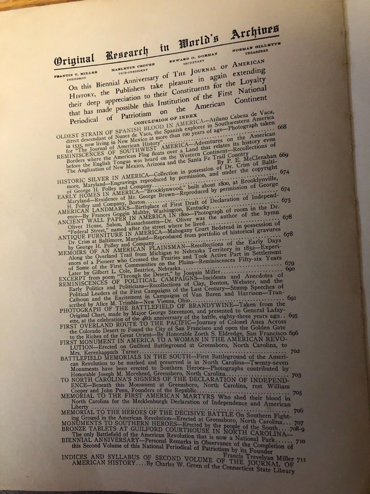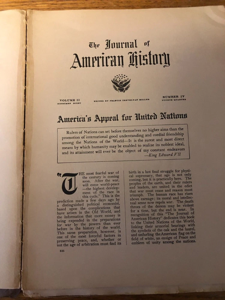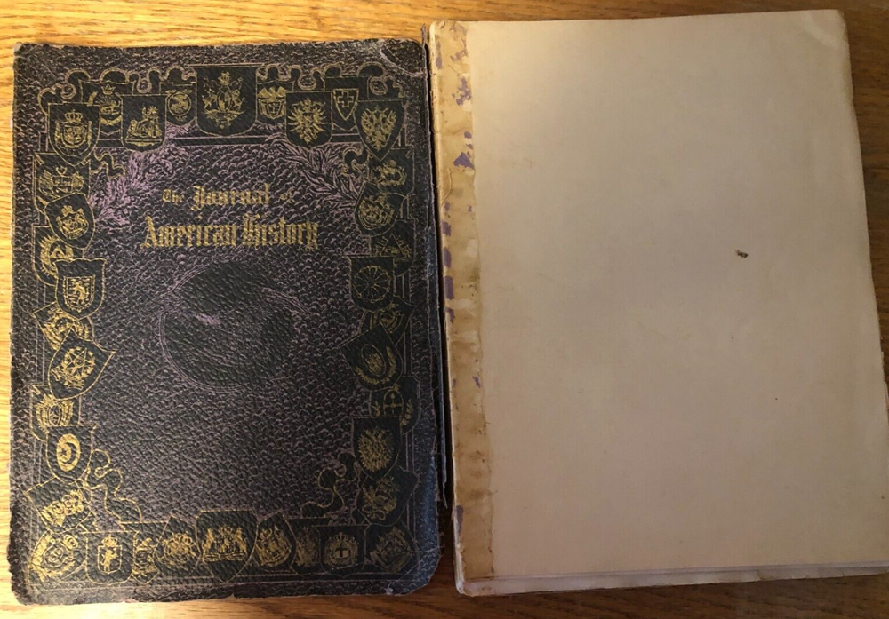 This is a wonderful old book of American History. This is the 1908 Journal of American History. Edited by Francis Trevelyan Miller. Volume II and Number IV. A Leather covered book that is about 8 inches by 11 inches. The front cover is torn off. It is in one piece and readable. The entire book is in good condition. Totally intact and readable. The pages of the sewn together sections are actually different lengths. The front page is a coat of arms for the Van Rensselaer Family with onion skin cover. American Flag with onion skin cover and poem. Index in front. The page numbers start at 535 and go to 716 with a lengthy index in back. Amazing historical facts. Engravings and Illustrations. Thanks for LOOKING at all of my Auction Listings! The High Bidder pays Postage Fees. Payment is due within 3 days of auction ending unless prior arrangements are made. I package every item I sell very carefully. Packages are mailed within one business day and quite often the same day. I will combine items to save on postage. Cost will be determined by actual weight. I try to describe every item that I sell honestly, accurately and thoroughly. I am happy to answer any questions. I offer no returns or refunds unless an item is significantly misrepresented or different than described.